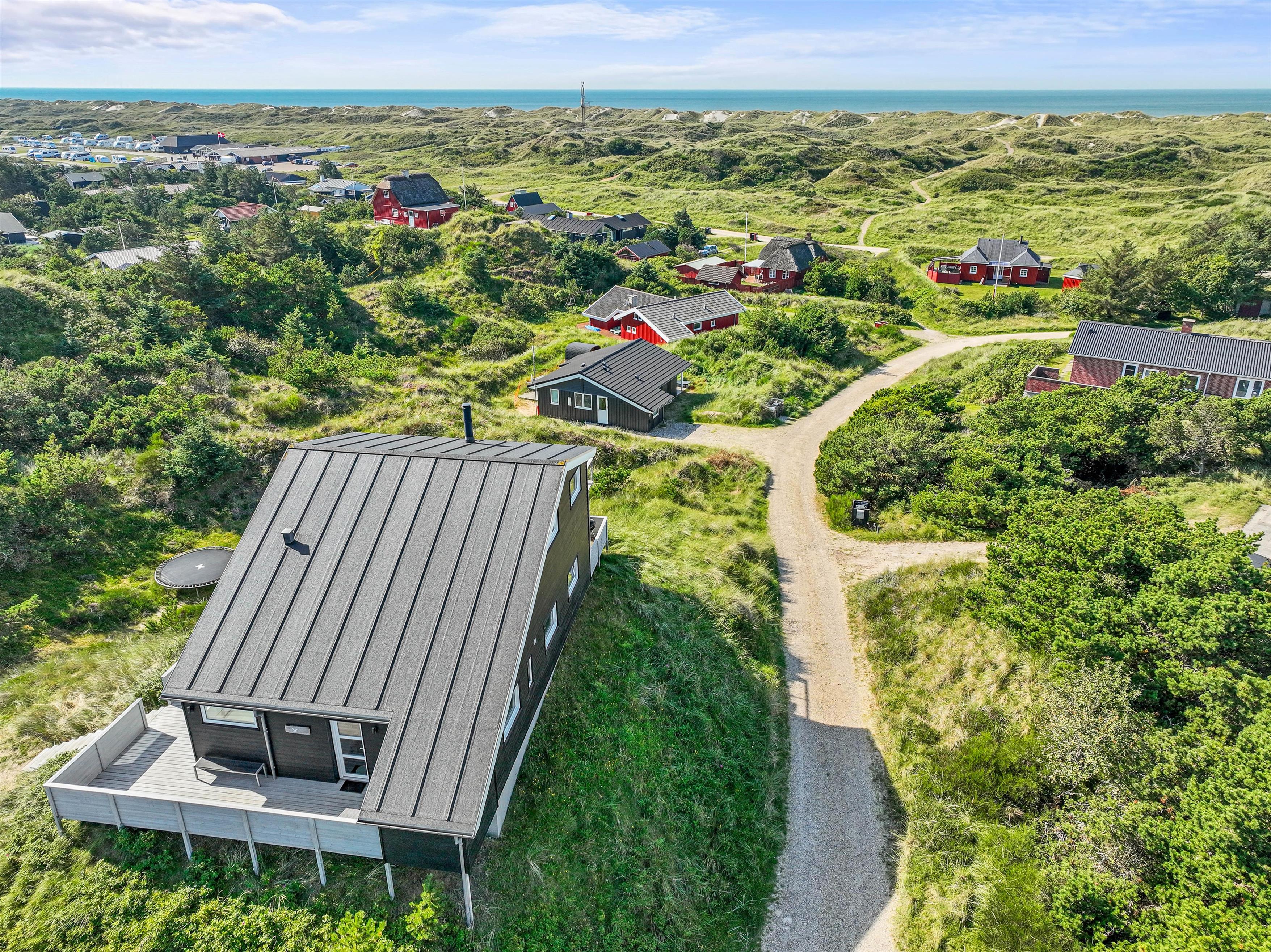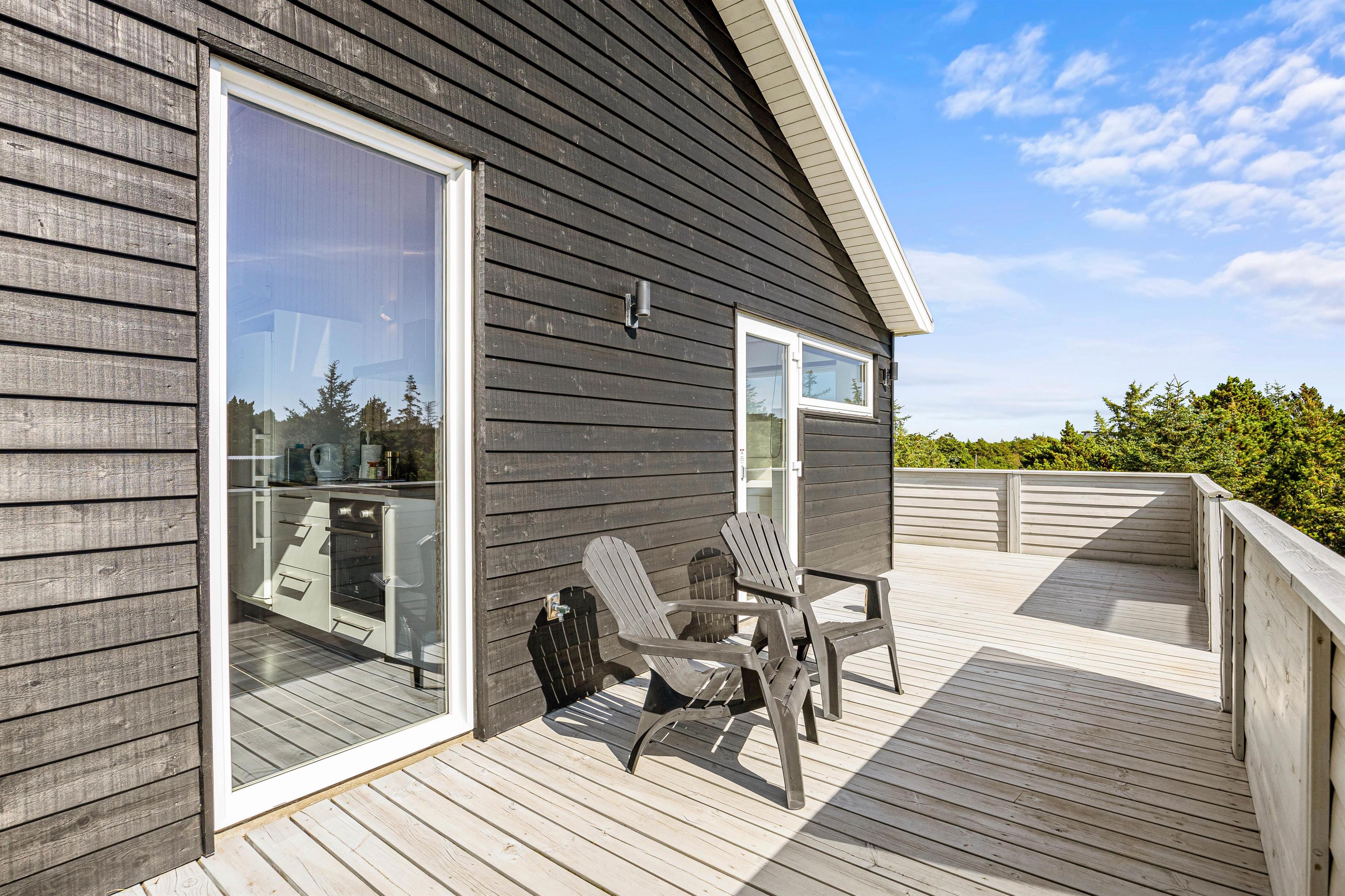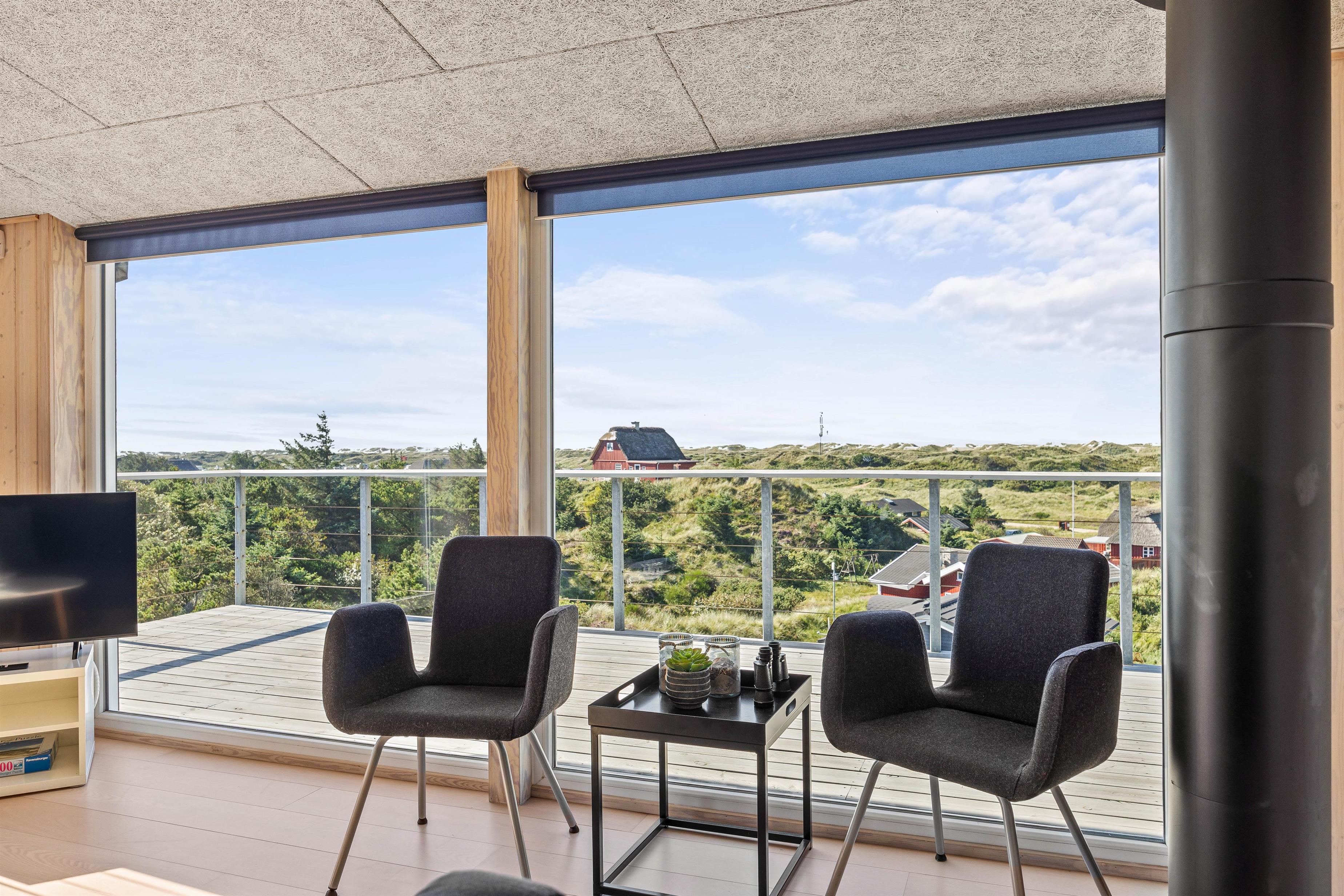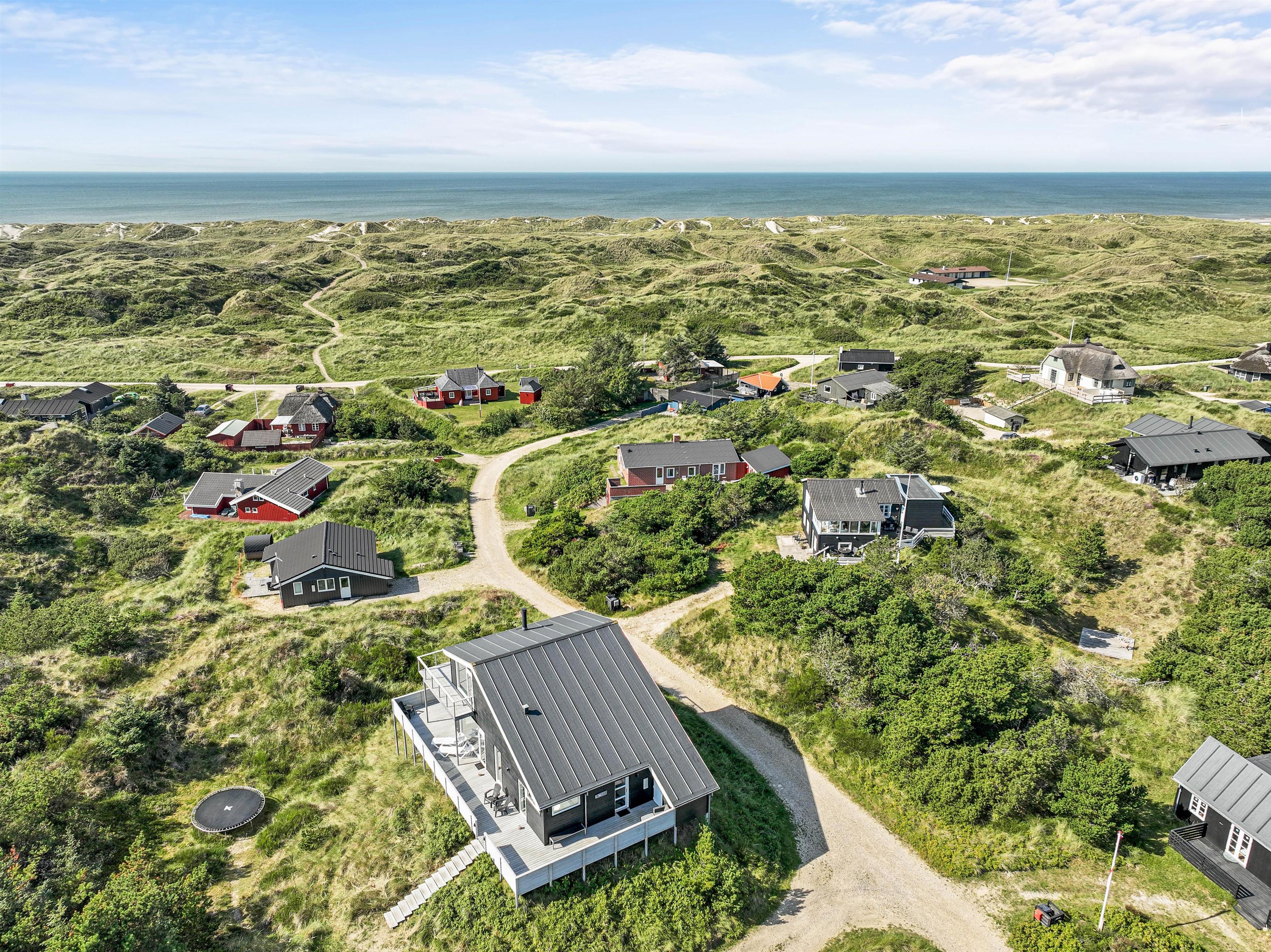 På begge etager er der udgang til store terrasser, med dejlige havemøbler og flere siddegrupper, så I altid kan finde enten skygge eller sol. Her er alle muligheder for at sidde og koble af, mens I nyder freden og panoramaudsigten over klitlandskabet. Grillen står klar, hvis aftensmaden skal tilberedes udenfor, mens I nyder et godt glas vin.