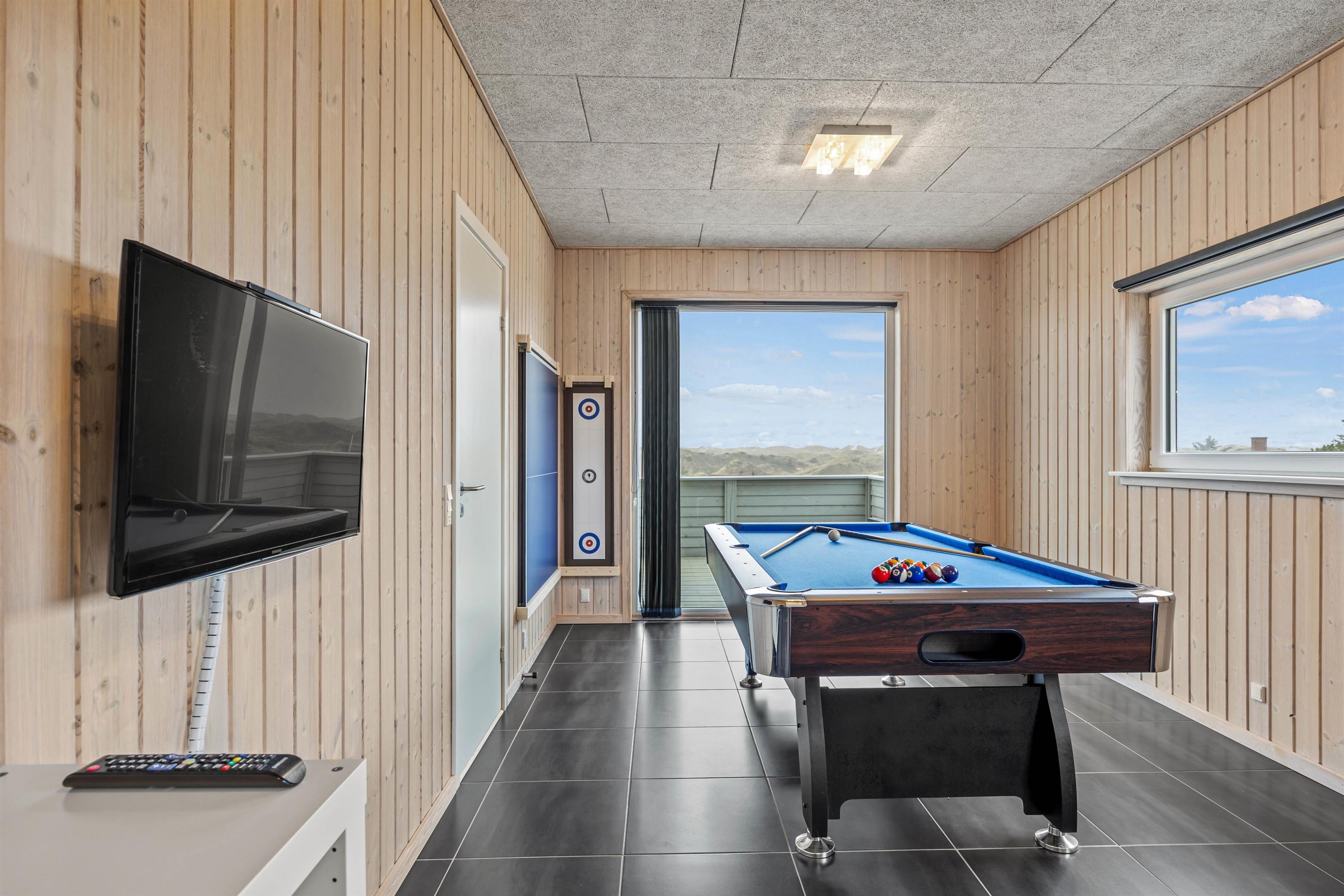 Desuden er der et aktivitetsrum med billardbord, TV og en dobbeltseng. På førstesalen ligger husets samlingsrum, nemlig stuen med TV og den flotte panoramaudsigt samt de to sidste soveværelser.