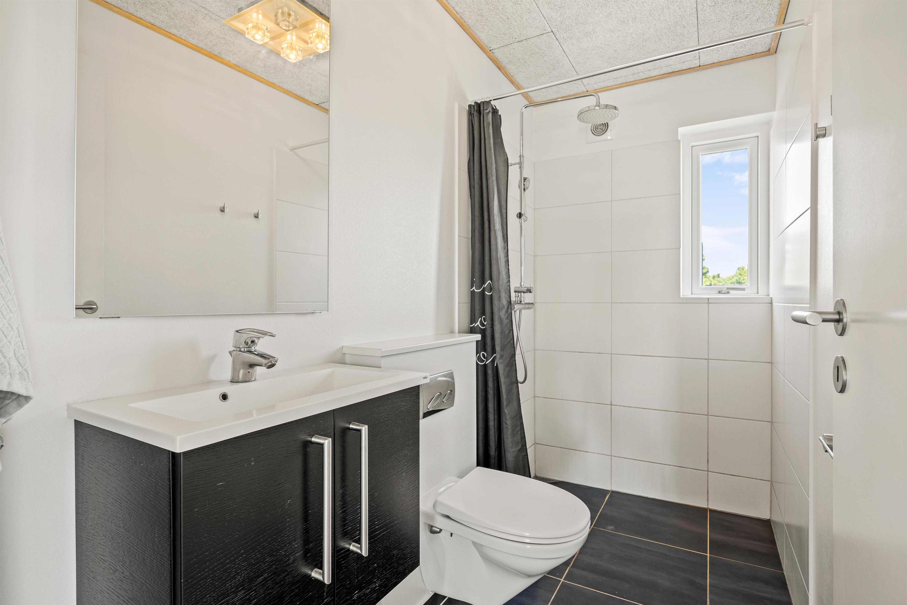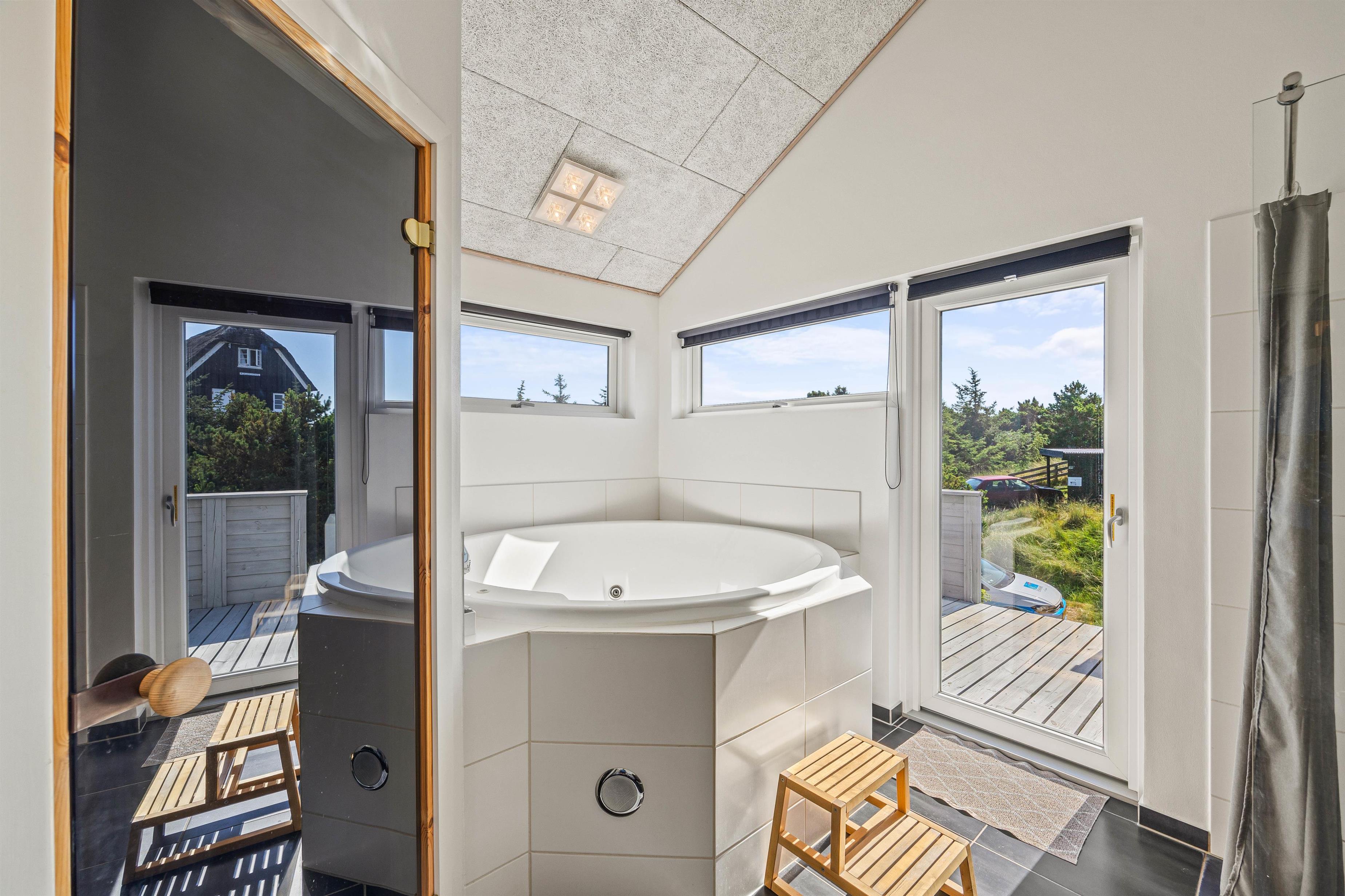 Feriehuset på Rylevej 25 er 138 m2 stort og ligger på en skrå klitgrund med trappe op til den nederste terrasse og indgangsdøren. I den store gang er der god plads til både overtøj og travesko, efter den raske travetur, og herfra er der adgang til de to badeværelser, og det ene soveværelse med dobbeltseng. Badeværelserne er begge moderne og velindrettede med gulvvarme, og det ene indeholder også både spa og sauna, så der er alle muligheder for en afslappende wellnessdag.