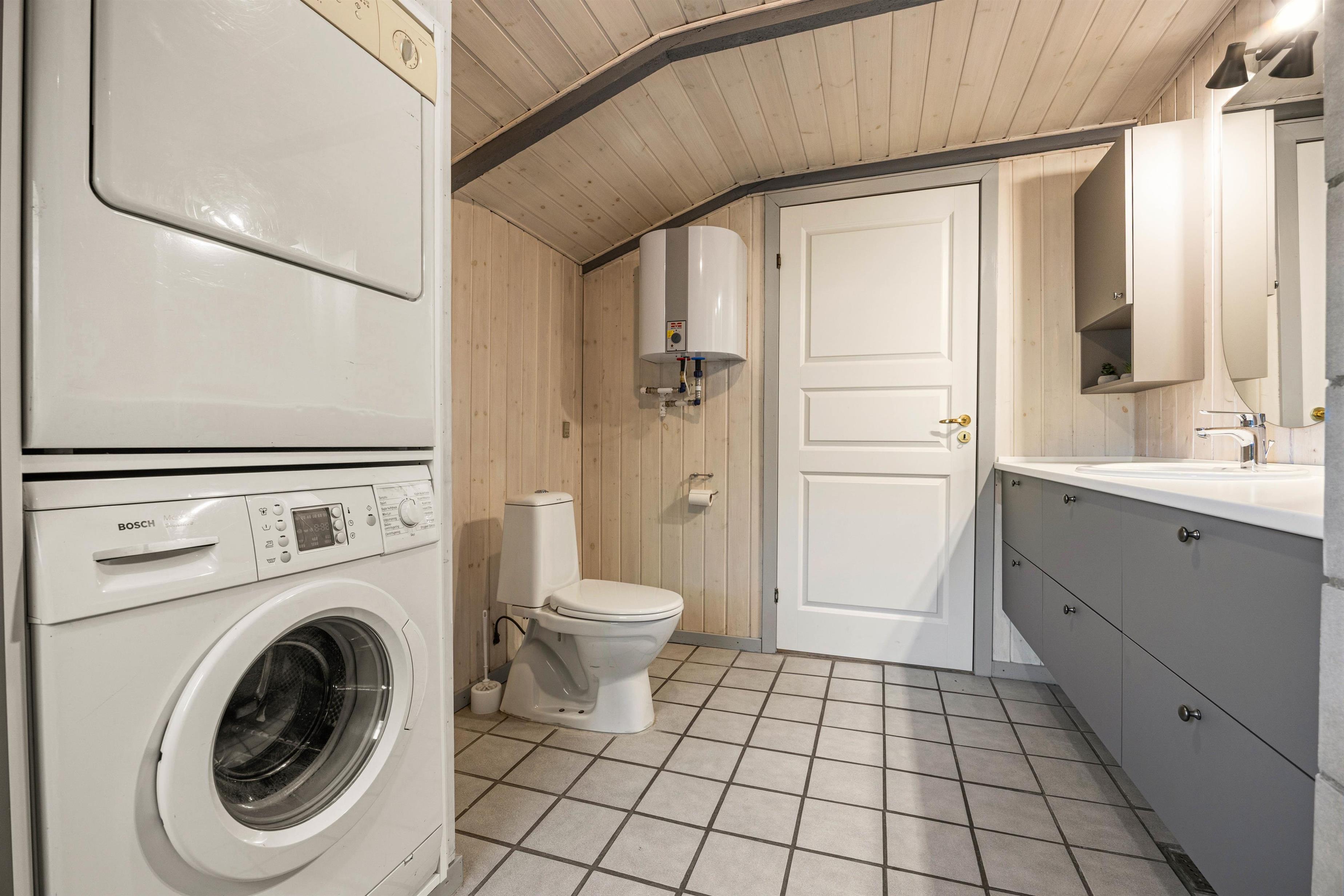 Hele opholdsafdelingen har lyst klinkegulv med gulvvarme. Fra TV-afdelingen kan I gå ud på den indhegnede fliseterrasse. Brug den energivenlige varmepumpe, til at regulere varmen.