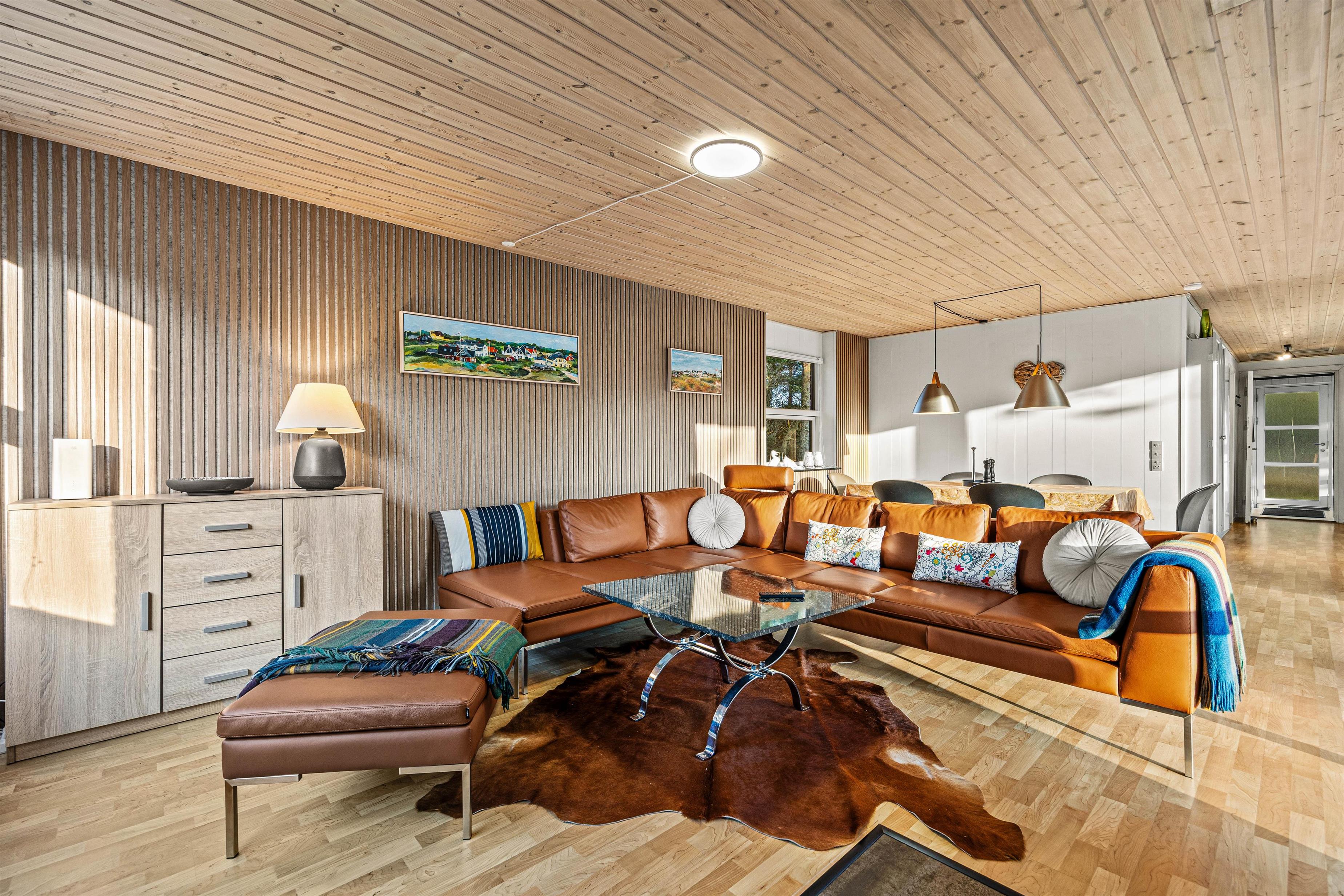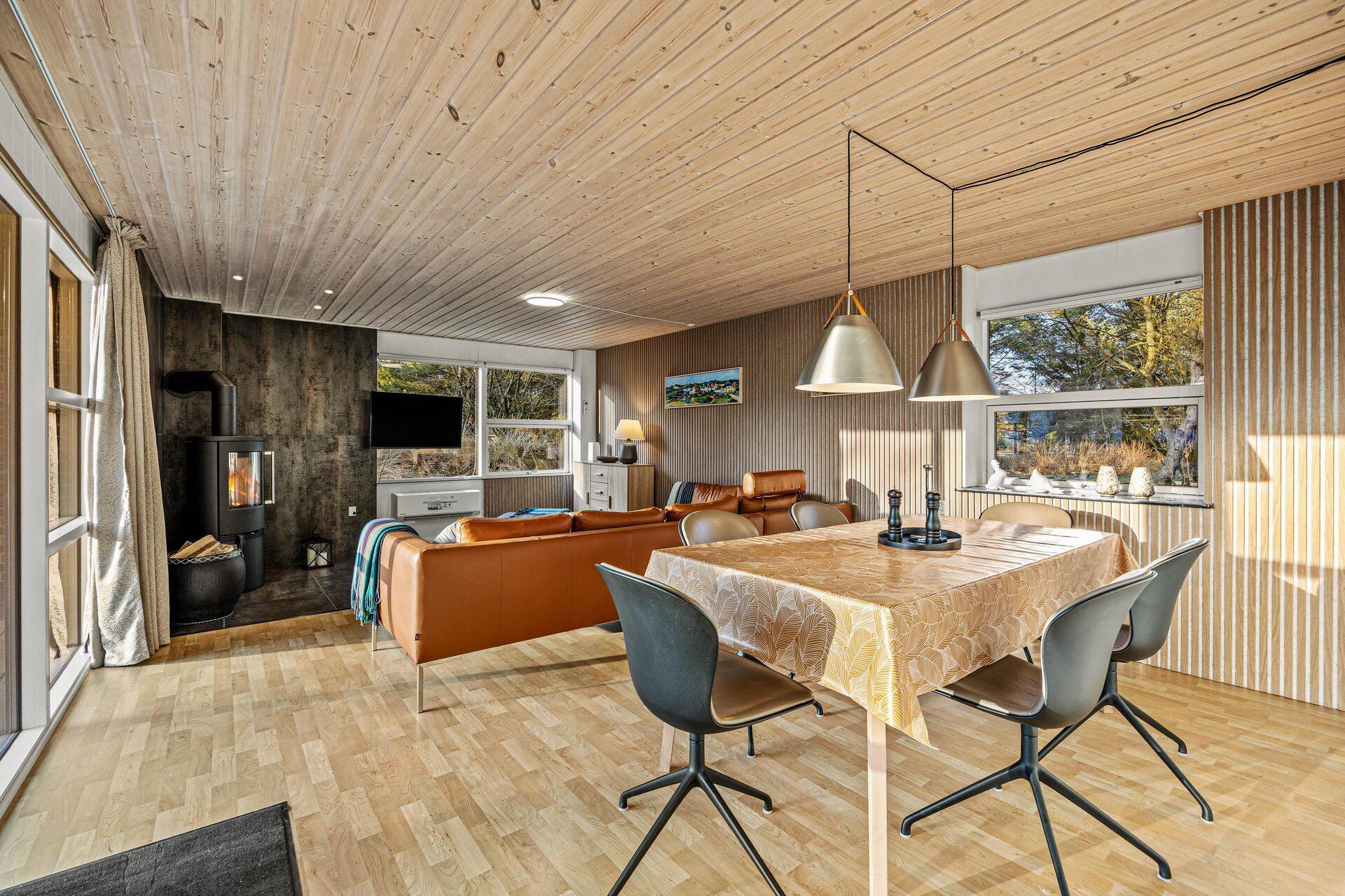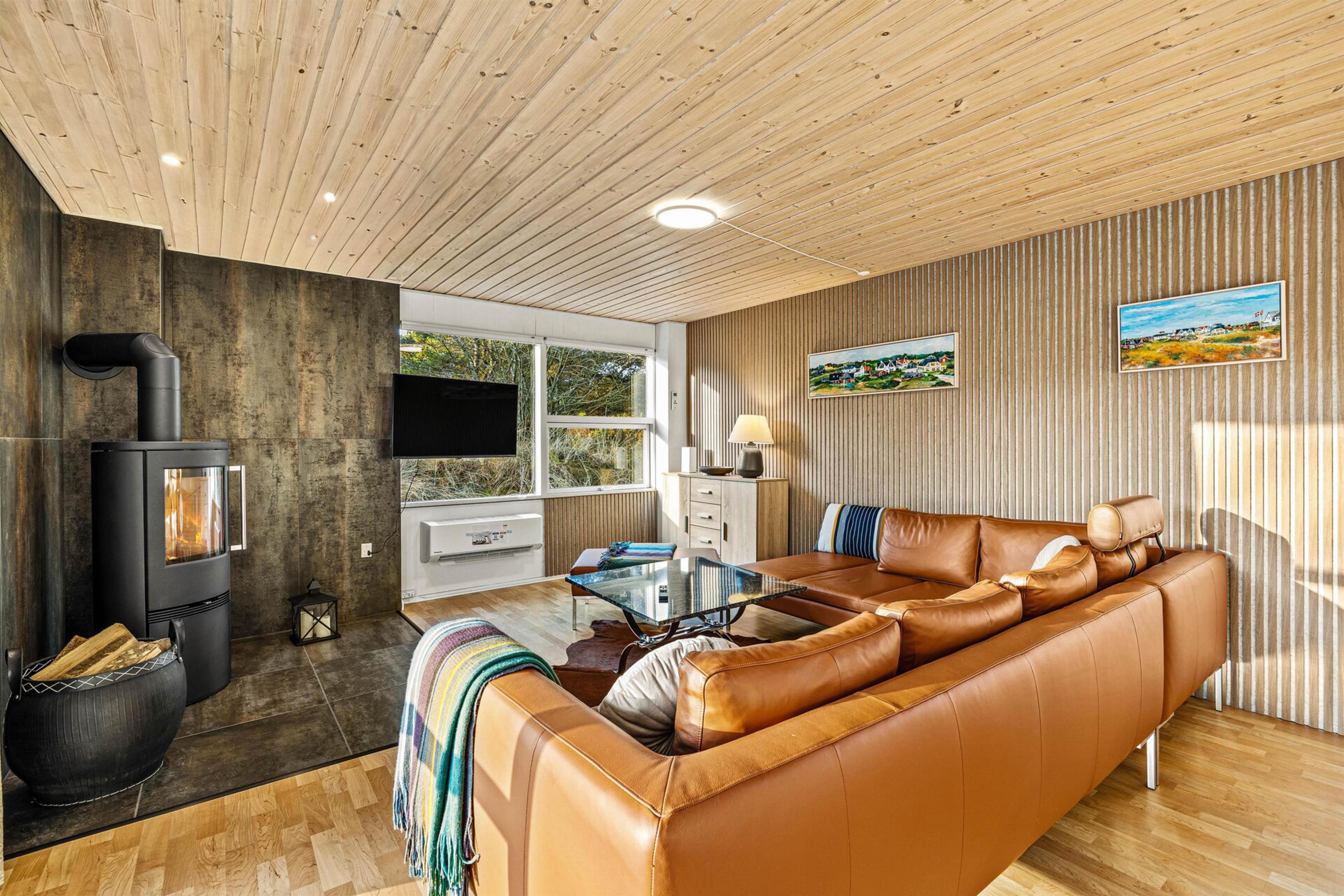 Stuen ligger i forlængelse af køkkenet og er indrettet med brændeovn og en luft-til-luft-varmepumpe, som sørger for en stabil temperatur året rundt. Her kan I samles til måltider, slappe af i sofaen eller spille kort. Det er et godt sted at være sammen, uanset om dagen har budt på udflugter eller afslapning hjemme.