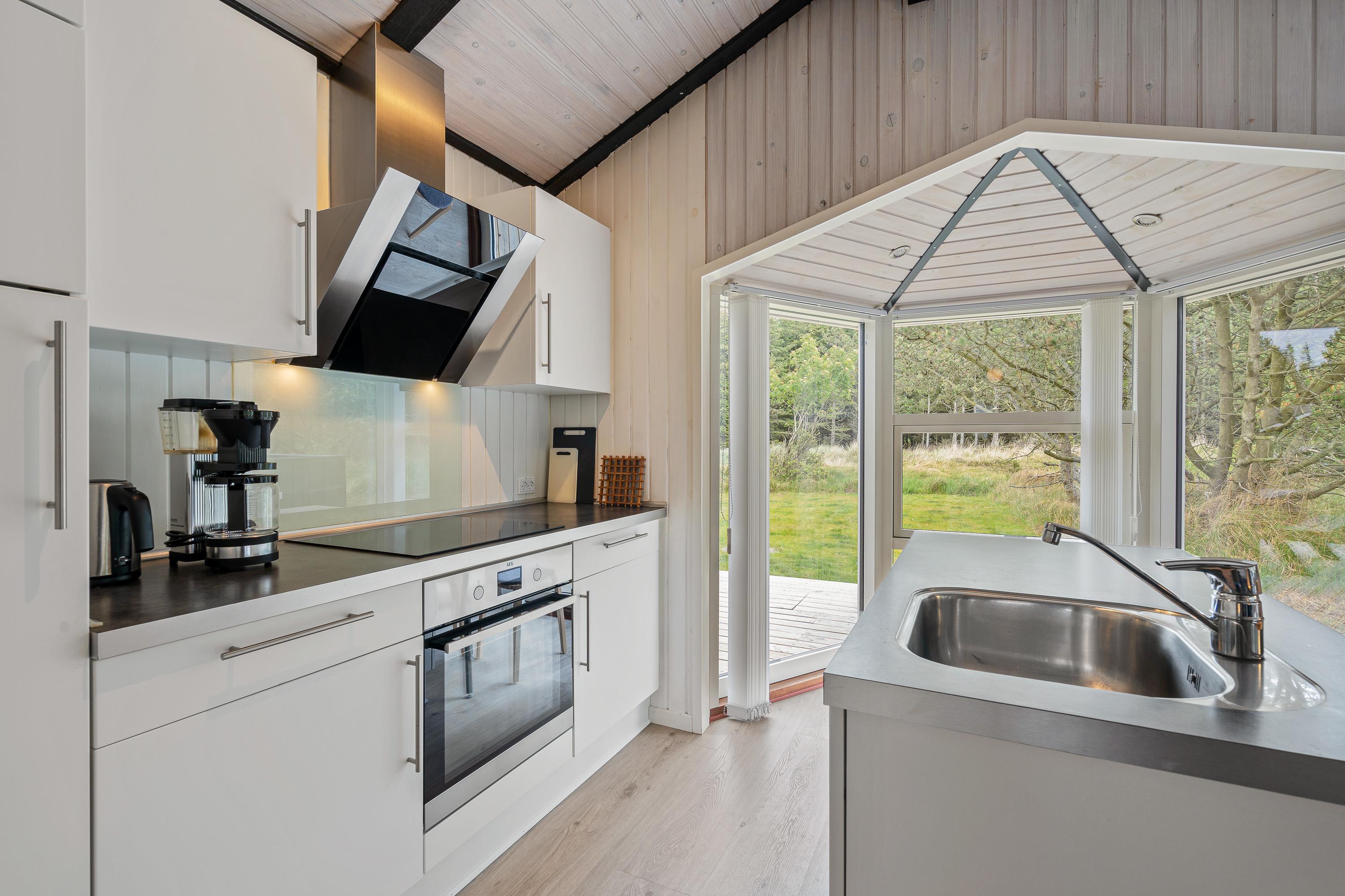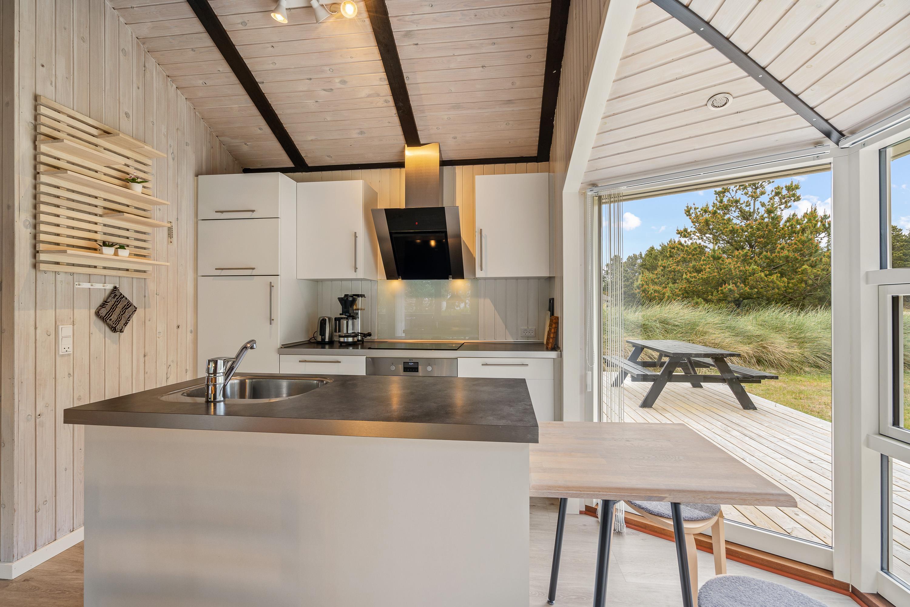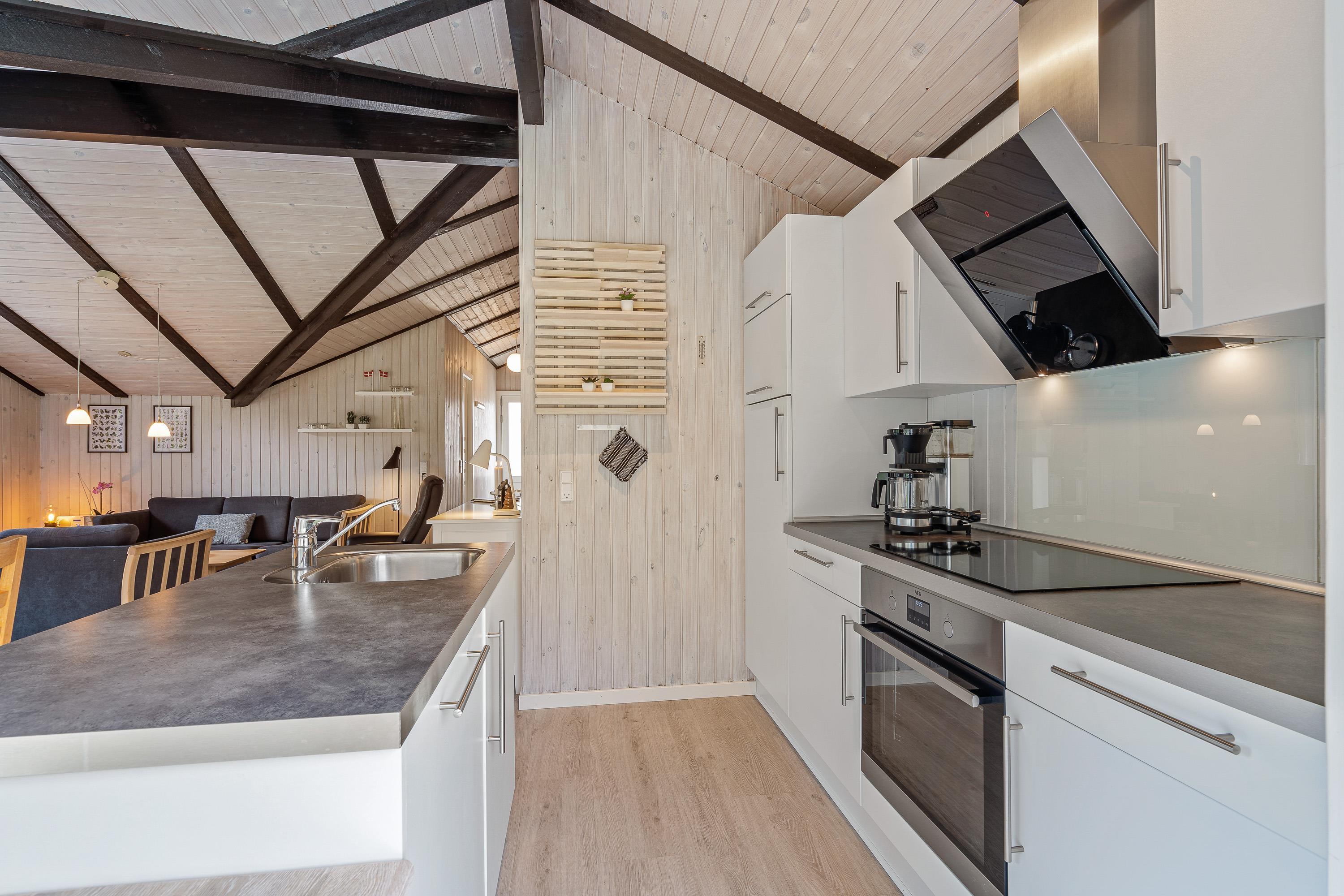 Det veludstyrede køkken ligger i åben forbindelse med stuen og spiseafdelingen og er hyggeligt indrettet med lyse farver og højt til loftet. Her er de perfekte rammer for en ferie med masser af kvalitetstid med de nærmeste.