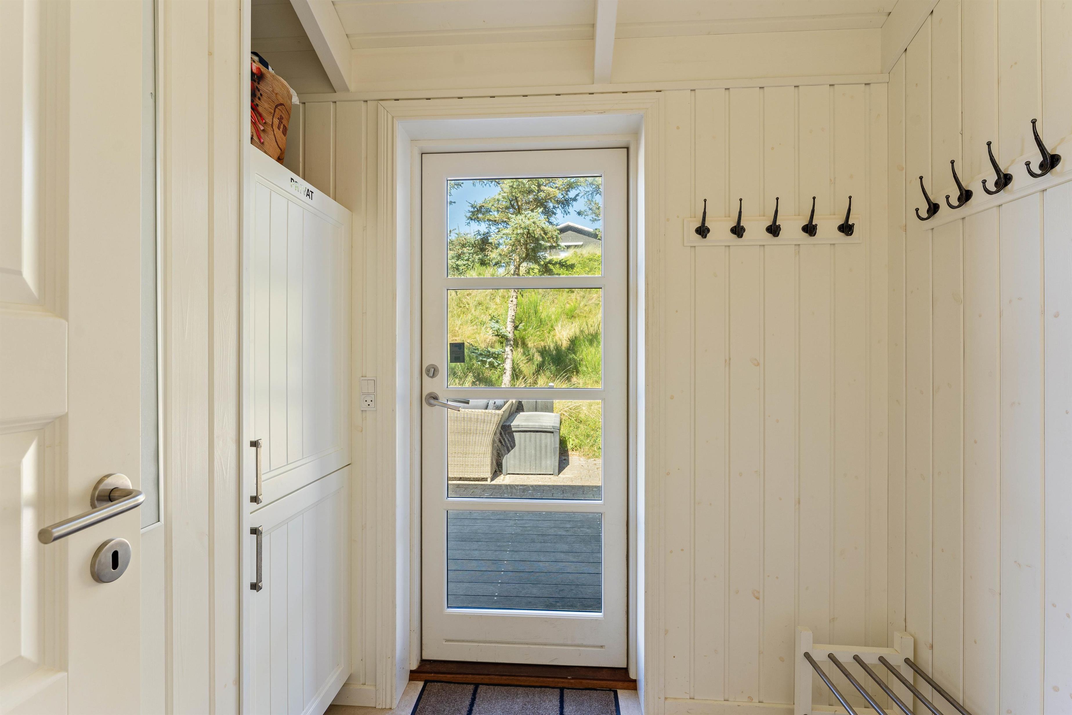 Huset ligger på en dejlig lyst naturgrund, der er omsluttet og beskyttet af klitter, lave træer og buske. Rundt om huset har I terrasser og især på sydvest-terrassen, der er afskærmet, kan I allerede i det tidlige forår sidde ude og nyde de allerførste solstråler. Åben dobbeltdøren fra stuen og luk den skønne duft af salt og lyng ind. Spurvevej 2 ligger kun 300 meter fra havet, så du kan sagtens smide håndklædet over skulderen og smutte ned over klitten til en morgendukkert før morgenmaden. Eller hvad med en frisk efterårs- eller vinterdukkert med efterfølgende opvarmning i saunaen?