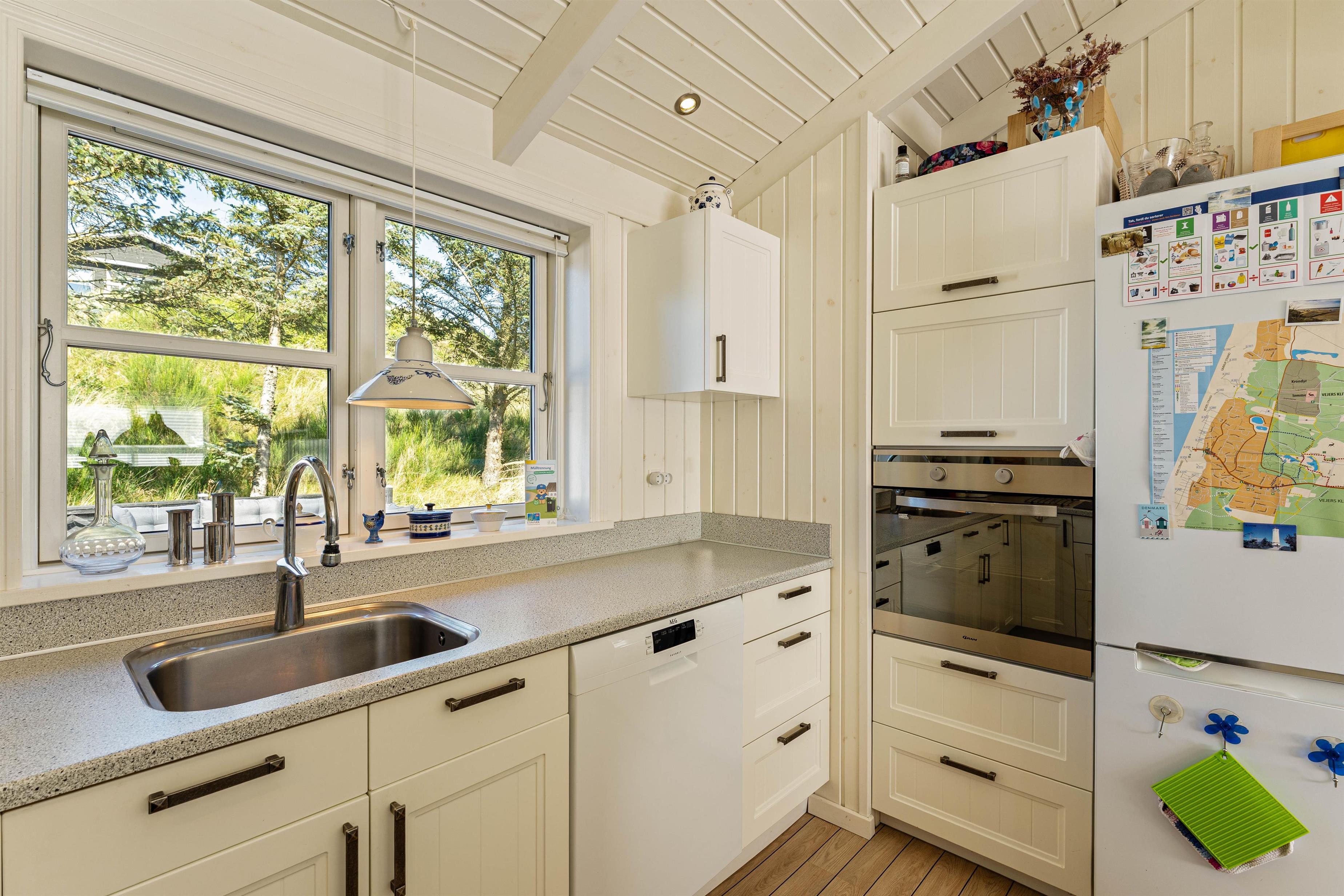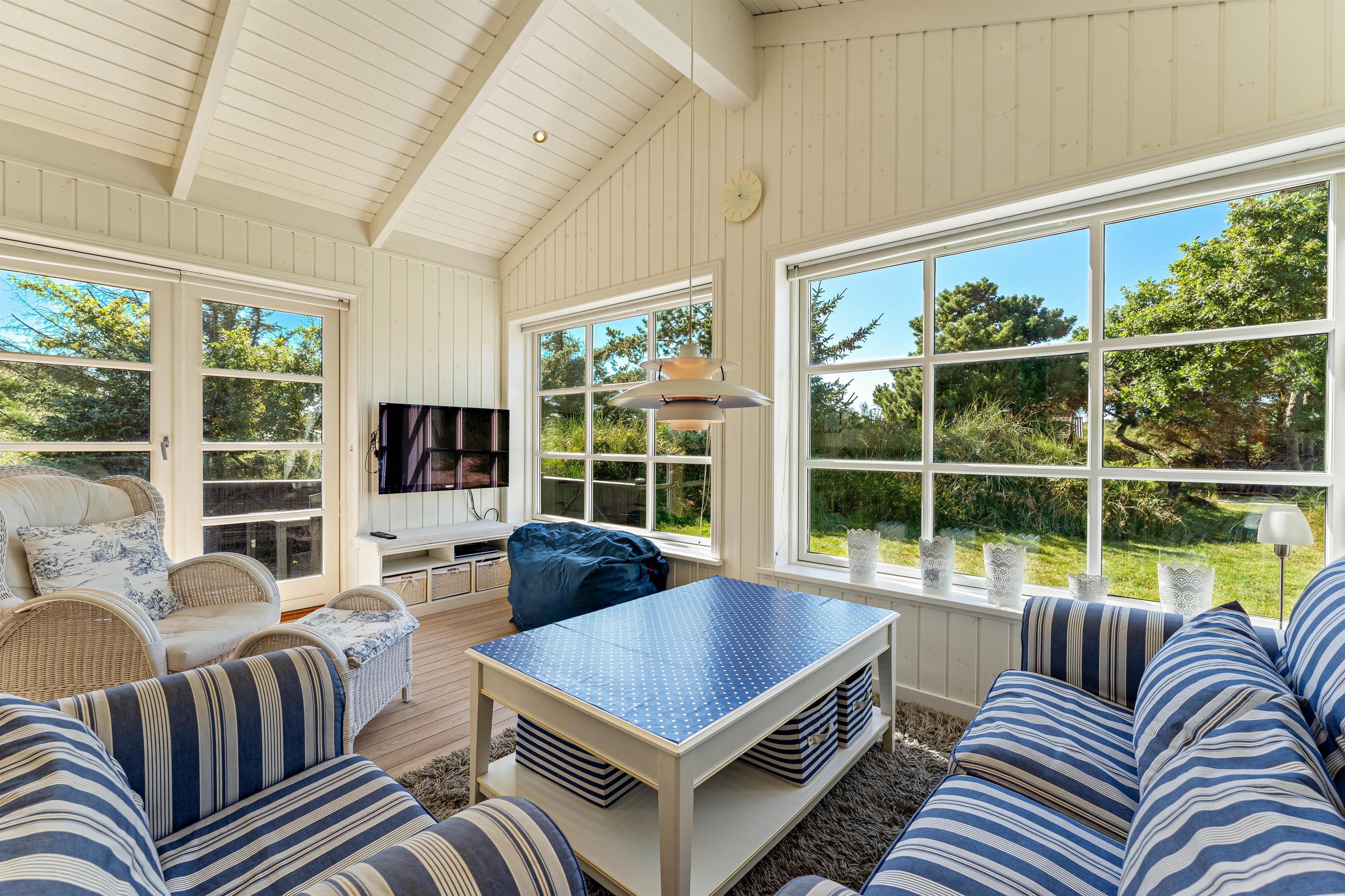 Her vil I helt sikkert føle jer godt tilpas. De store vinduer og en havedør til terrassen sørger for masser af lysindfald til de smukke lyse rum, der er indrettet med bekvemme møbler og en super sans for ægte nordisk feriehusstemning. En brændeovn sørger især på mørke vinteraftner for en ekstra hyggelig stemning, når ilden gnister og kaster et varmt orange skær ud i rummet.