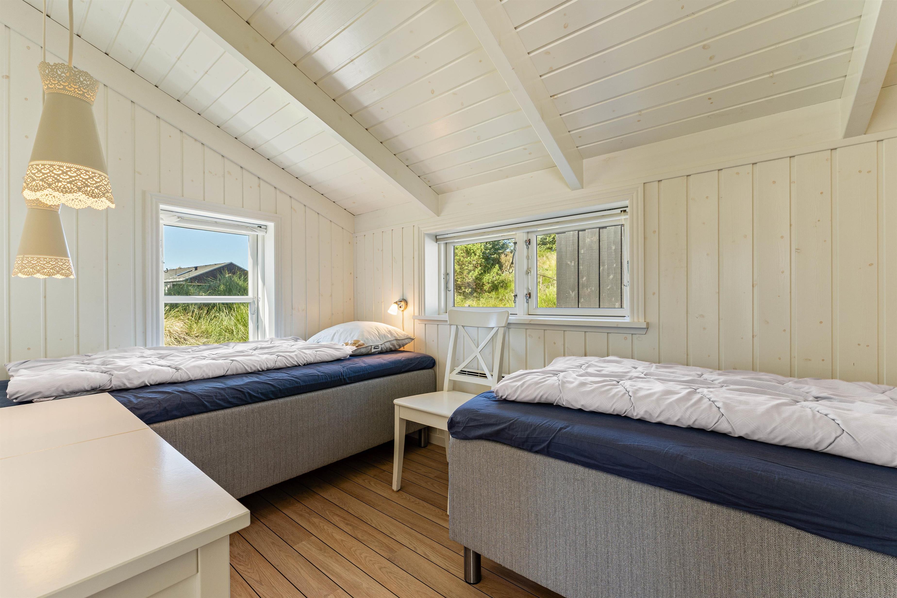 Dette 87 m2 fine hus rummer alt, der skal til for at holde en dejlig ferie. Her har I 3 gode soverum hvoraf det ene har dobbeltseng og de andre to er indrettet med enkeltsenge, et pænt badeværelse med sauna til opvarmning og hygge efter en lang dag ved Vesterhavet, og I har et gæste-wc med både vaskemaskine og tørretumbler.