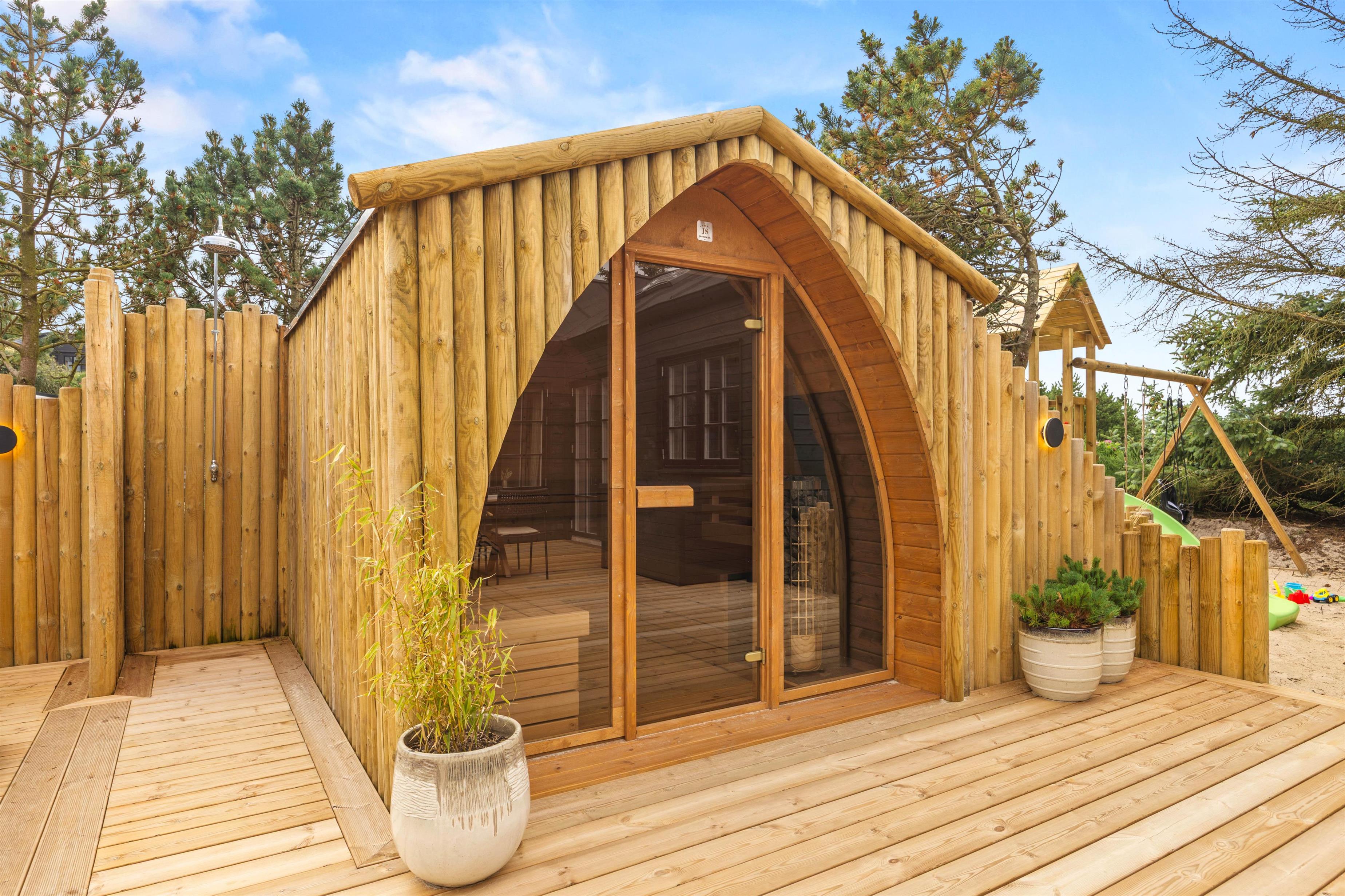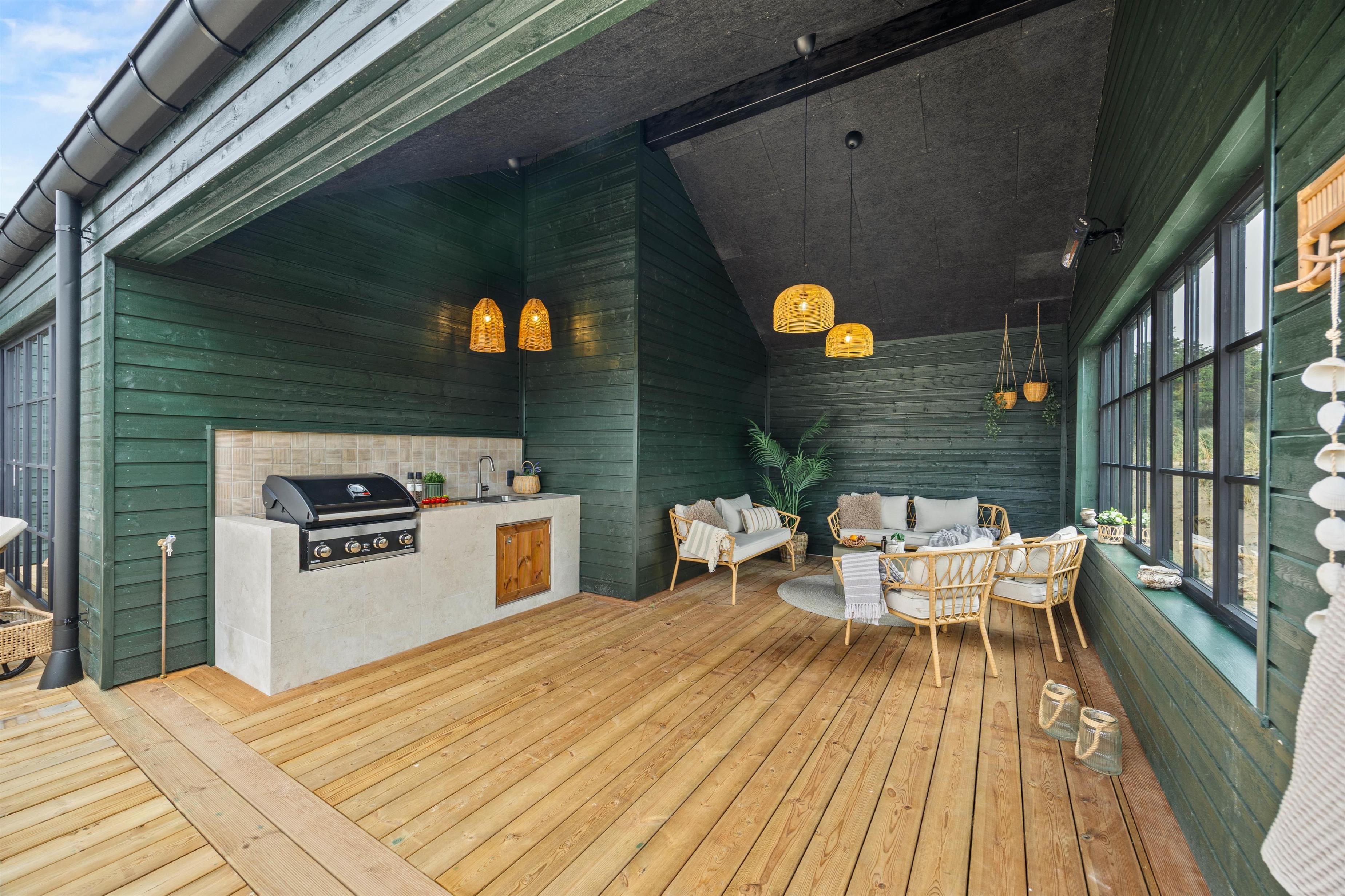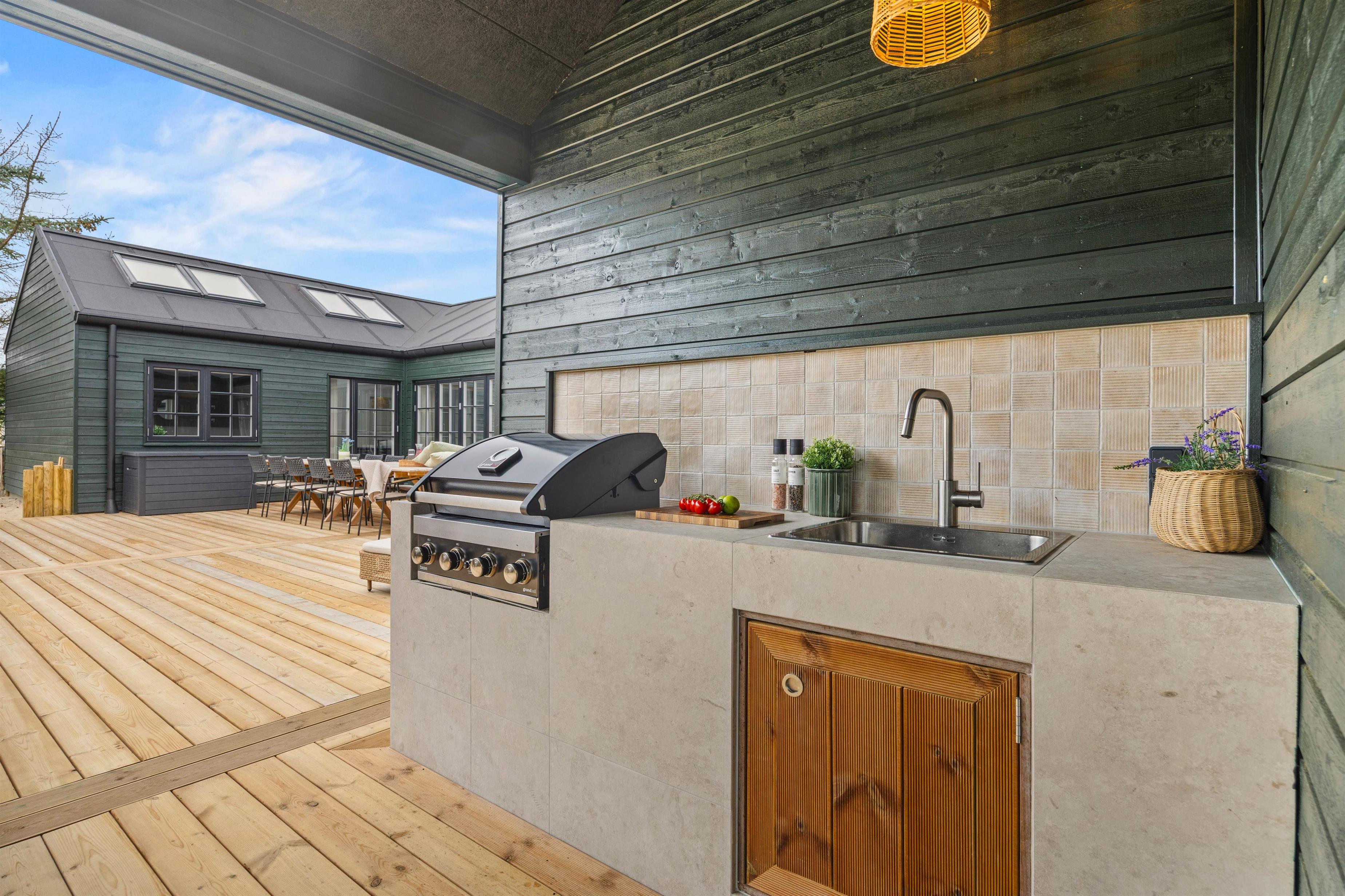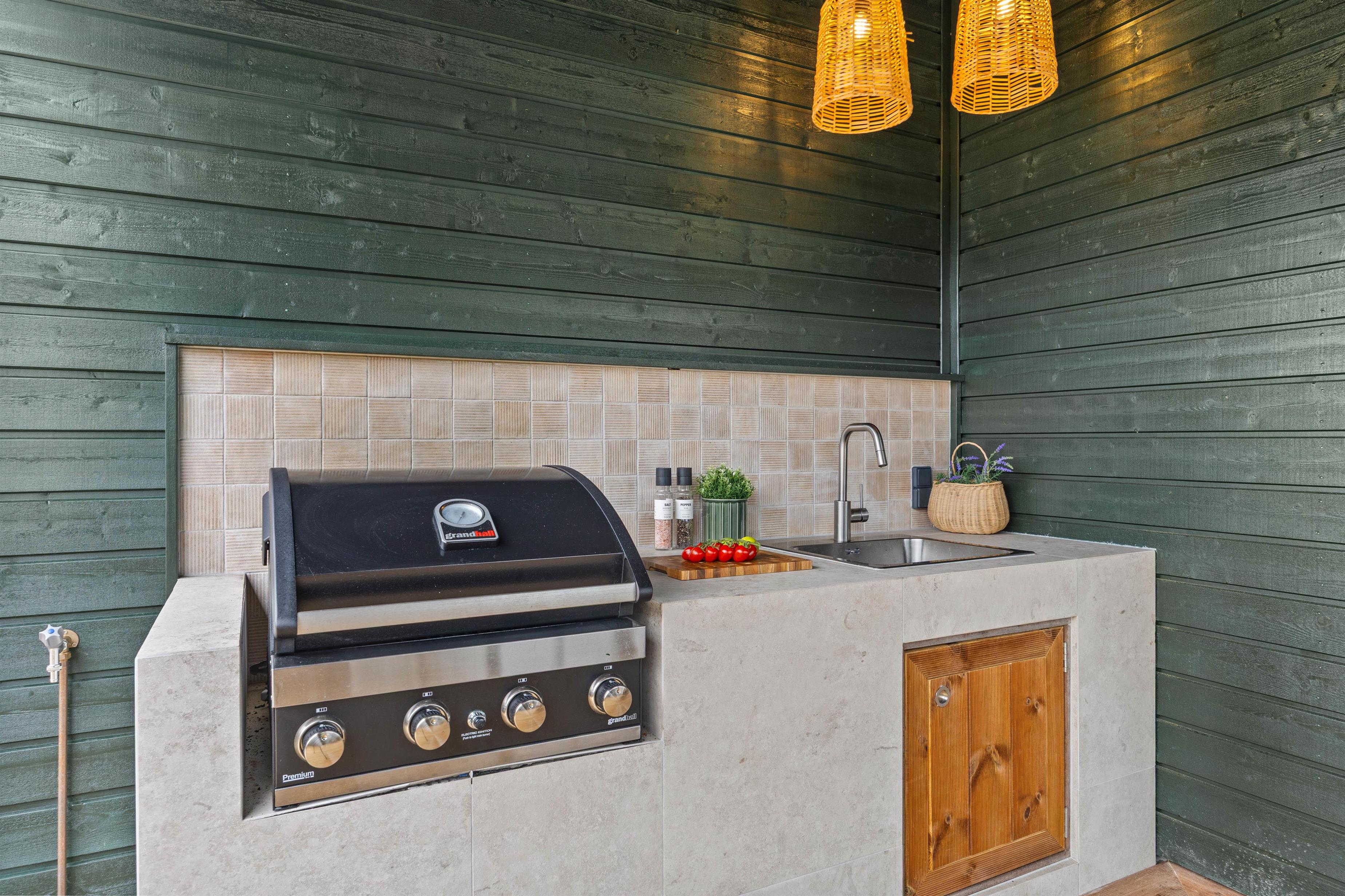 Imens kan familiens grillmester tilberede aftensmaden på gasgrillen – dét hører sig sommeren til! Nyd måltidet med et køligt glas rosé efterfulgt af en aftentur i udespaen. Se den smukke stjernehimmel og mærk de varme bobler. Udenfor finder I også udesaunaen samt udebruser – perfekt til at skylle sig mellem saunasessionerne eller efter en lang dag på stranden. Udebruseren kan benyttes fra april til november.