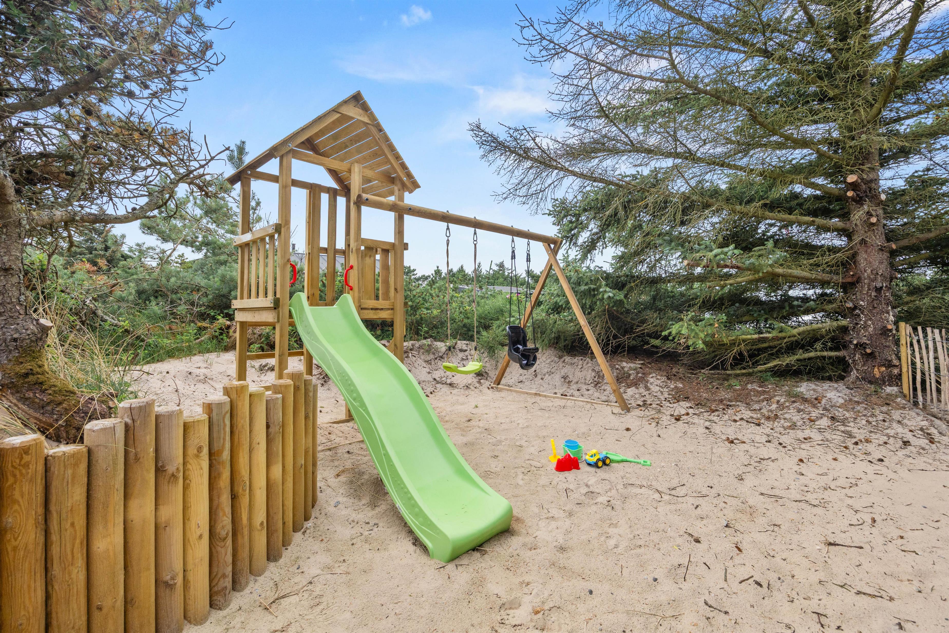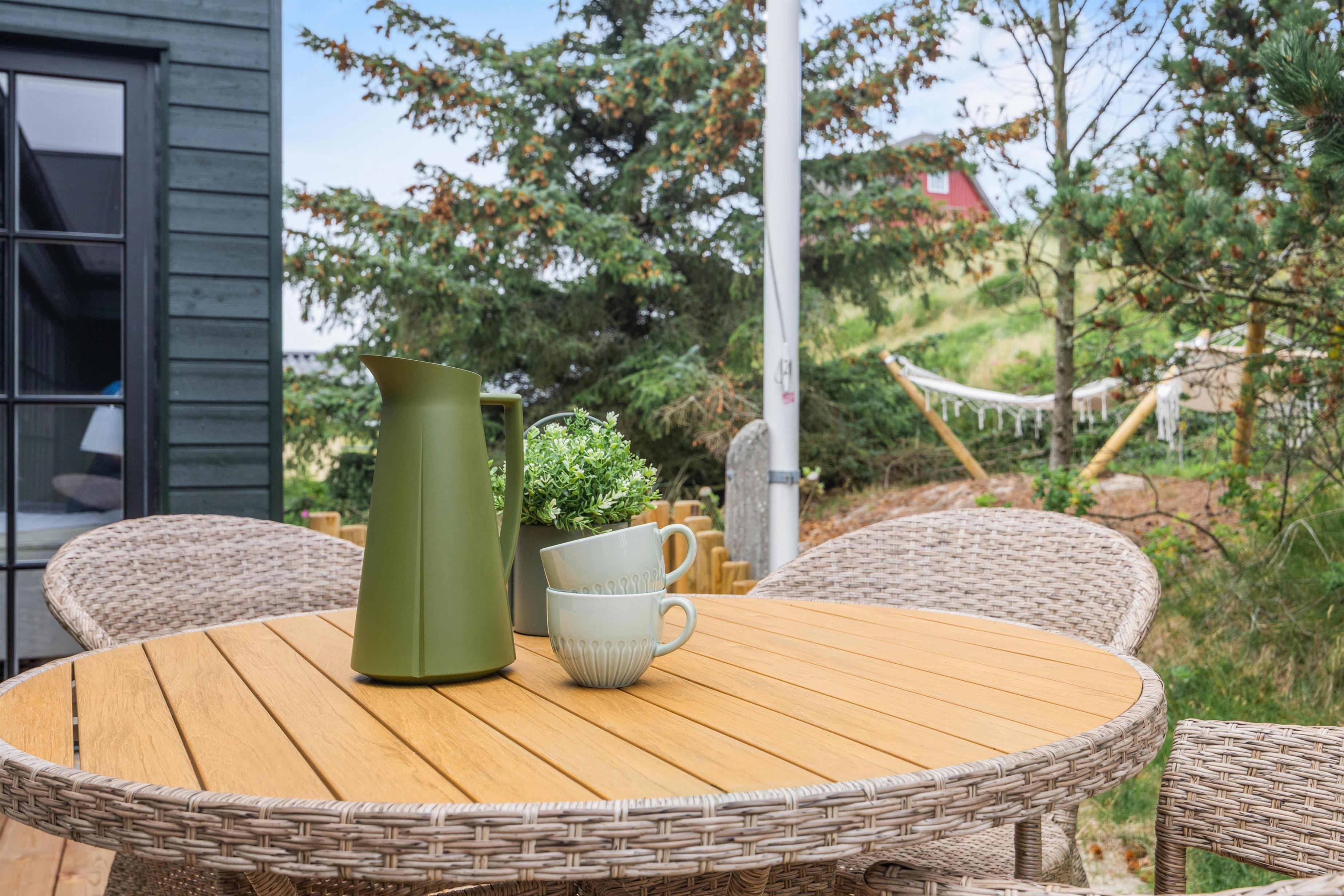 Sommerhuset har en dejlig afskærmet og overdækket terrasse med behagelige havemøbler, og her er der rig mulighed for at koble af og nyde den danske sommer. Slå benene op, læs en god bog og lad børnene lege på gyngerne og i sandkassen.