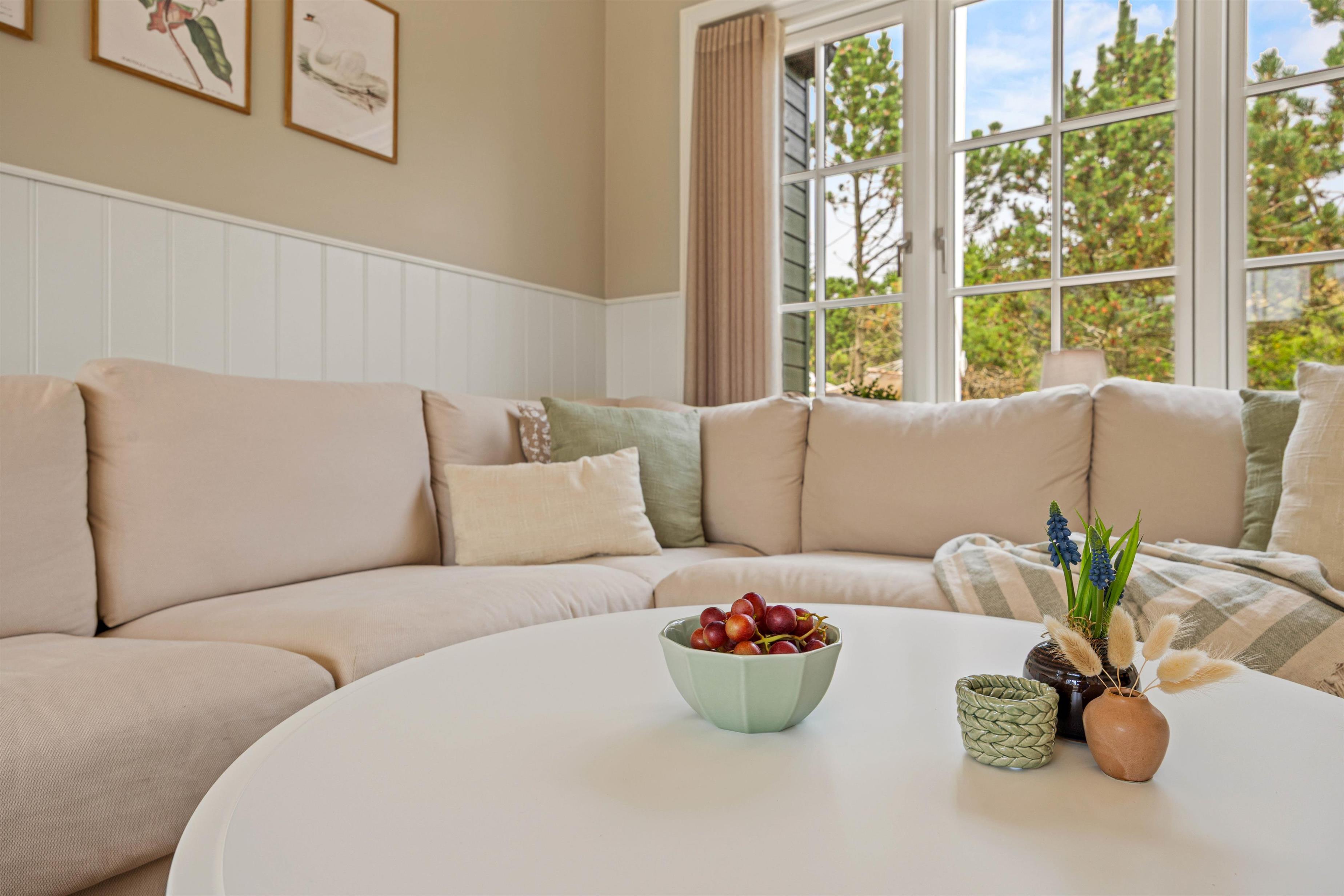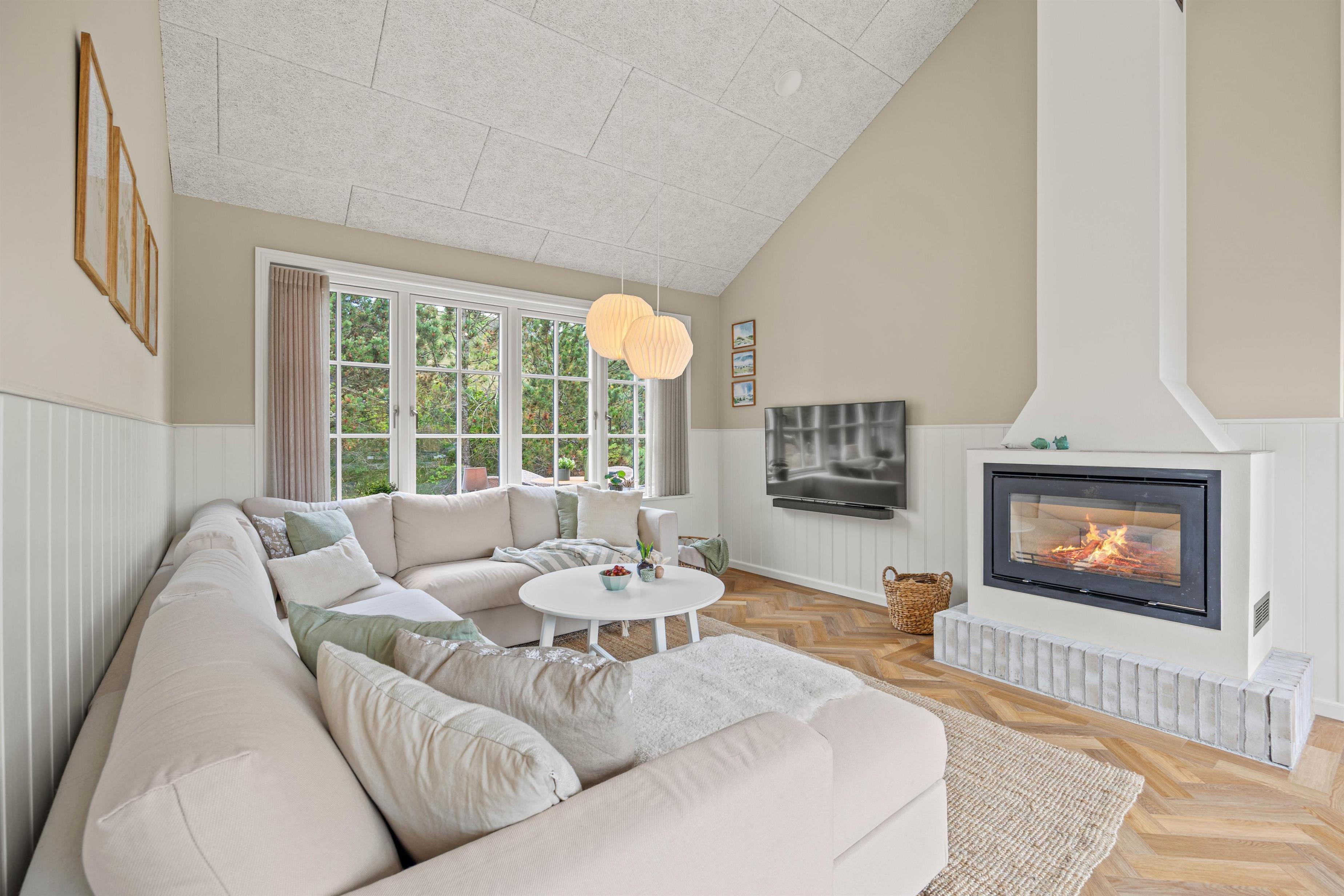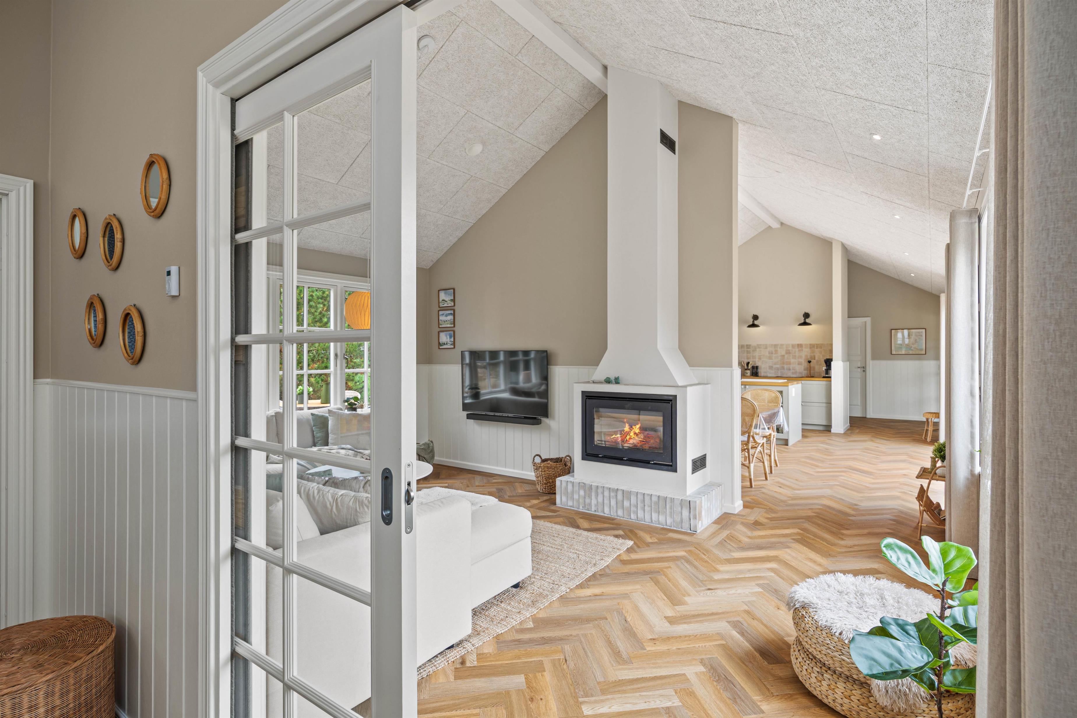 Hjerterummet er det lyse alrum, der forener stue og køkken. Her er en varm og rar atmosfære, og dagslyset strømmer gennem de mange vinduer. Her er plads til familielivet; uanset om I skal lave mad, holde spilleaften eller se en god film i fjernsynet. Med den hyggelige brændeovn er der lagt op til rigtig feriehygge – tænd op i brændeovnen efter en dejlig vandretur i den skønne natur eller smid jer i sofaen med en god krimi og et glas vin. Endvidere byder sommerhuset på en energibesparende varmepumpe samt alle hverdagens hjælpere herunder vaskemaskine og tørretumbler.