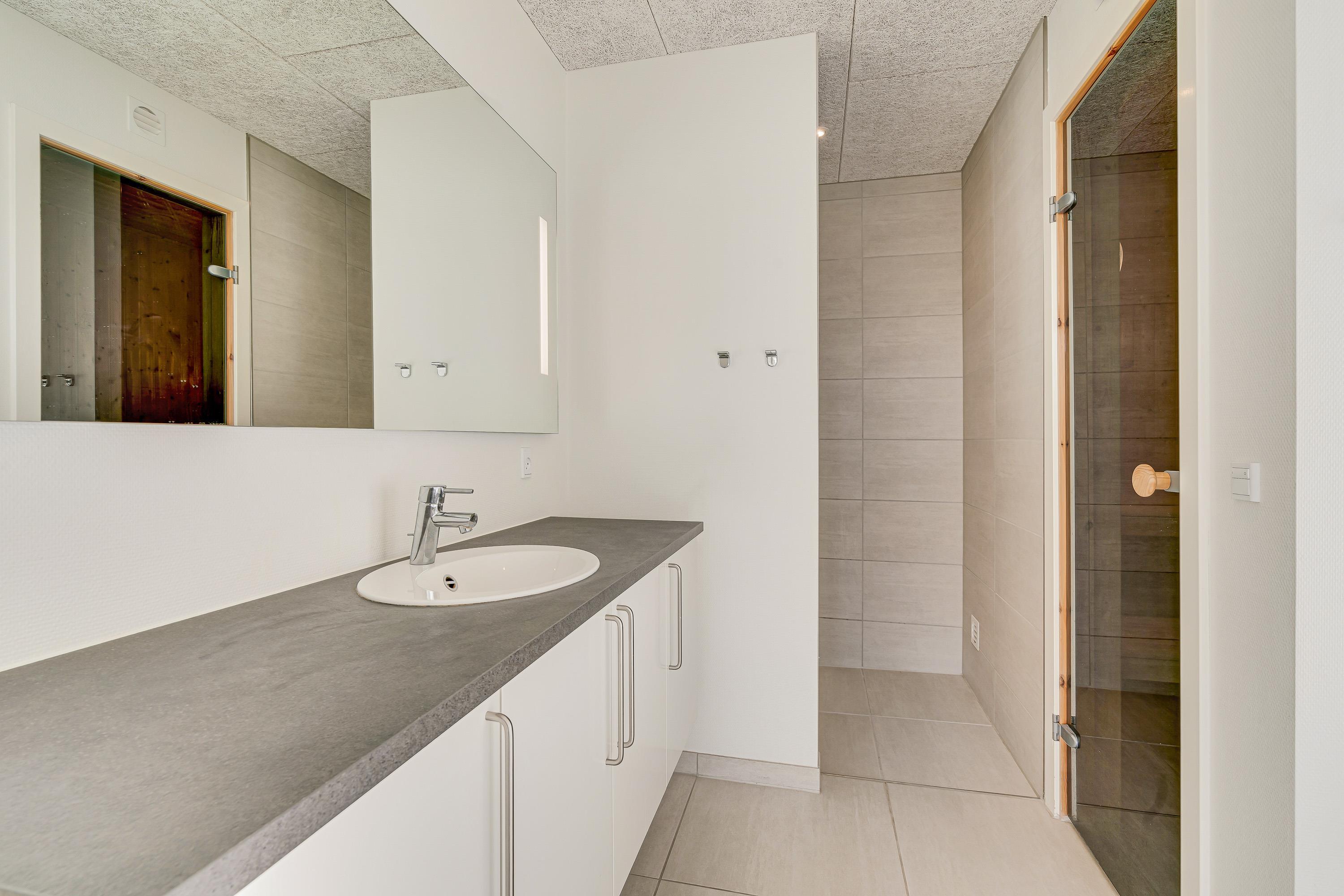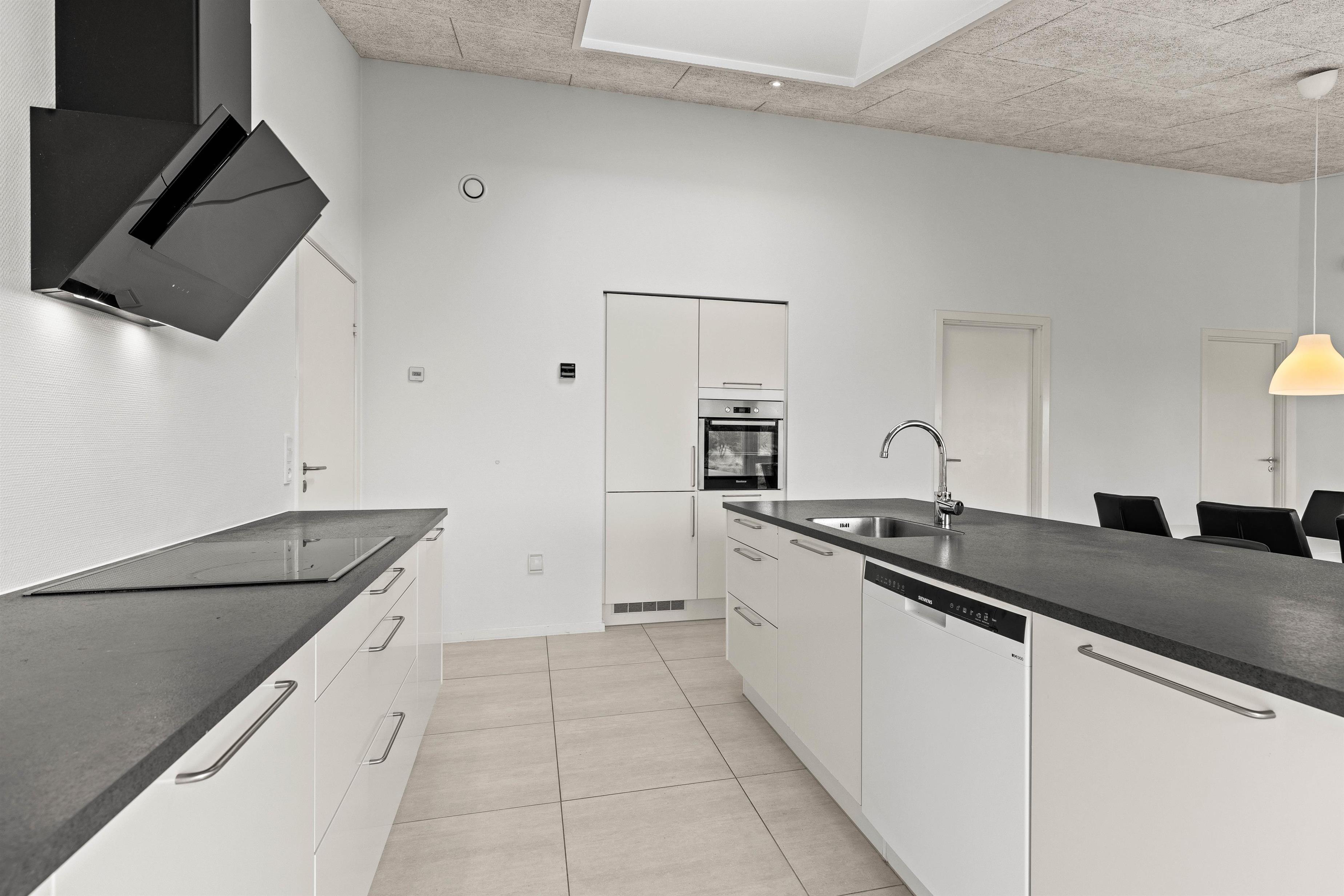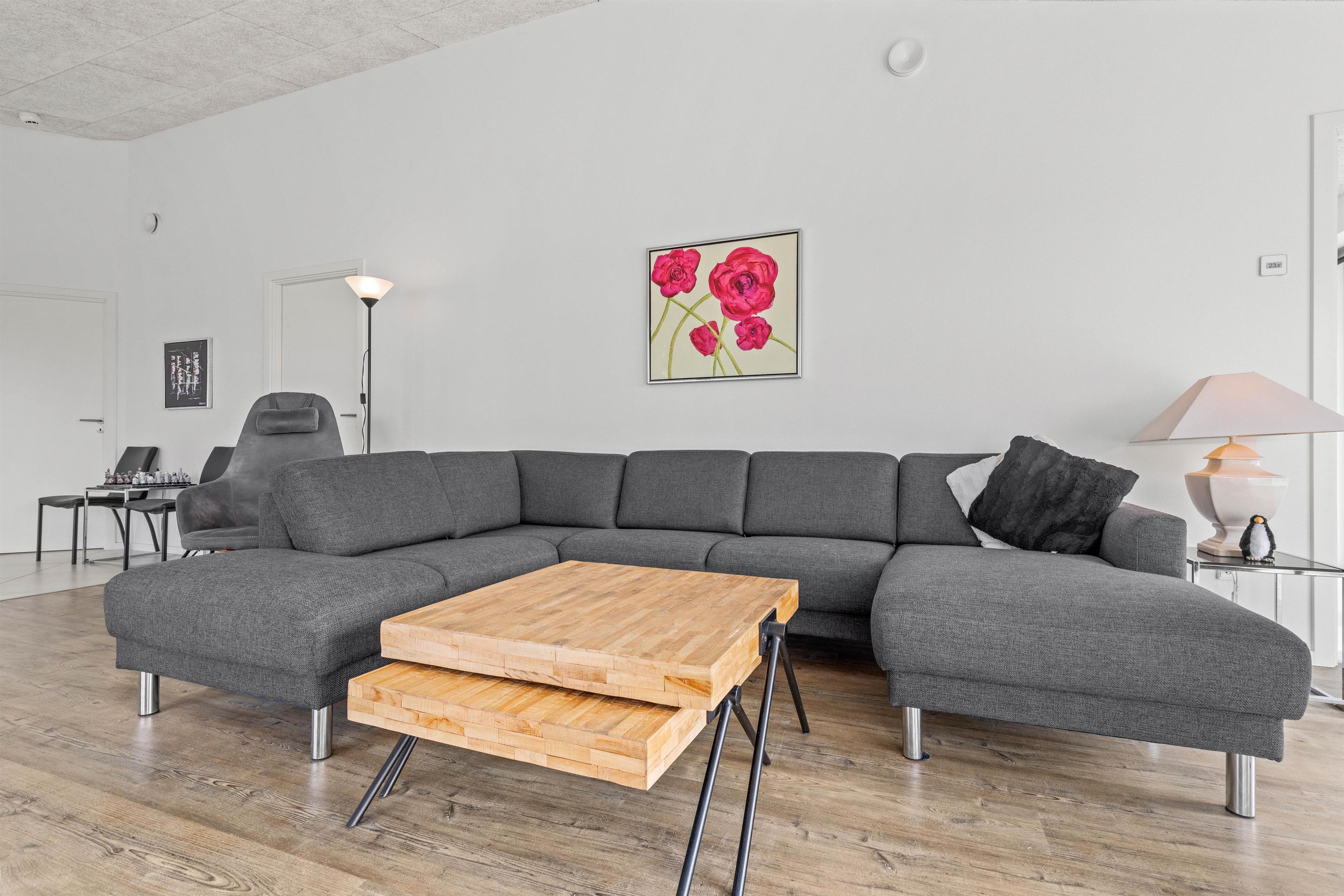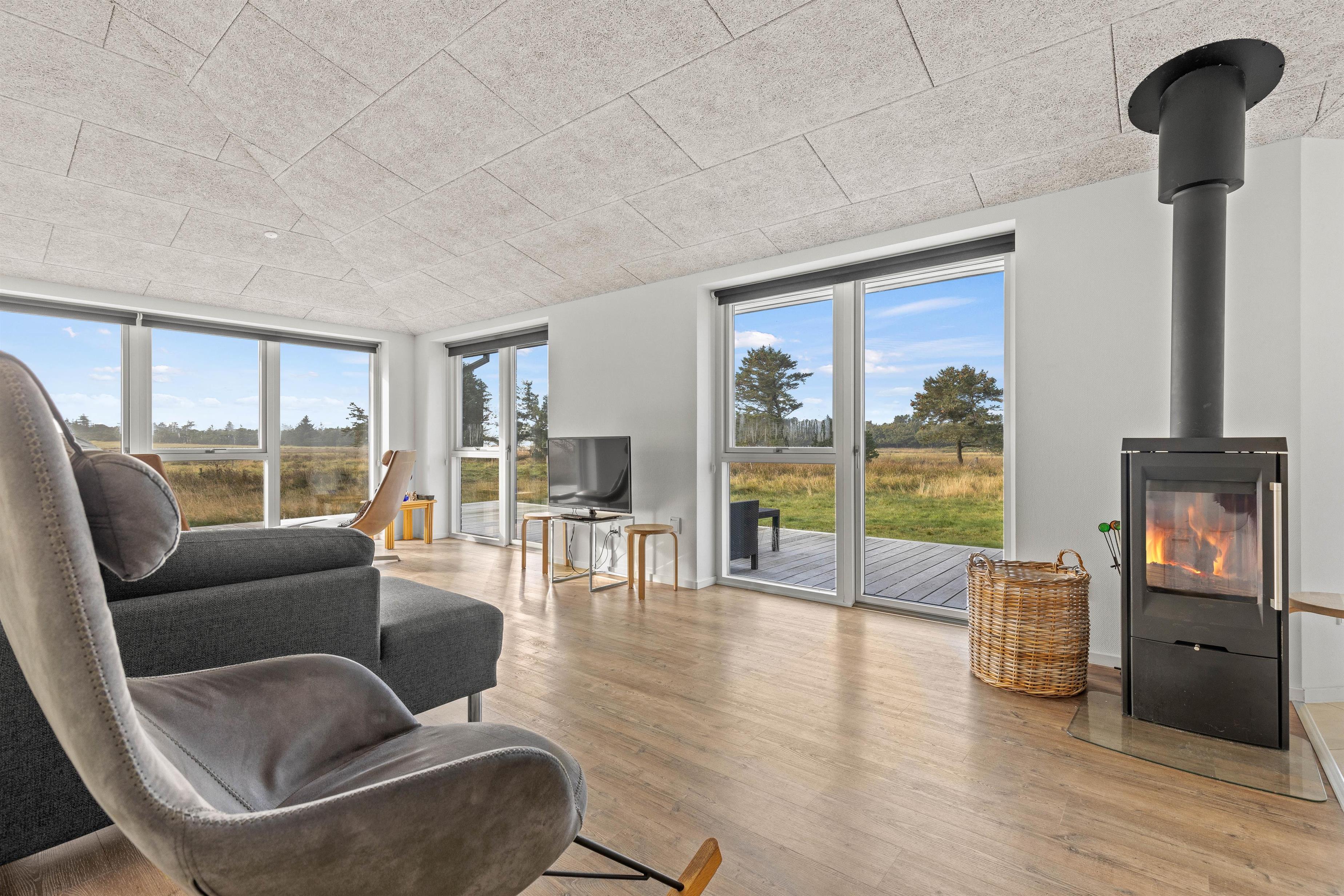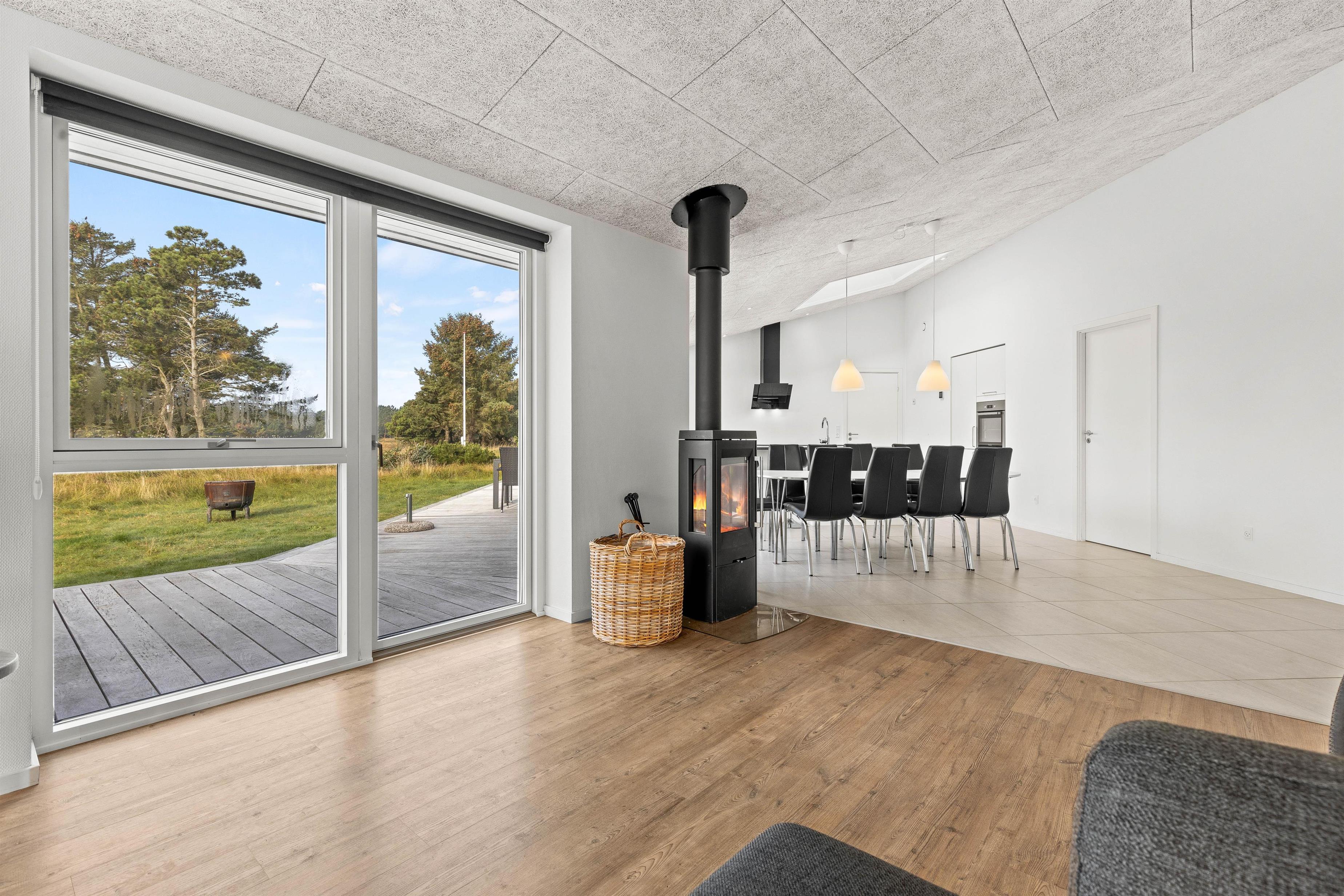 Det er ikke kun på badeværelset, I kan nyde gulvvarmen. Det kan I nemlig også i alrummet, der vil være jeres store samlingspunkt på ferien. Med åben forbindelse mellem køkken, spiseplads og stue er der rig mulighed for, at I kan nyde hinandens selskab – og med brændeovnen knitrende i baggrunden bliver prikken over i’et sat.