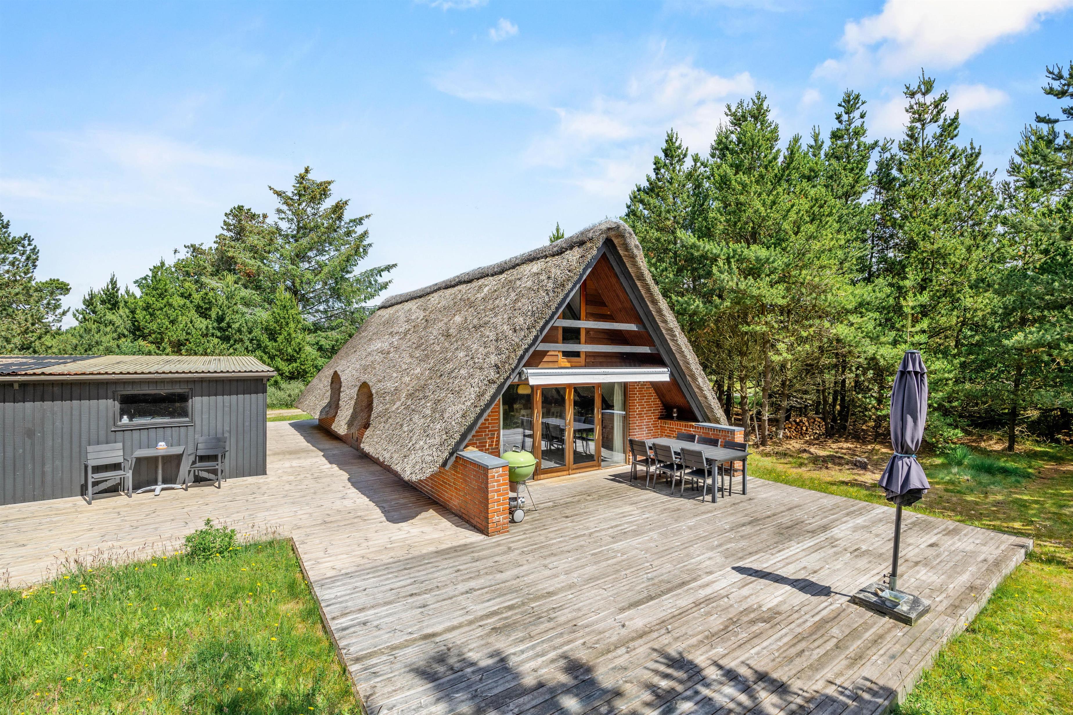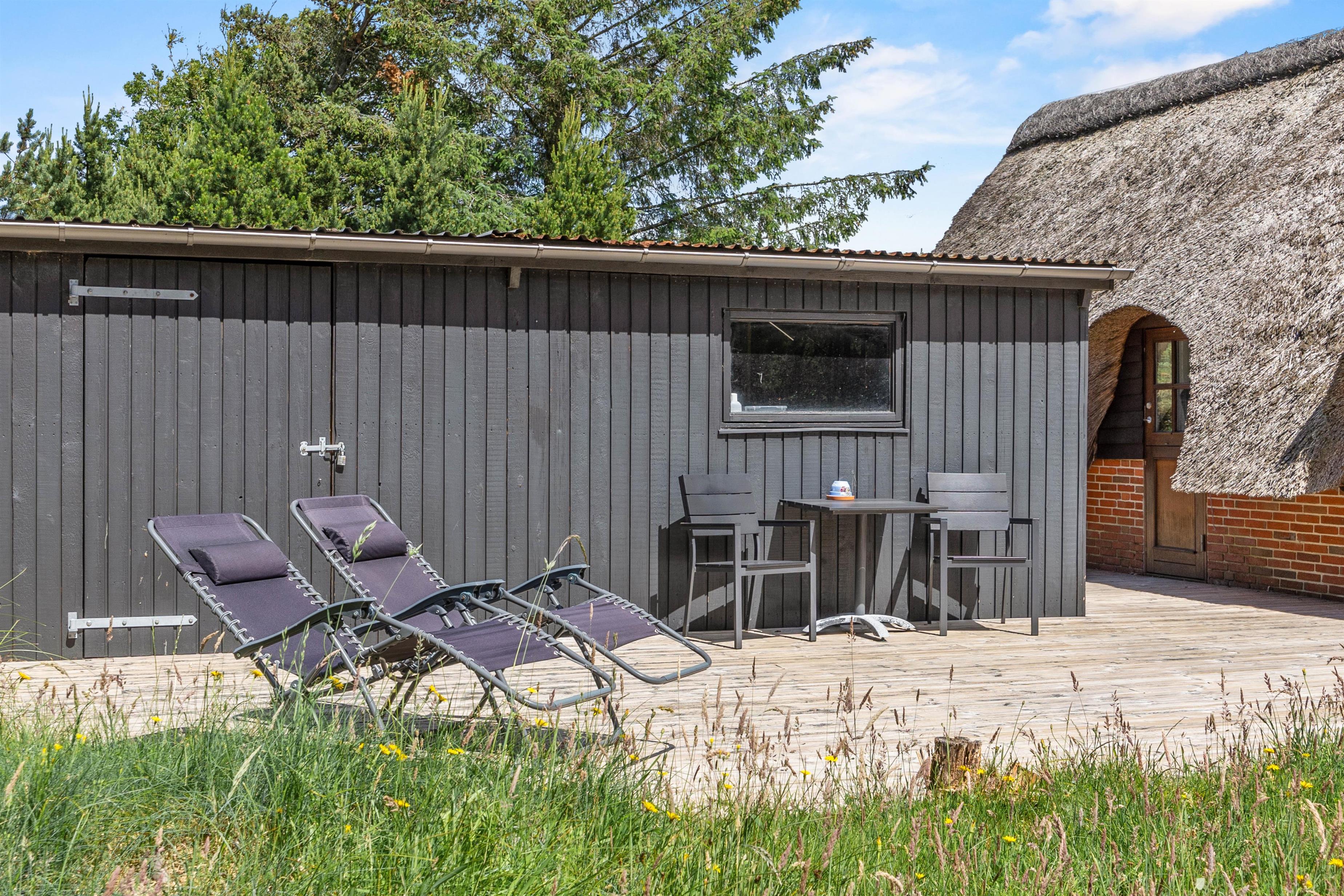 Udenfor venter jer en dejlig terrasse, hvor I kan nyde solskinstimerne. Havemøblerne står klar til jer, så I kan slappe af og nyde sommeren. Om aftenen kan I tænde op i grillen, grille en steak og nyde den sammen med et godt glas rødvin. Fuldend aftenen på stranden, der ligger en kort gåtur herfra! Her kan I opleve den maleriske solnedgang, mens hunden luftes. Dyk ned i de blå bølger, gå en tur langs vandkanten, saml muslingeskaller eller byg sandslotte med børnene – mulighederne er mange. Stranden er også bilvenlig, så det er muligt at køre helt ned på stranden.