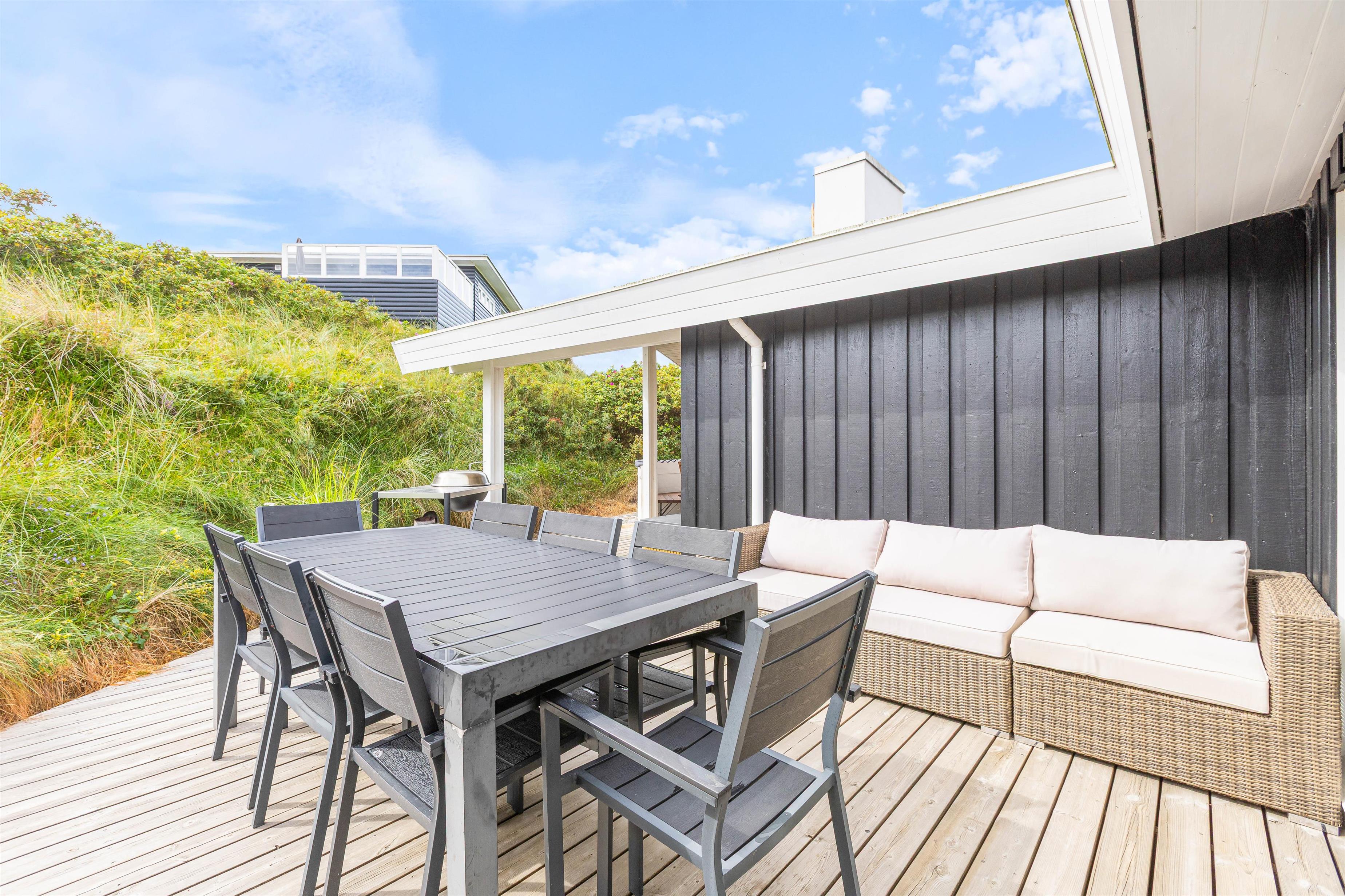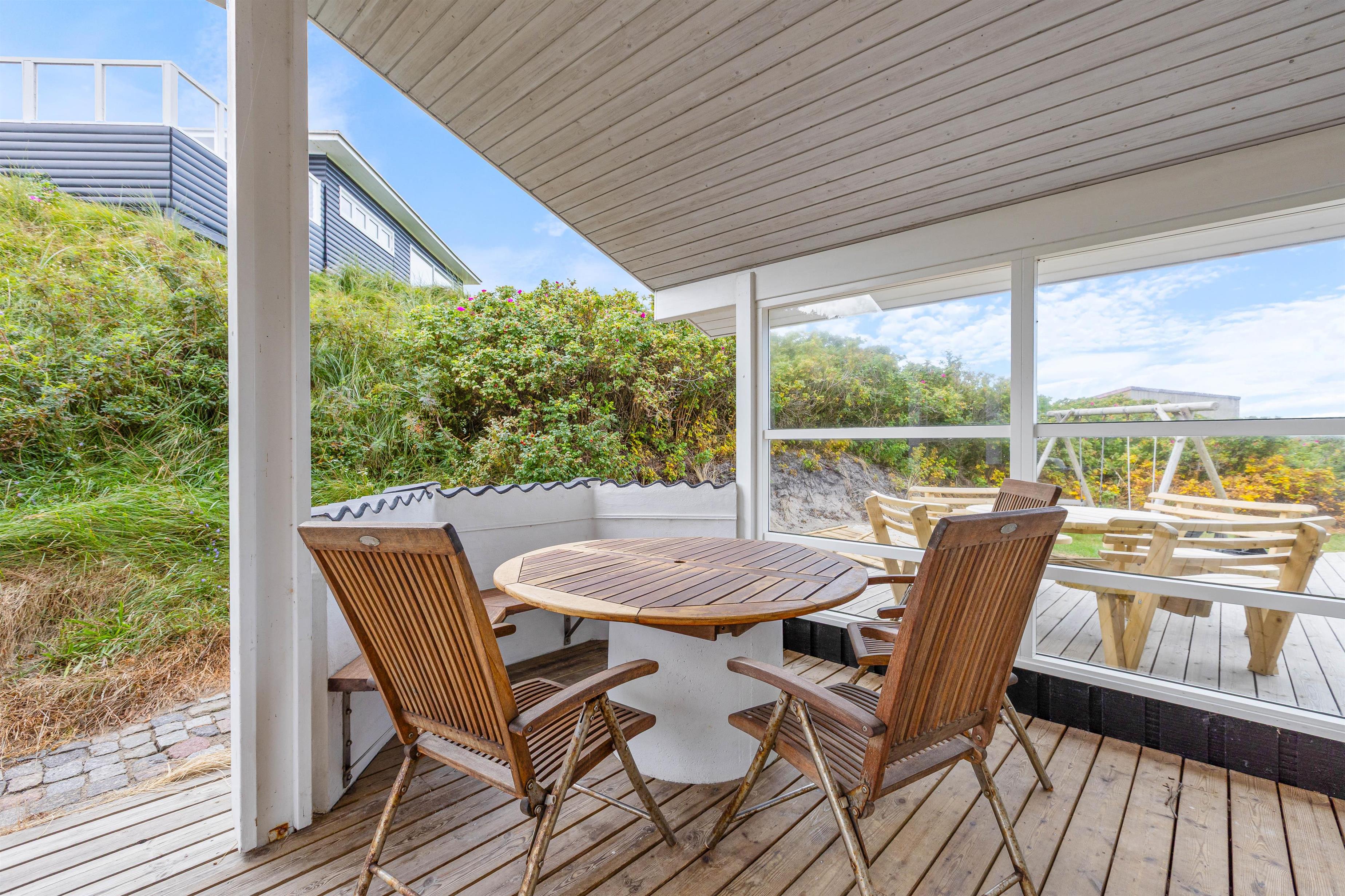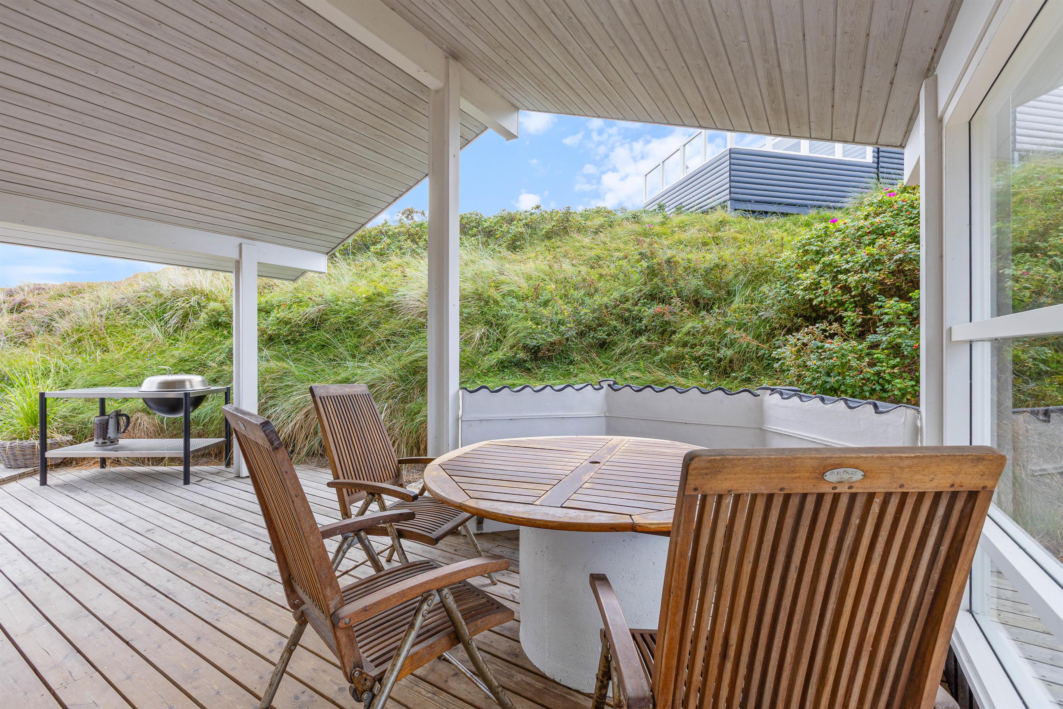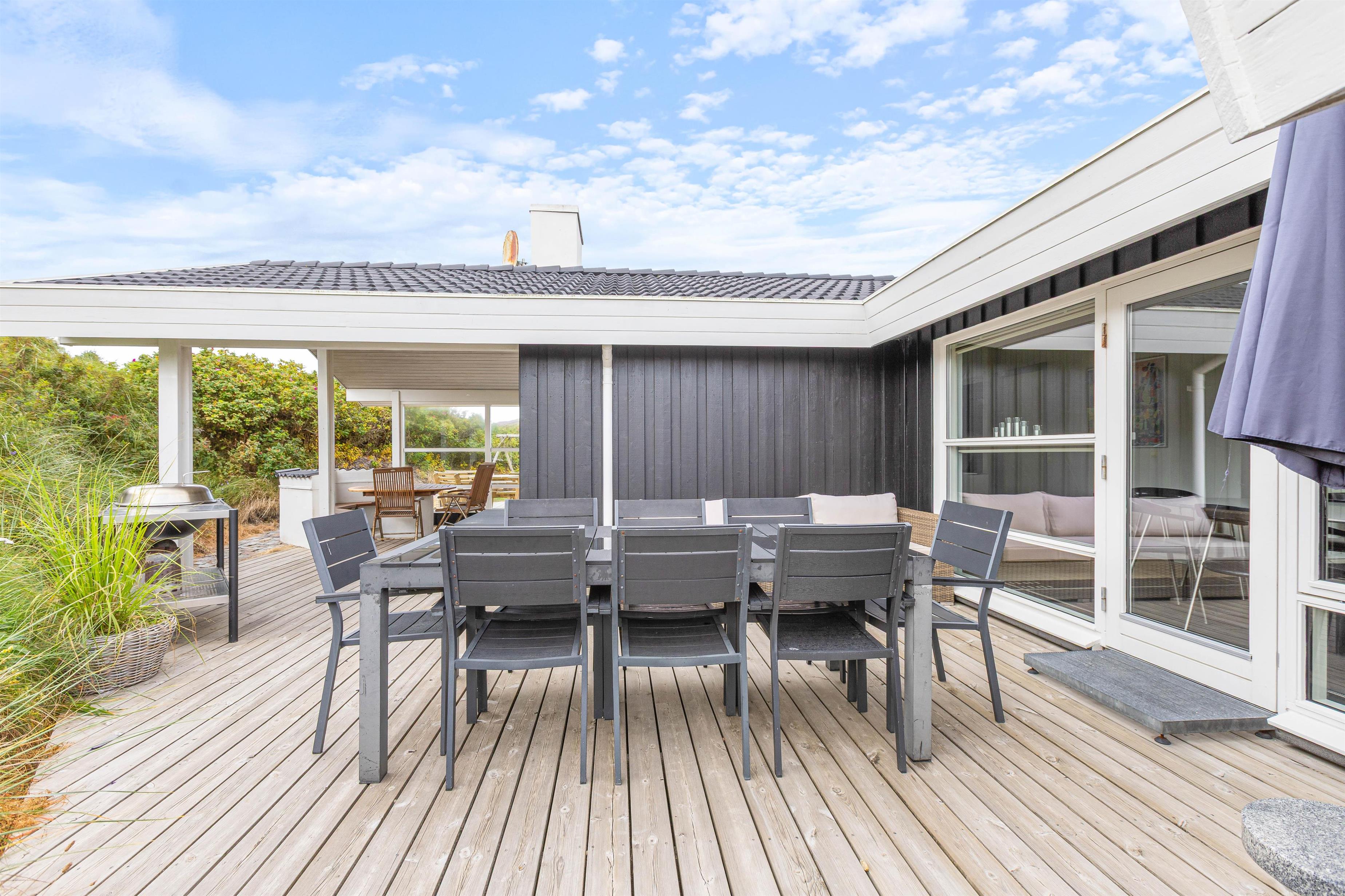 Feriehuset ligger godt beskyttet af høje klitbanker, som giver god læ på terrassen. Der er desuden flere fine terrasser rundt om huset, der både er helt åbne, afskærmede og overdækkede, så både solentusiaster og de, der foretrækker at sidde i skyggen, kan finde en plads.