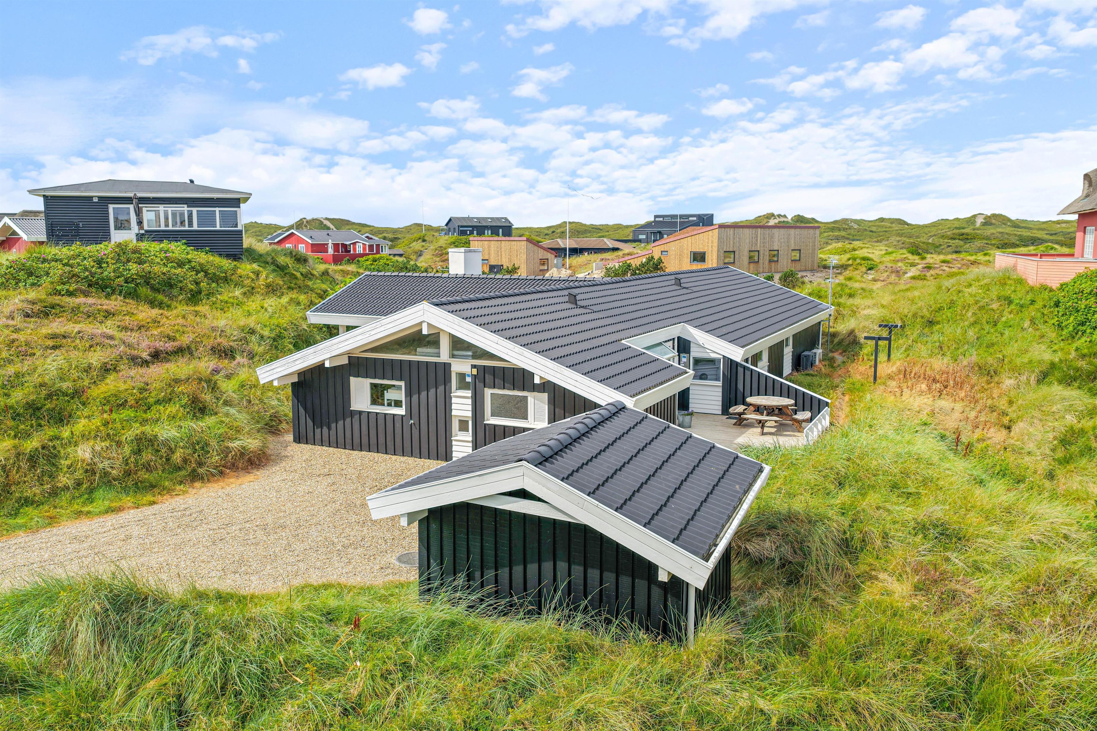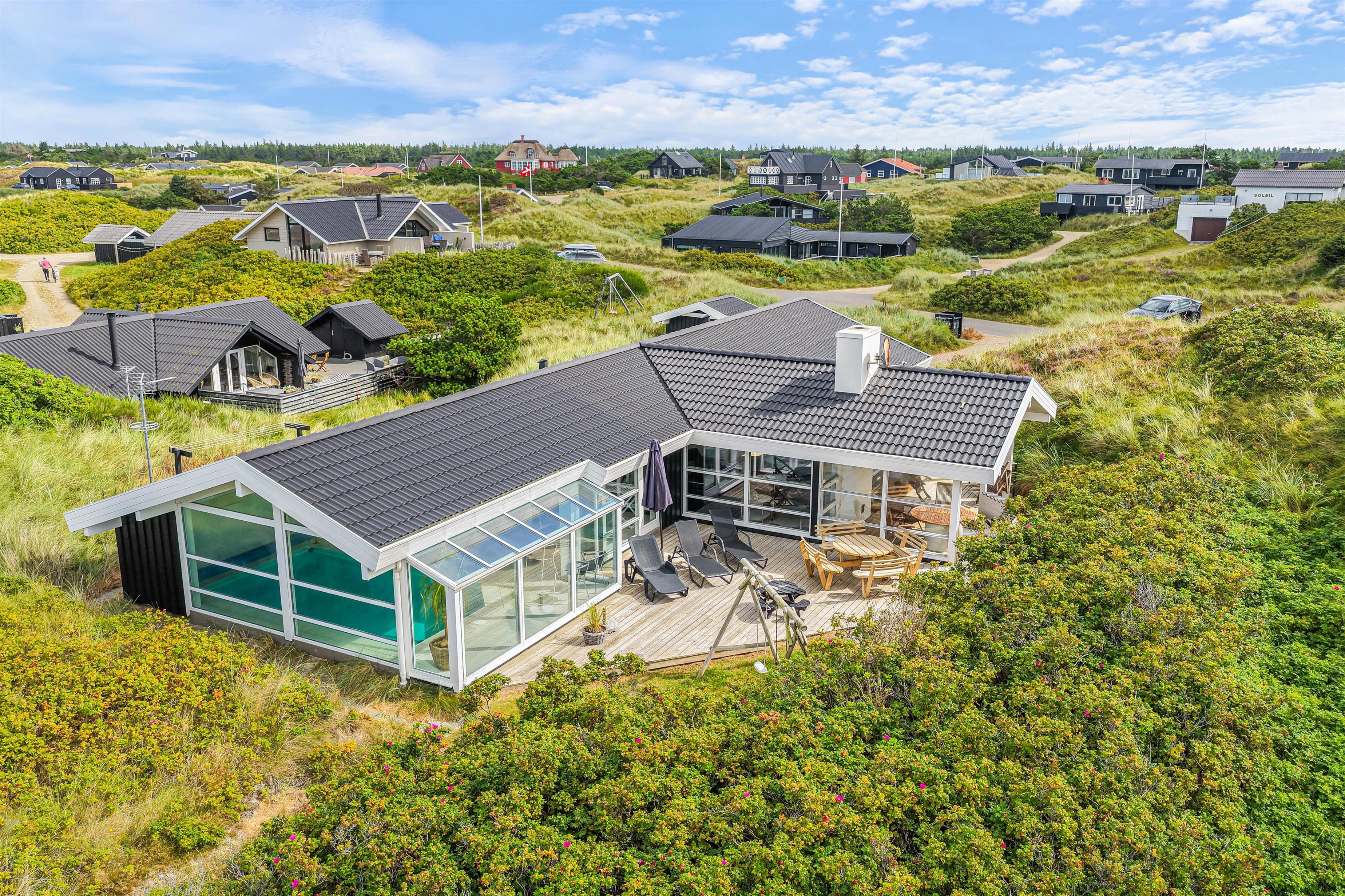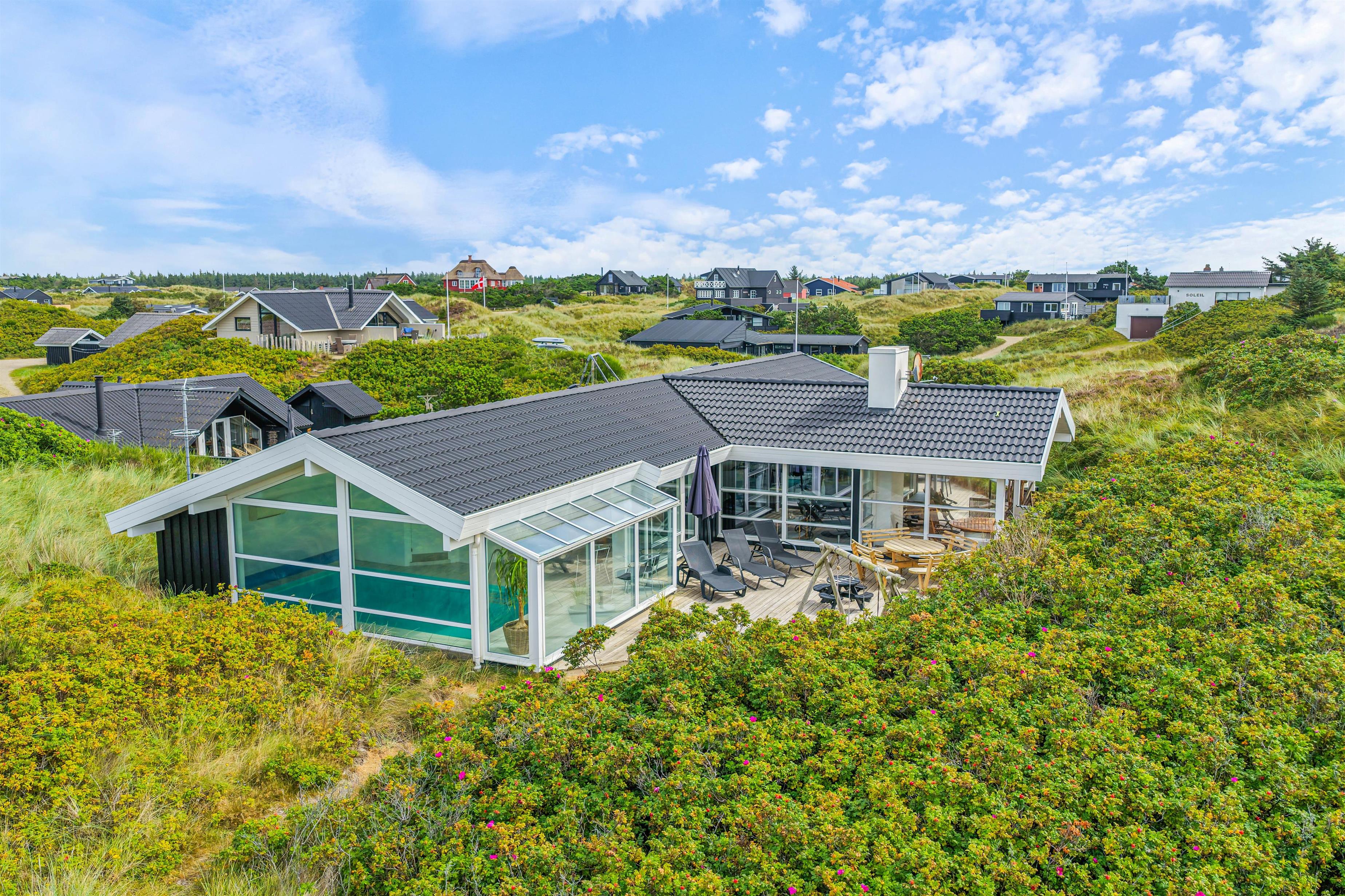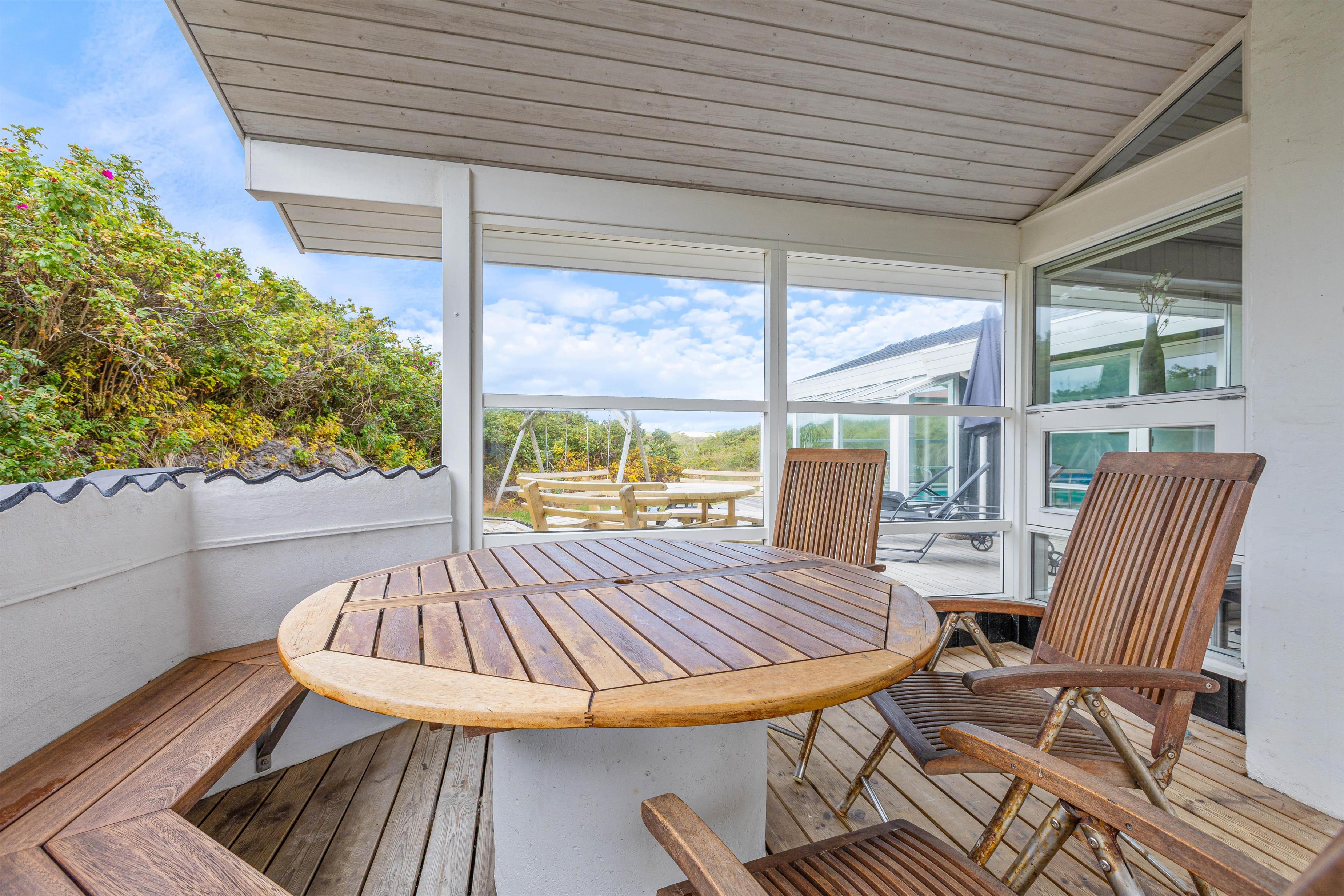 Feriehuset ligger godt beskyttet af høje klitbanker, som giver god læ på terrassen. Der er desuden flere fine terrasser rundt om huset, der både er helt åbne, afskærmede og overdækkede, så både solentusiaster og de, der foretrækker at sidde i skyggen, kan finde en plads.