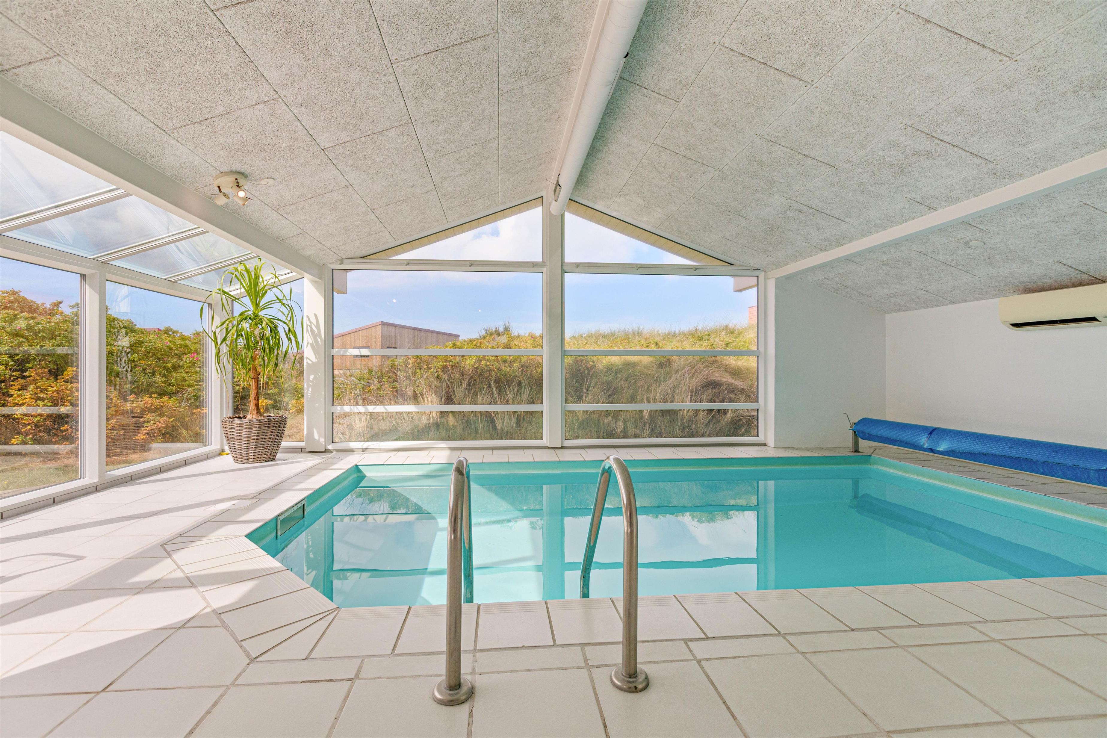 Det skønne poolhus i Vejers Strand råder over hele 168 kvadratmeter. Loftet går til kip, væggene er klædt i lyse farver og store vinduer skaber godt lysindfald; alt sammen er det med til at skabe rummelighed og en rigtig behagelig atmosfære i hele feriehuset.