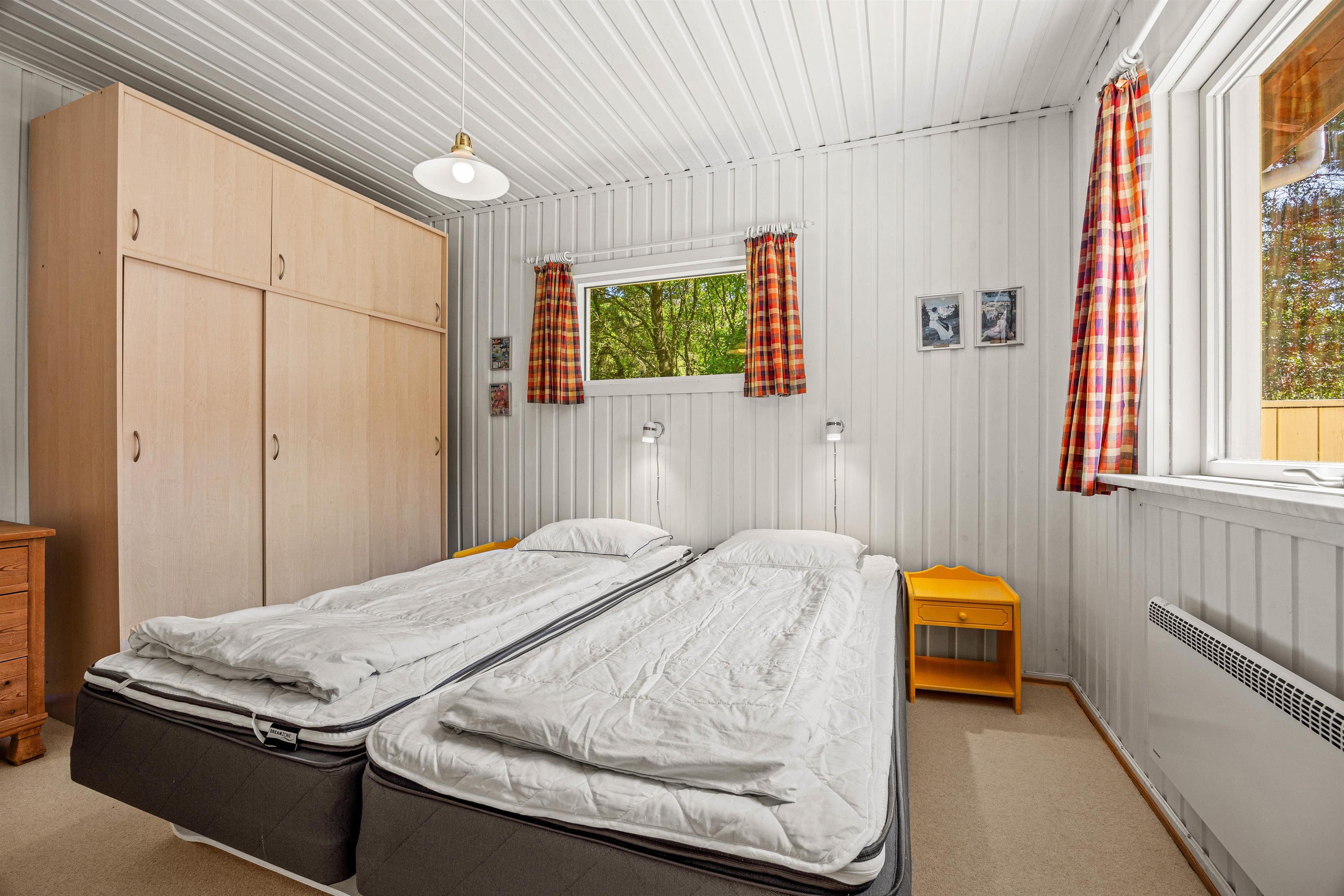 I sommerhuset på Gøgevej i Vejers finder I 3 hyggeligt indrettede soveværelser med god opbevaringsplads. To af værelserne har dobbeltsenge, mens det tredje har 2 enkeltsenge - i et af værelserne er en af sengene en køjeseng. Her vil I føle jer godt hjemme og kunne finde ro og hvile efter spændende feriedage i Vejers-området.