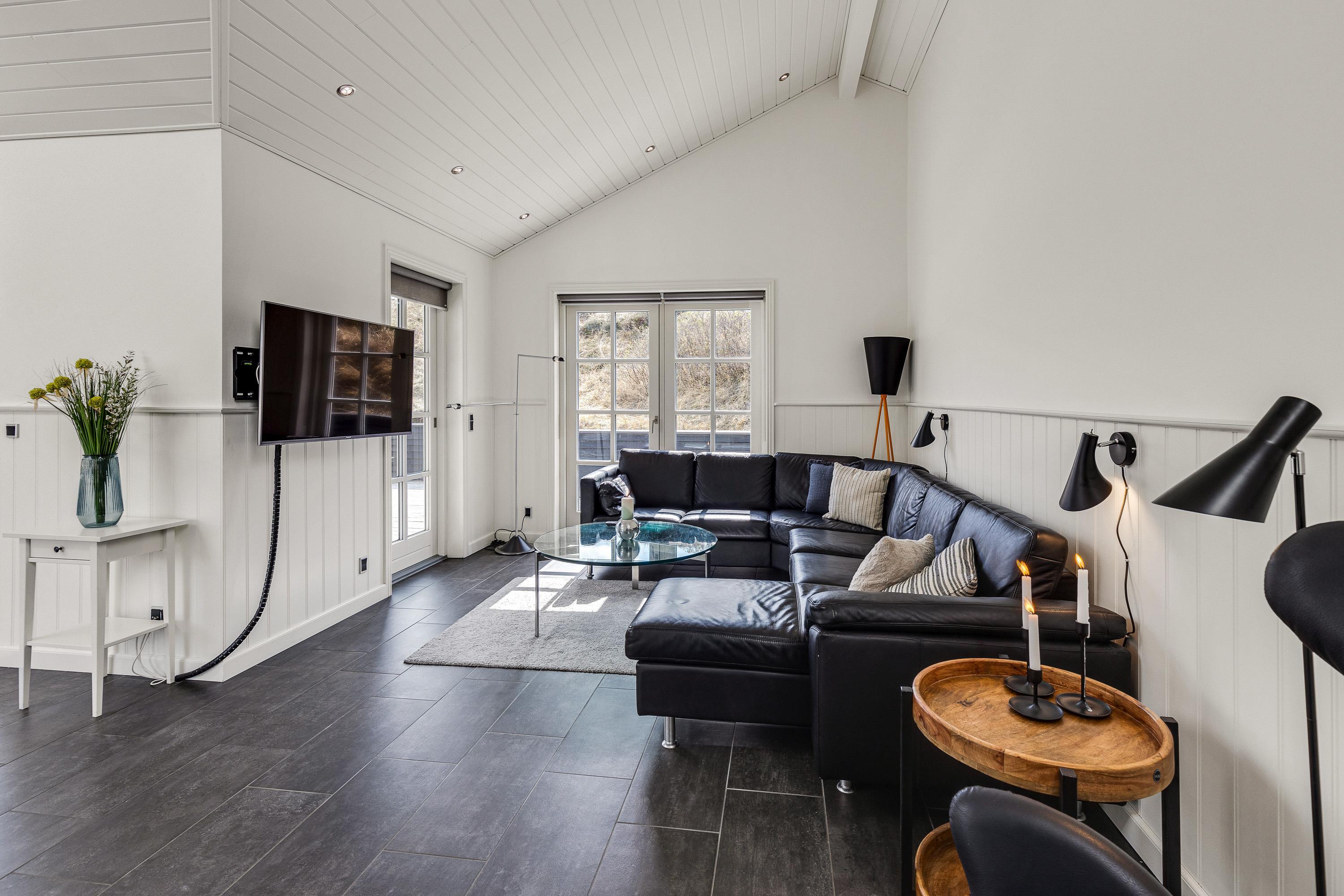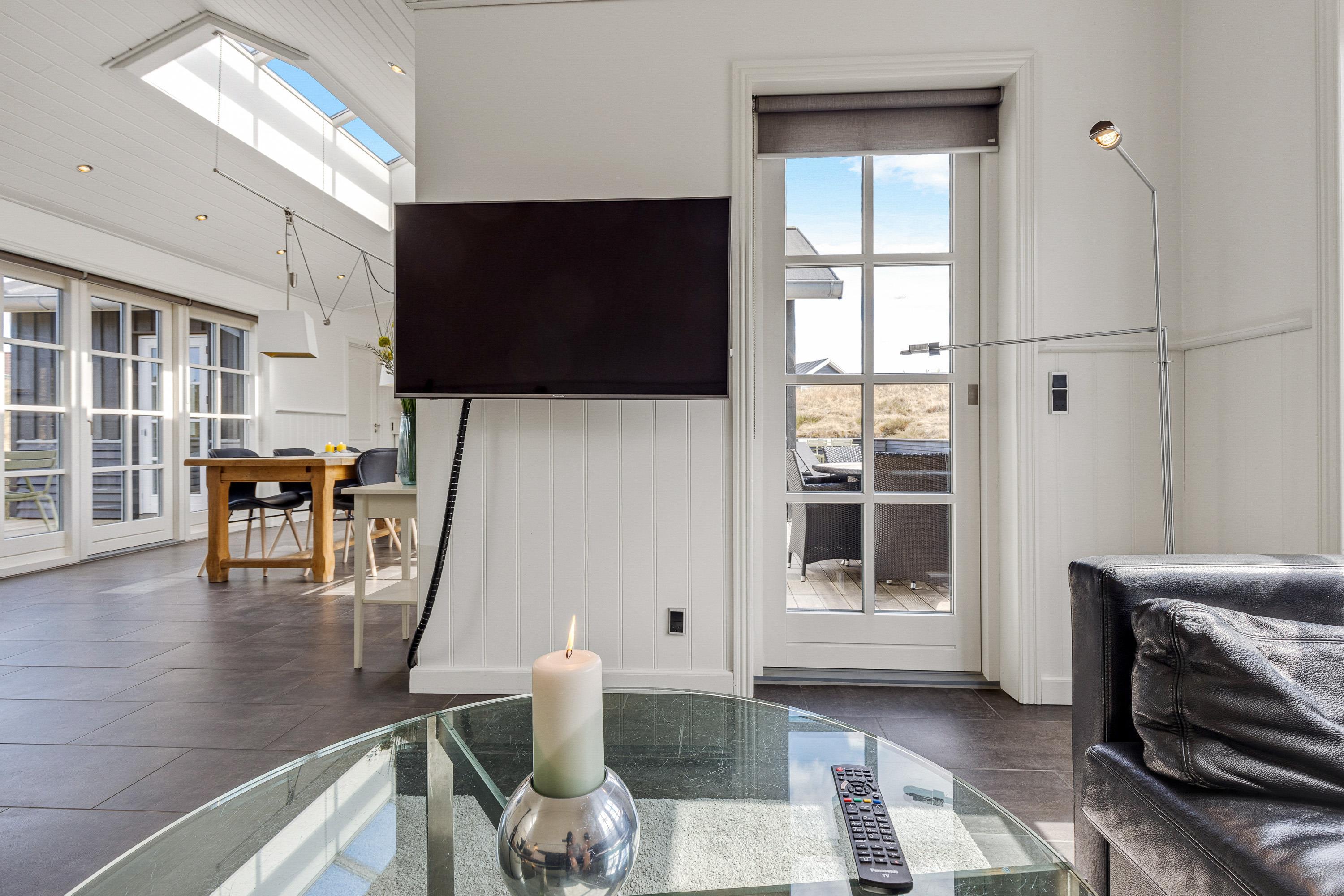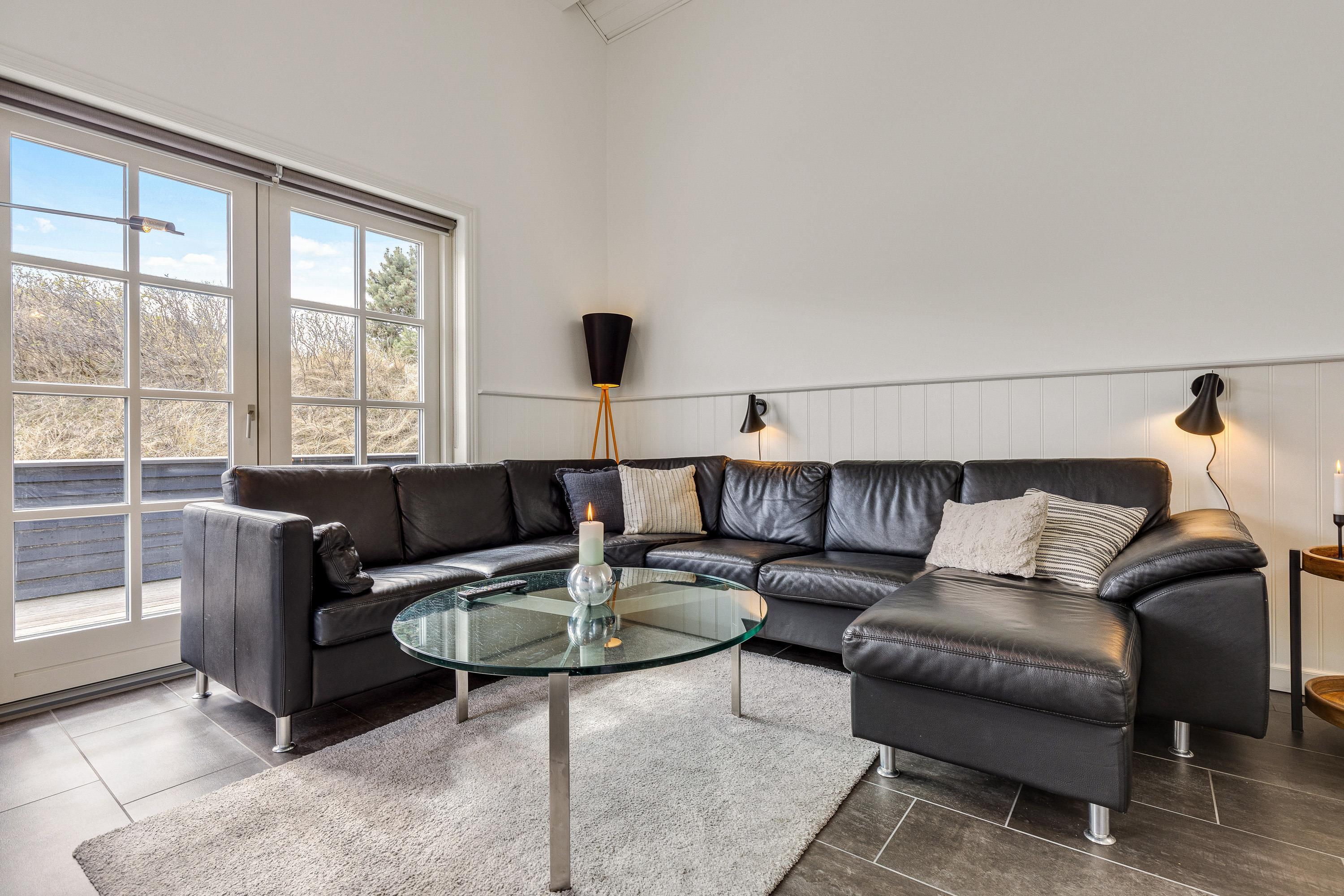 Det femstjernede feriehus byder indenfor til en lys og indbydende indretning, hvor der er et skønt lysindfald og højt til loftet. Tilsammen skaber det en helt fantastisk ferieatmosfære for jeres ferie.