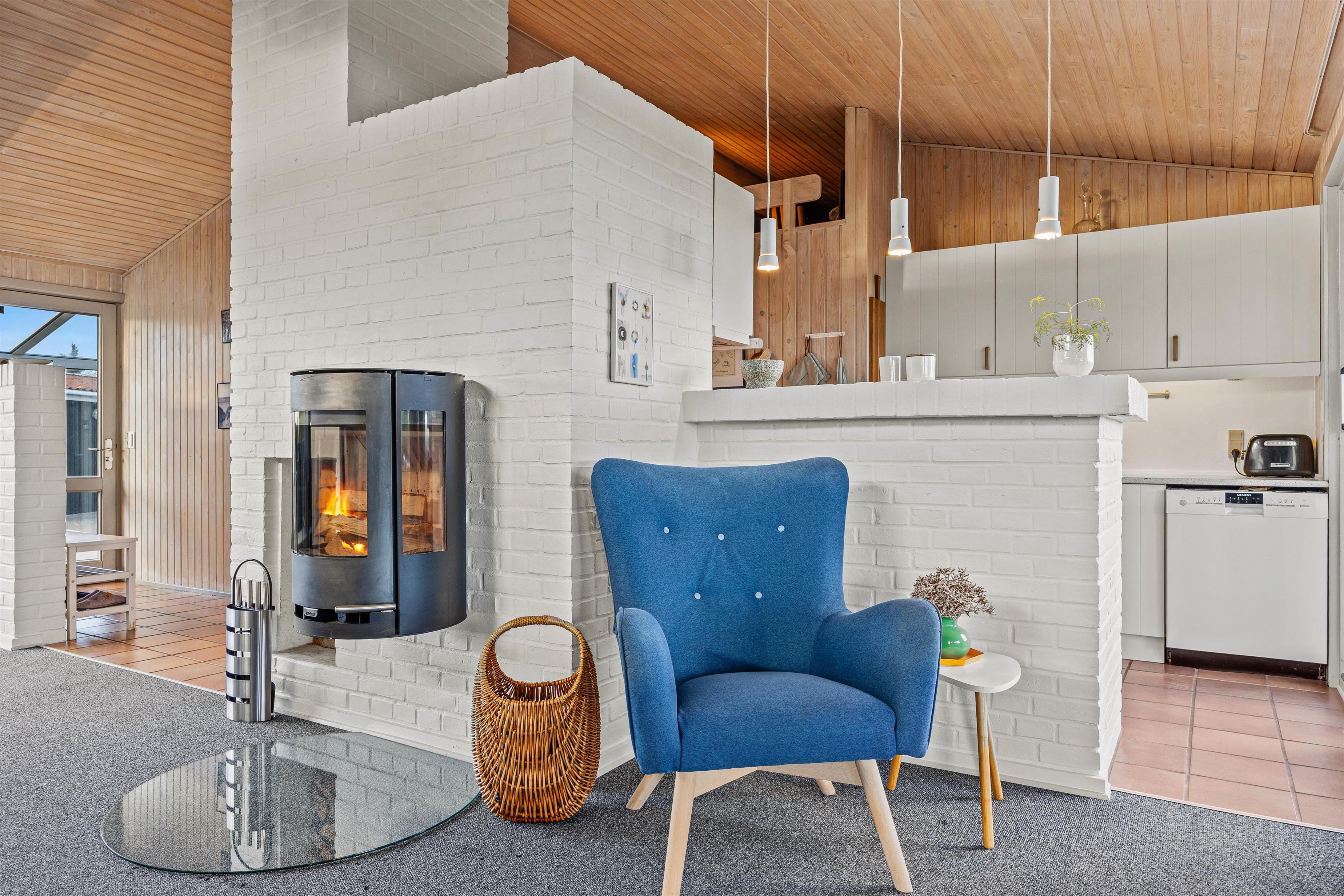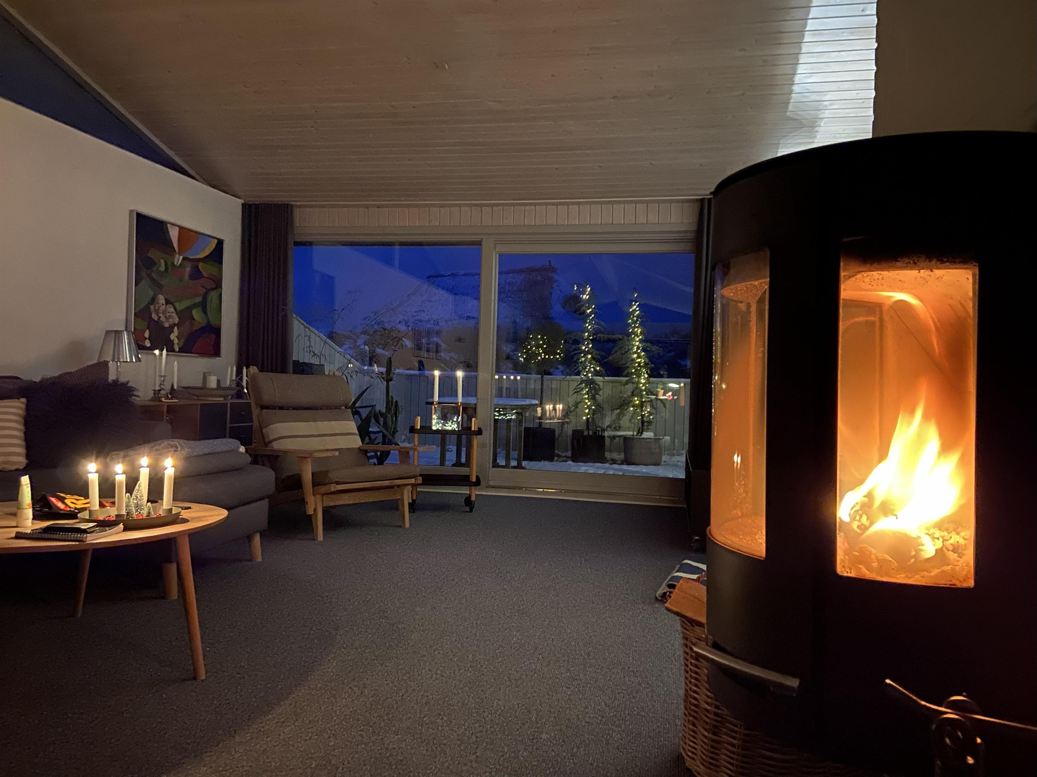 Hjerterummet er stuen, hvor brændeovnen spreder varme og hygge. Her er en hyggelig atmosfære, og de store vinduer inviterer dagslyset indenfor i stuen. Slap af med en god bog, saml familien om et brætspil eller noget helt tredje – mulighederne er mange. Ved siden af finder I spiseområdet og køkkenet. I det fuldt udstyrede køkken, som også har en mikroovn, kan I tilberede lækre retter, og opvasken sørger opvaskemaskinen for.