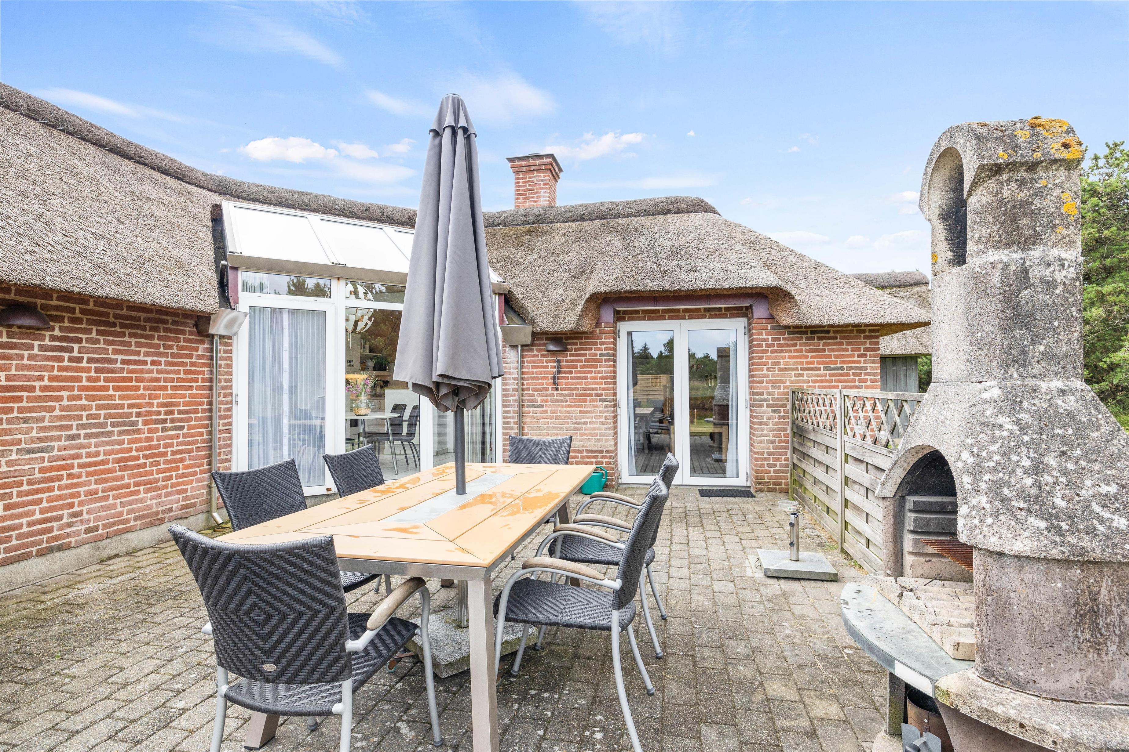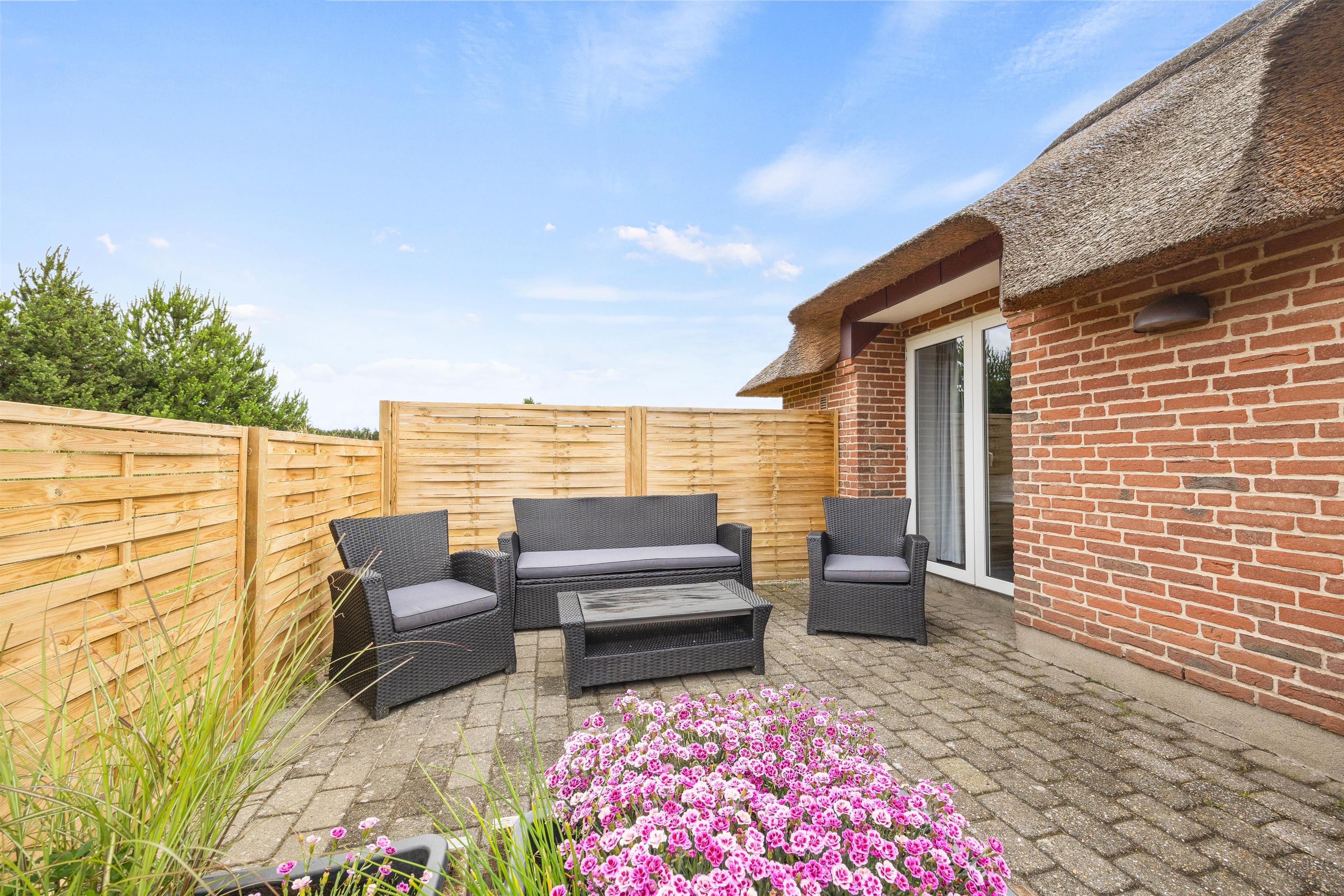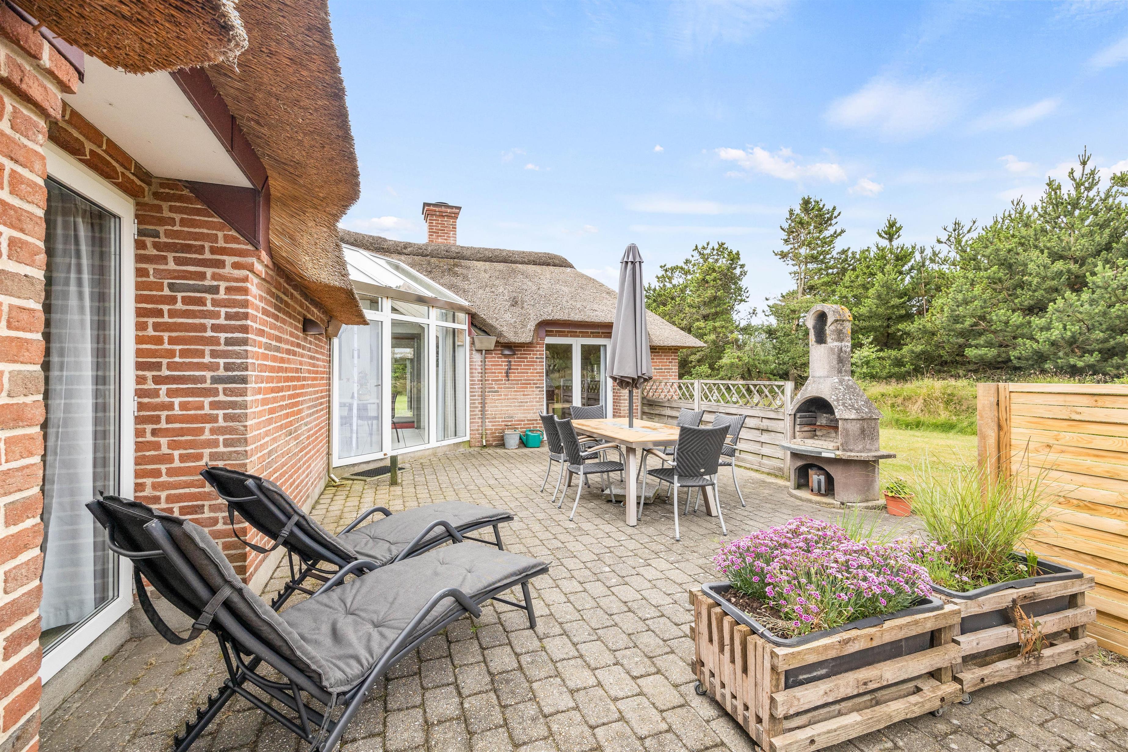 Sommerhuset har en afskærmet terrasse mod vest, hvor I kan tilbringe og nyde de varme feriedage. Her står der både liggestole, havemøbler og en grill klar til jer, så I kan få mest muligt ud af de dage, hvor solen er fremme, og temperaturerne er høje.