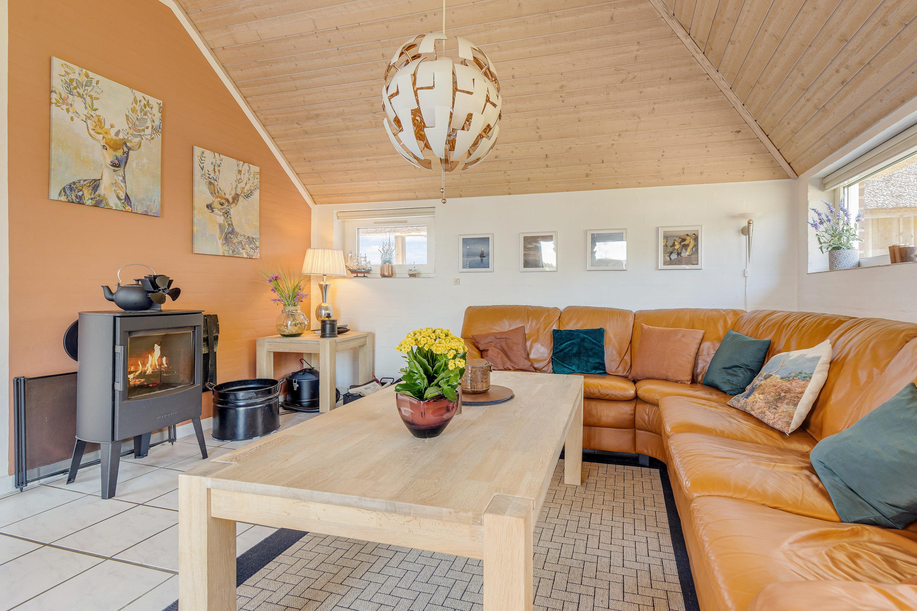 Hjertet i sommerhuset er opholdsstuen, hvor I med garanti vil få mange gode ferieminder sammen. Saml jer i sofaerne til en god film i tv’et eller til et sjovt bræt- eller kortspil omkring spisebordet. Vil I have skruet ekstra op for feriestemningen, tænder I op i brændeovnen.