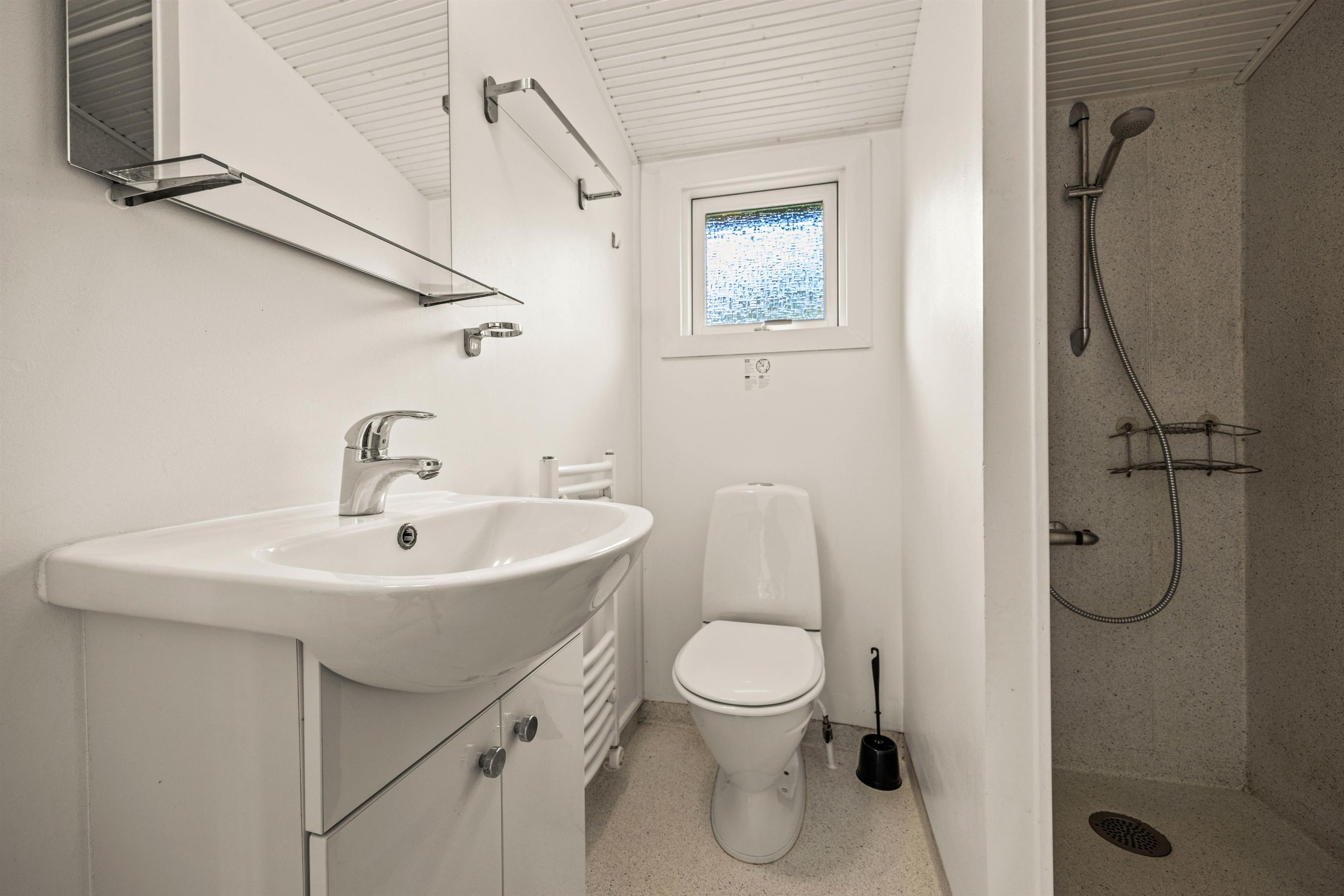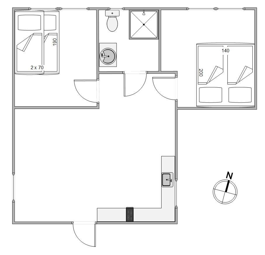 Sommerhuset har et badeværelse, 2 fine soveværelser og et køkkenalrum, hvor I alle kan samles. Her smelter køkken, stue og spisepladsen sammen og I kan let grine på tværs. Vær opmærksom på, at der I køkkenet er en kombiovn (mikroovn/ovn) og 2 kogeplader.