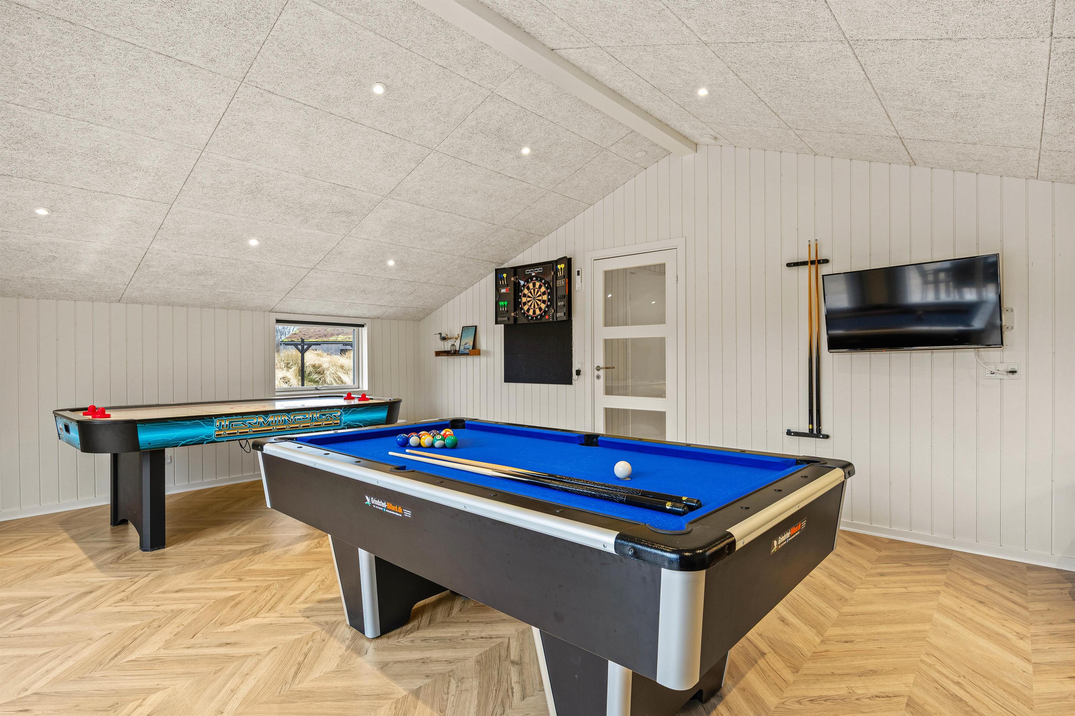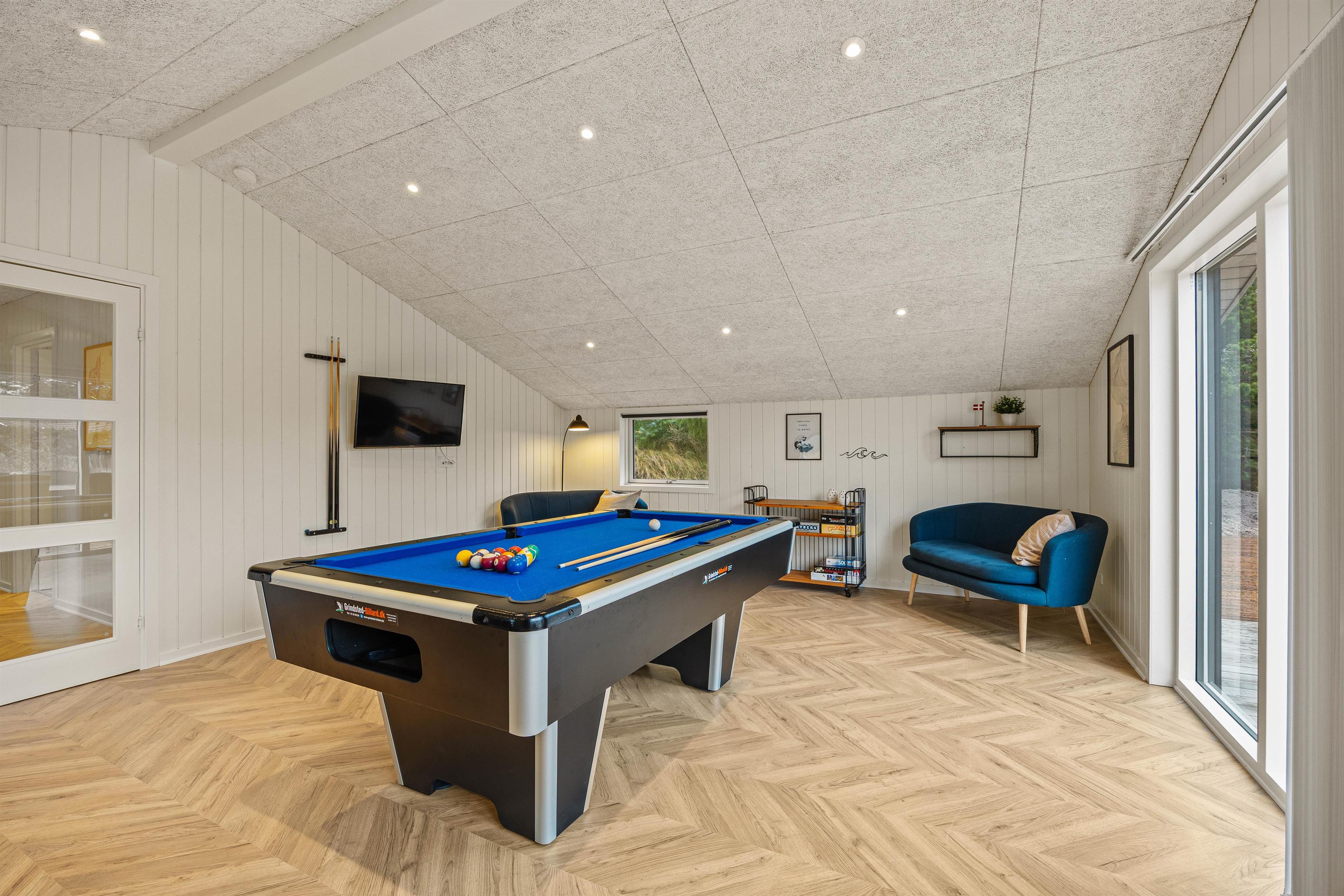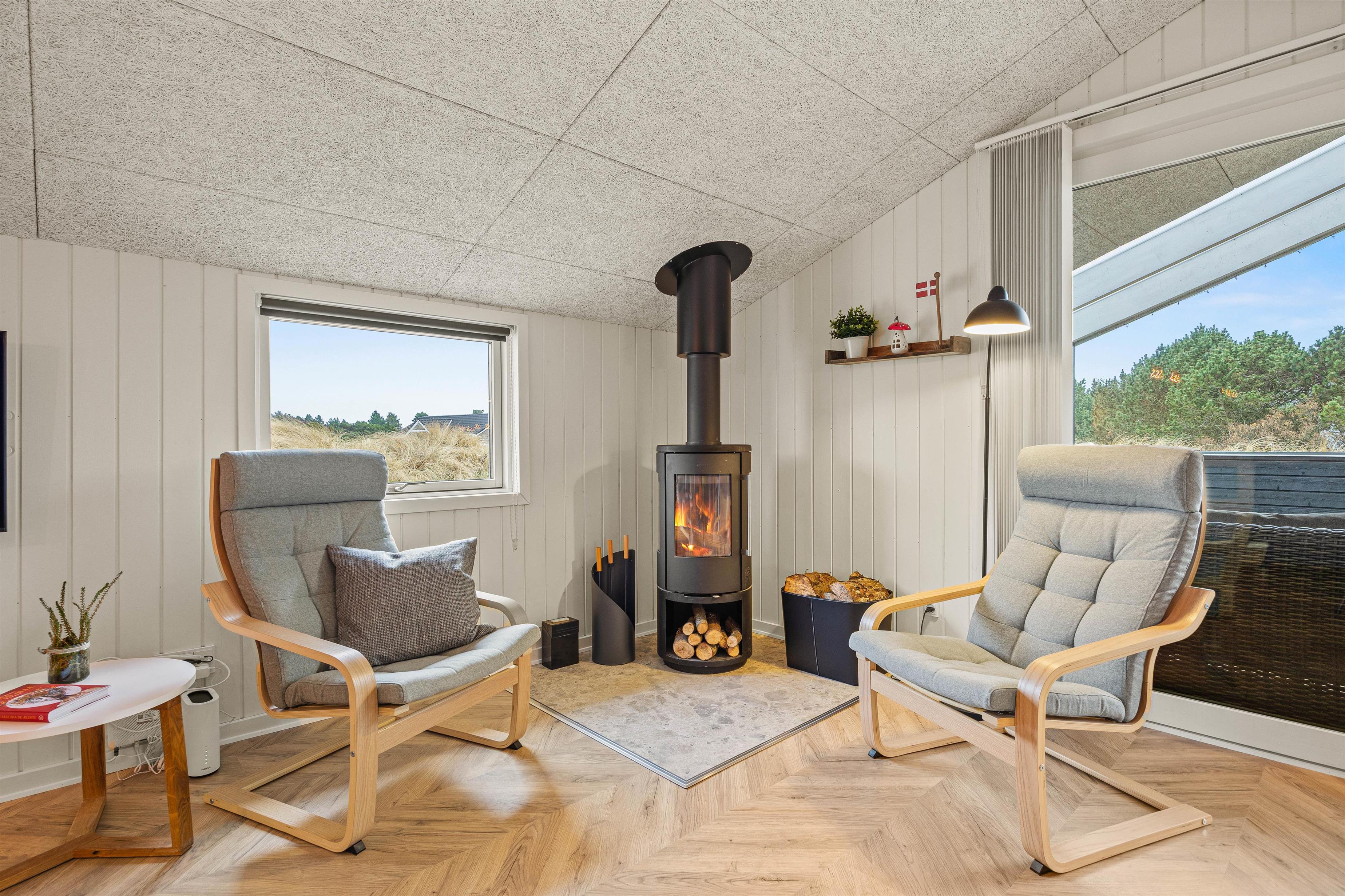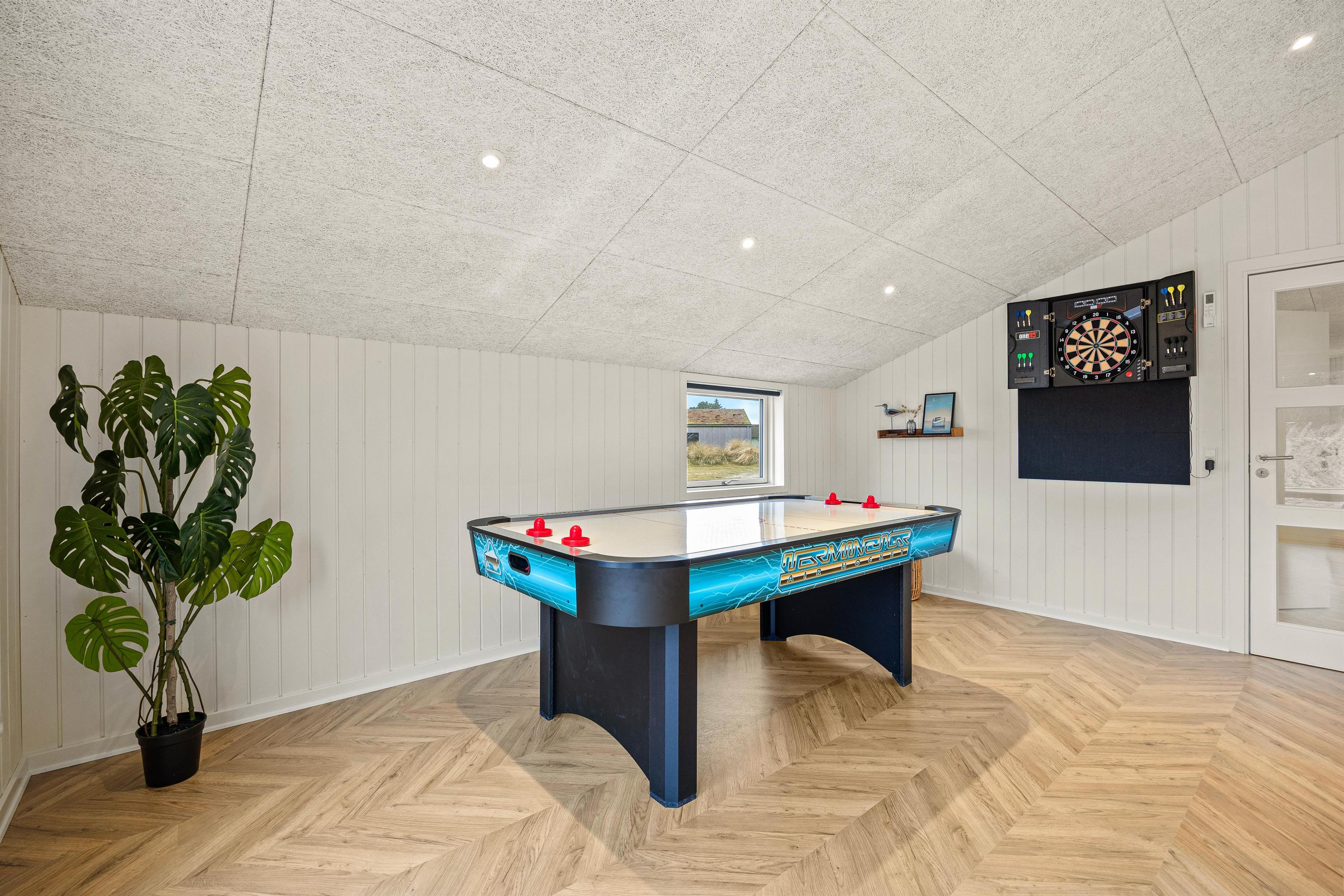 I den ene ende finder i et dejligt lyst og rummeligt køkkenalrum, hvor der er plads til hele familien. En hyggelig stue med brændeovn, der indbyder til hyggestunder med familie og venner på de kølige ferieaftener. I den anden ende finder I et fint aktivitetsrum med billardbord, Airhockeybord og tv, her kan børnene tilbringe mange hyggelige timer, imens i laver mad eller hygger i stuen. Når solen er gået ned, og I er trætte efter en begivenhedsrig dag, kan I finde hvile i et af de 4 hyggelige soveværelser med dobbeltsenge.