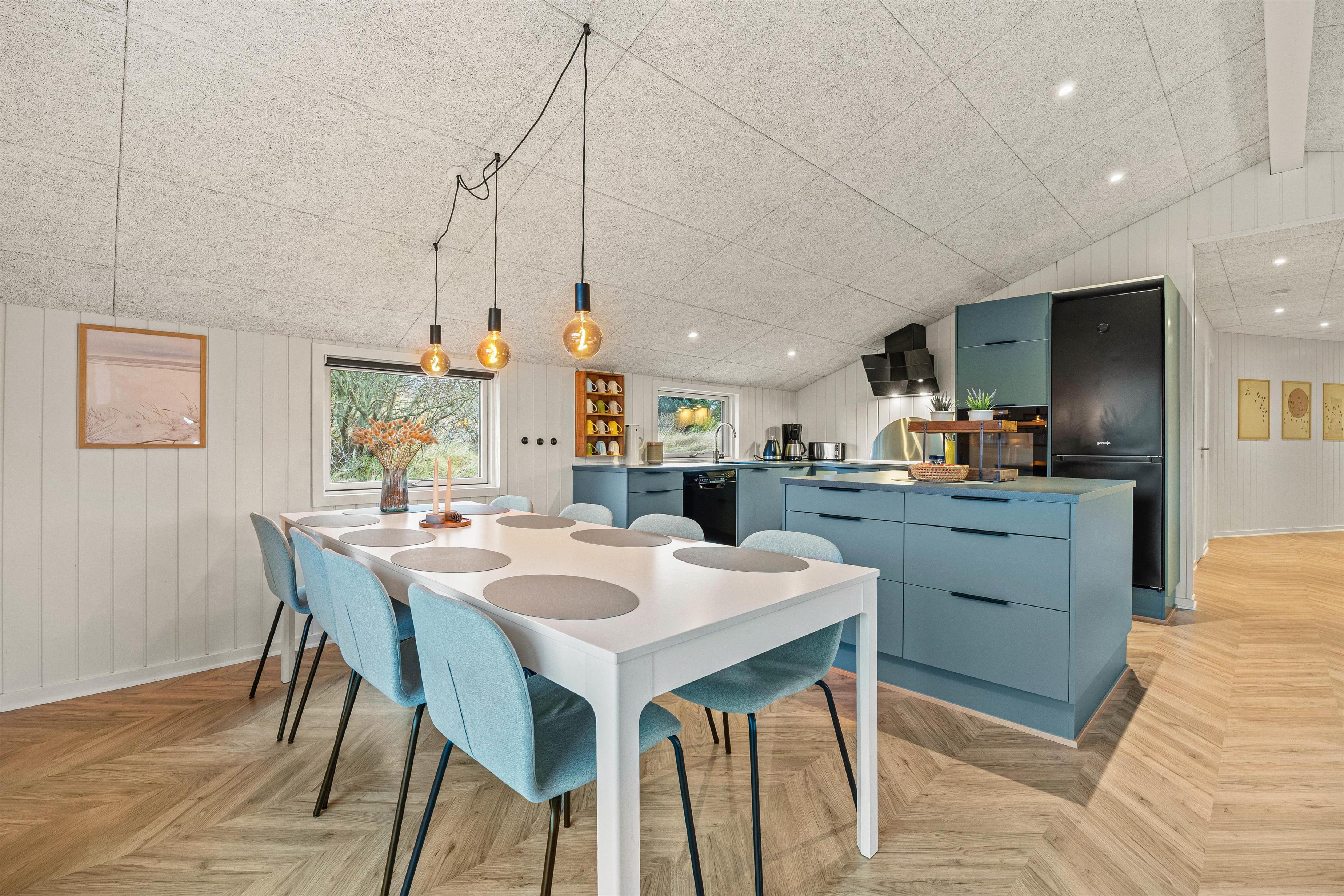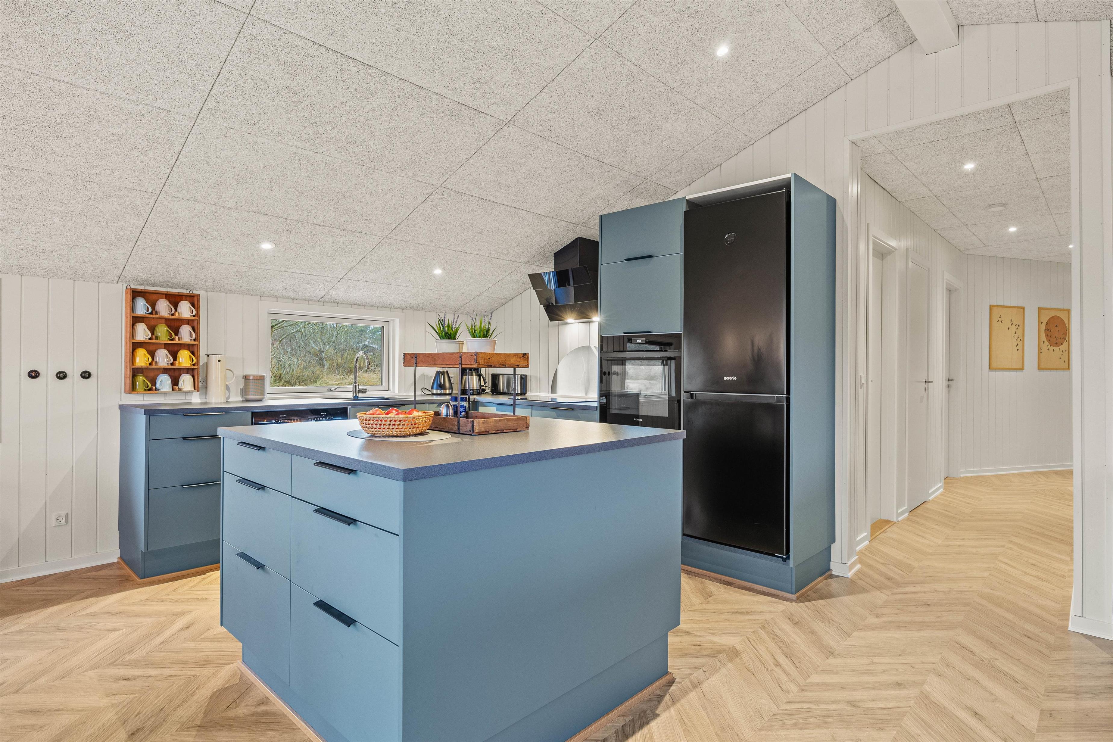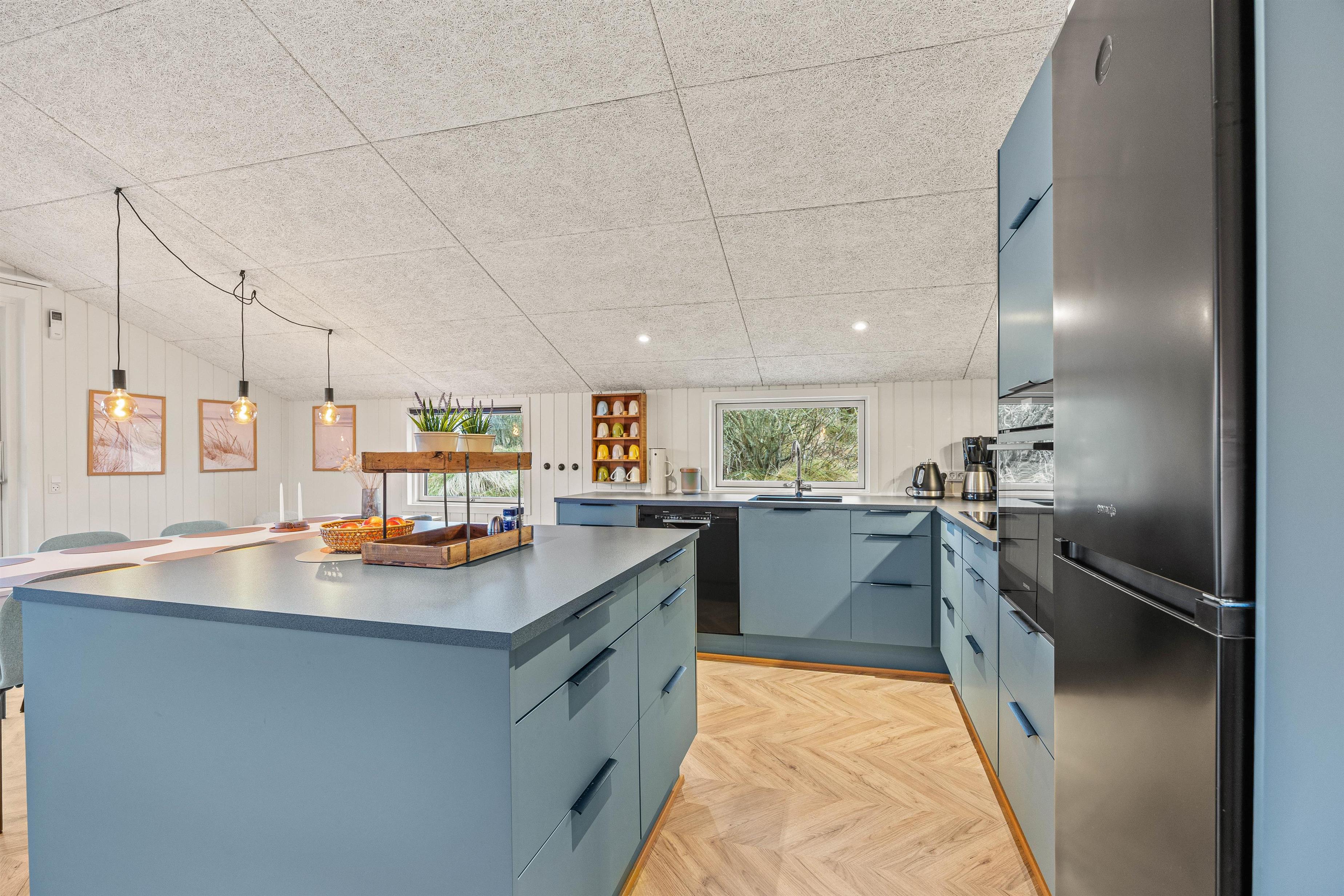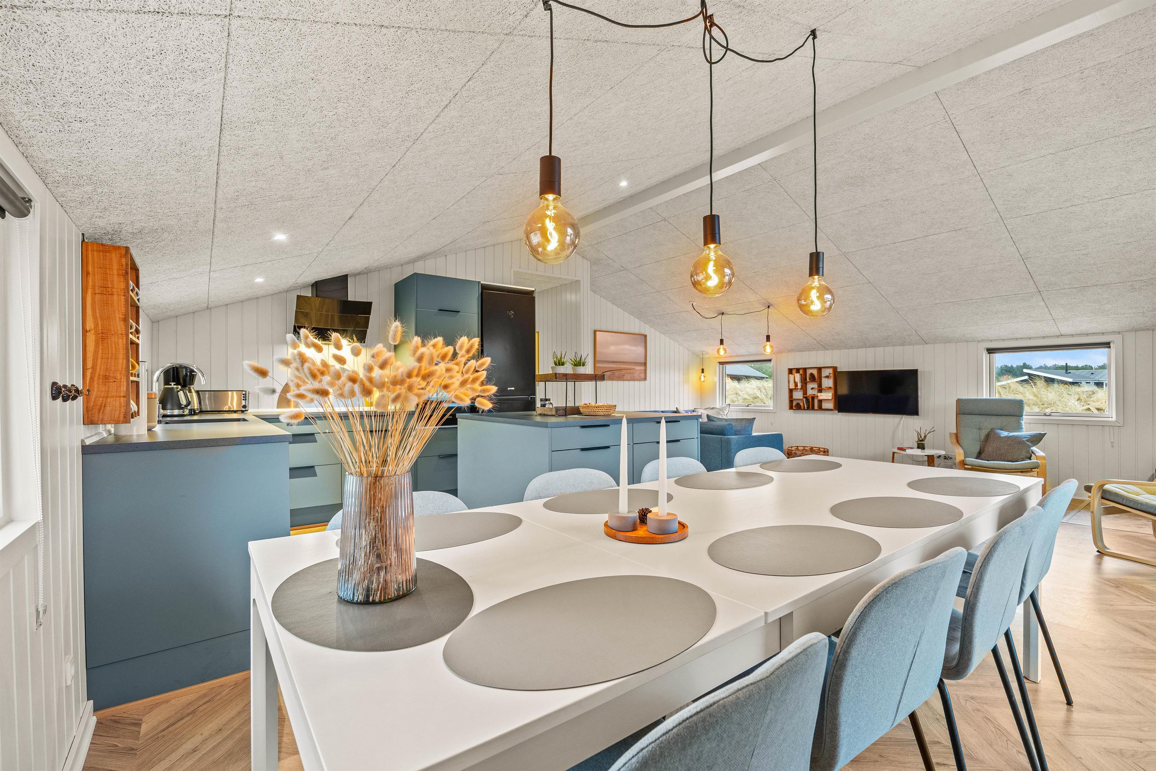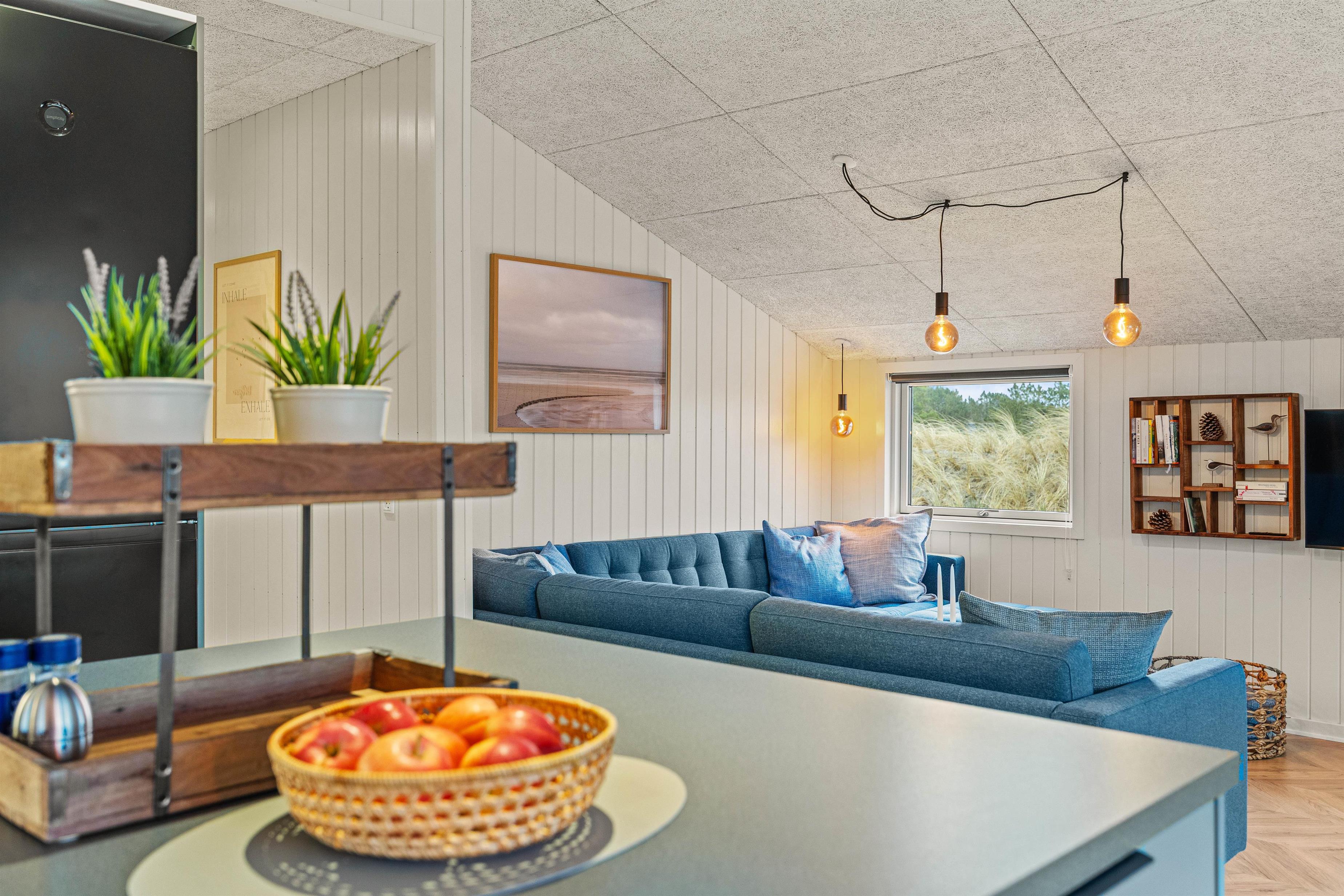 I den ene ende finder i et dejligt lyst og rummeligt køkkenalrum, hvor der er plads til hele familien. En hyggelig stue med brændeovn, der indbyder til hyggestunder med familie og venner på de kølige ferieaftener. I den anden ende finder I et fint aktivitetsrum med billardbord, Airhockeybord og tv, her kan børnene tilbringe mange hyggelige timer, imens i laver mad eller hygger i stuen. Når solen er gået ned, og I er trætte efter en begivenhedsrig dag, kan I finde hvile i et af de 4 hyggelige soveværelser med dobbeltsenge.