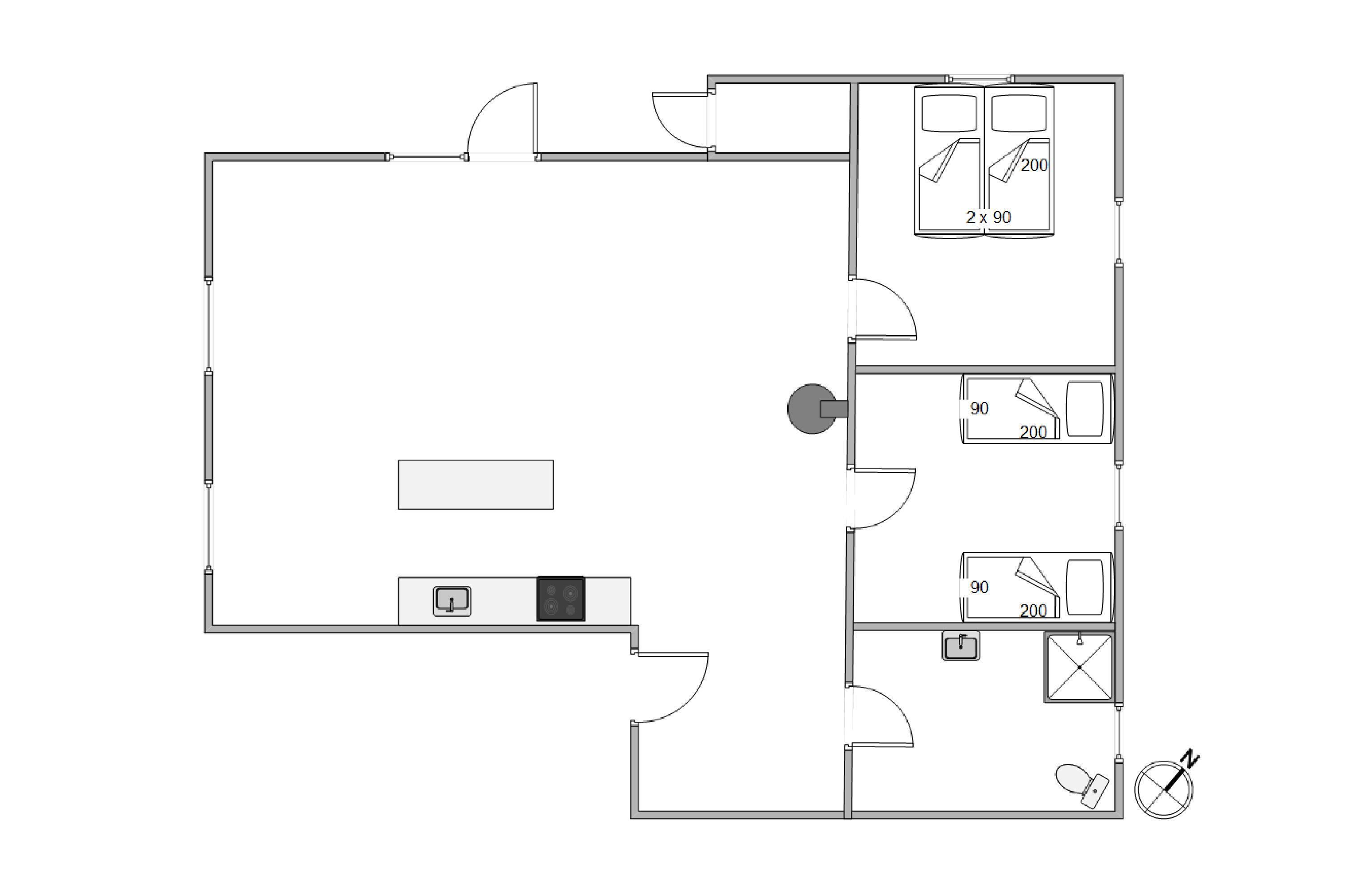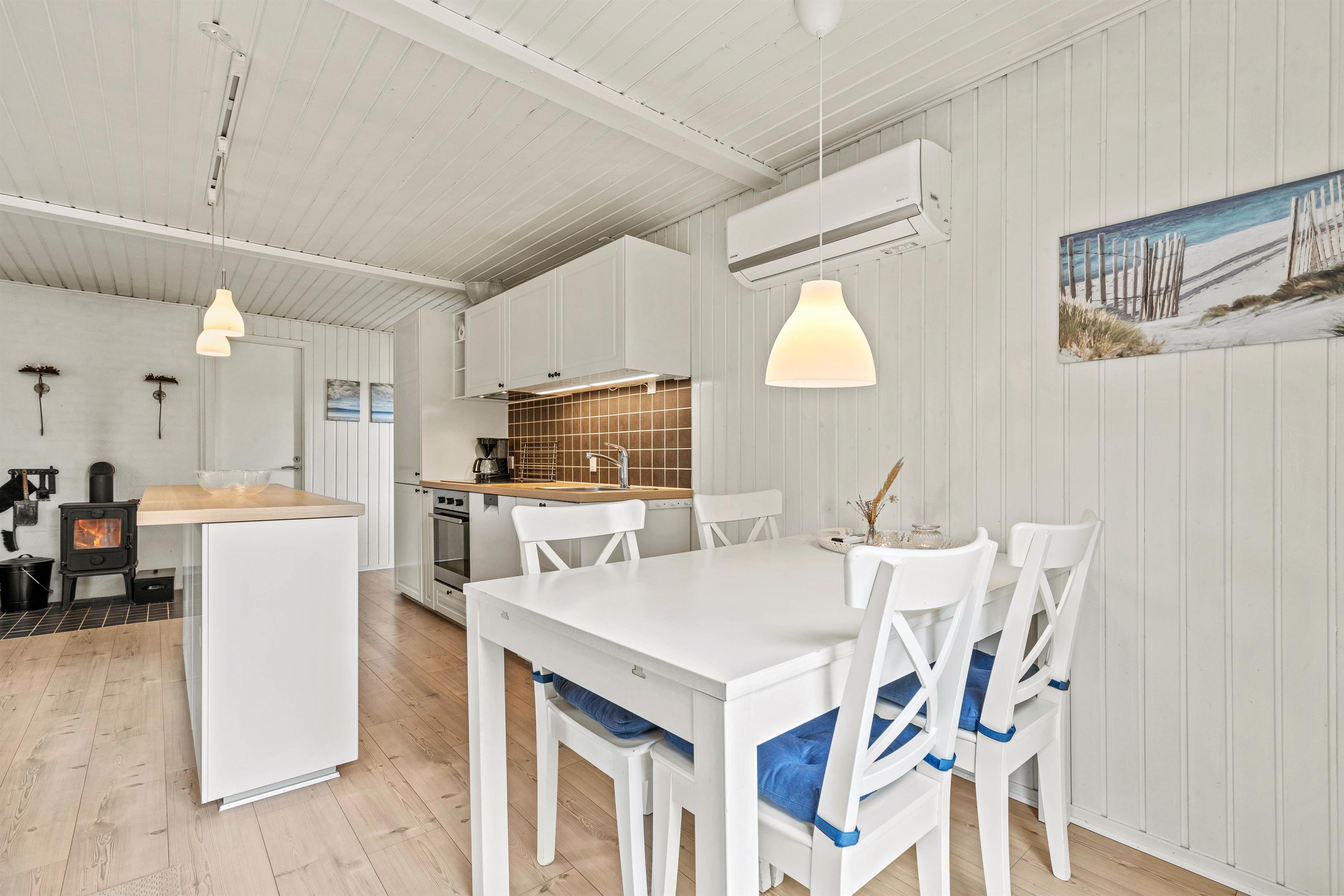 Dette lille hyggelige sommerhus ligger centralt afskærmet at klitter på Risvej 12 i Vejers. På i alt 68 m2 finder du alt hvad der er nødvendigt for en ferie ved havet. Den hyggelige stue og spisestue med integreret køkken er familiens mødested. Her kan alle slappe af på samme tid, tilberede mad eller kontakte vennerne. Brændeovnen sørger for den ægte feriestemning, der spreder et strejf af romantik og hyggelig atmosfære, især på køligere aftener.