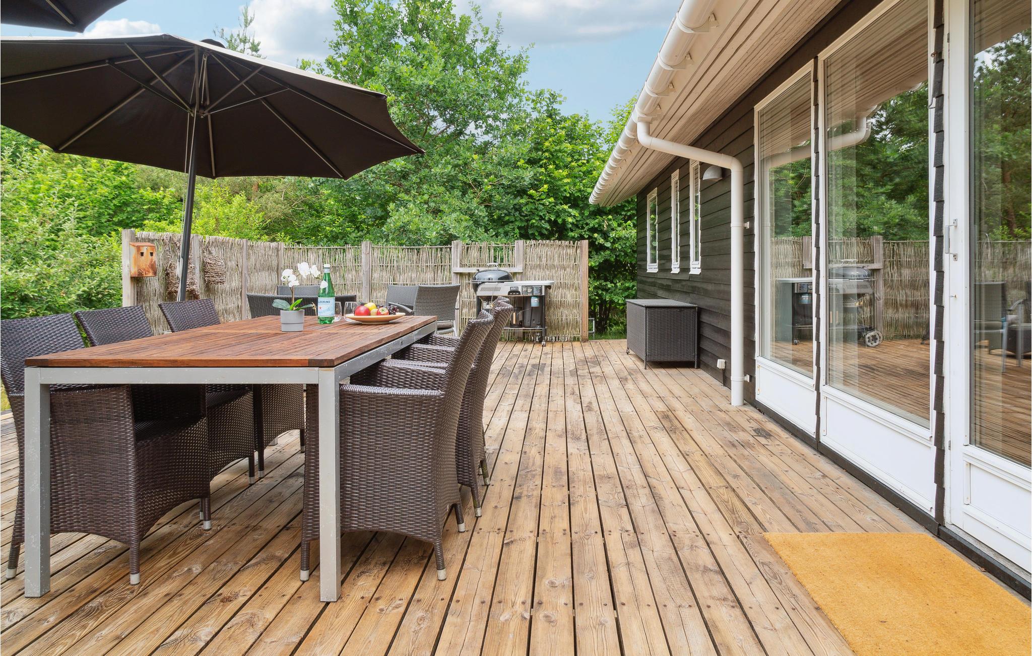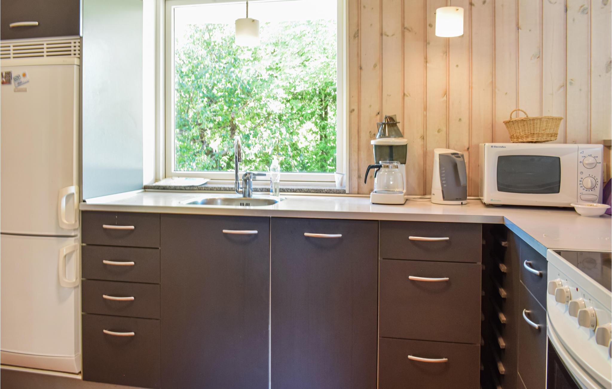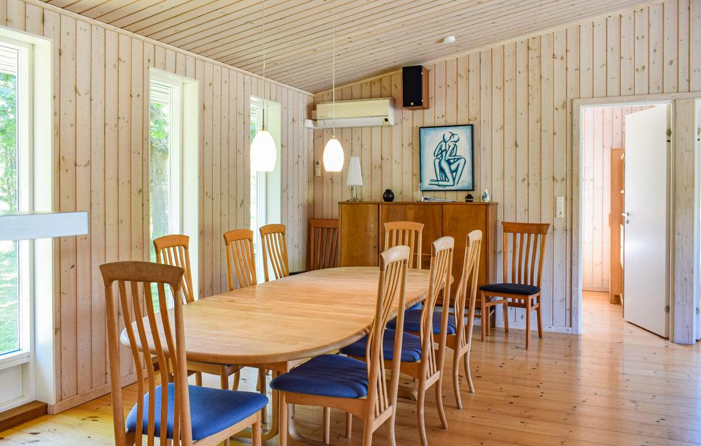 I gåafstand til fjorden og i et populært sommerhusområde ligger dette skønne sommerhus. Det er lyst og arkitektonisk flot indrettet med pæne møbler og øvrigt udstyr, der er tilpasset husets stil. Det åbne køkken ligger i forbindelse med stuen, hvorfra der er udgang til en stor terrasse. Der er fire gode soveværelser som er fordelt med to og to i hver sin ende af huset. To badeværelser hvoraf det ene har spabad samt adgang til sauna. Sommerhuset ligger på en dejlig naturgrund med god plads til leg.