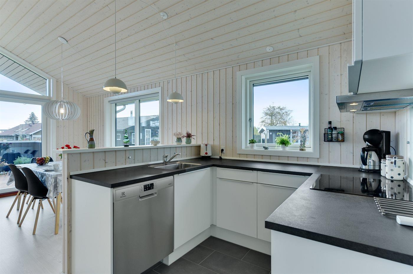 Køkkenet er udstyret med 1 køleskab. Der er 4 induktionskogeplader, varmluftovn samt opvaskemaskine.
