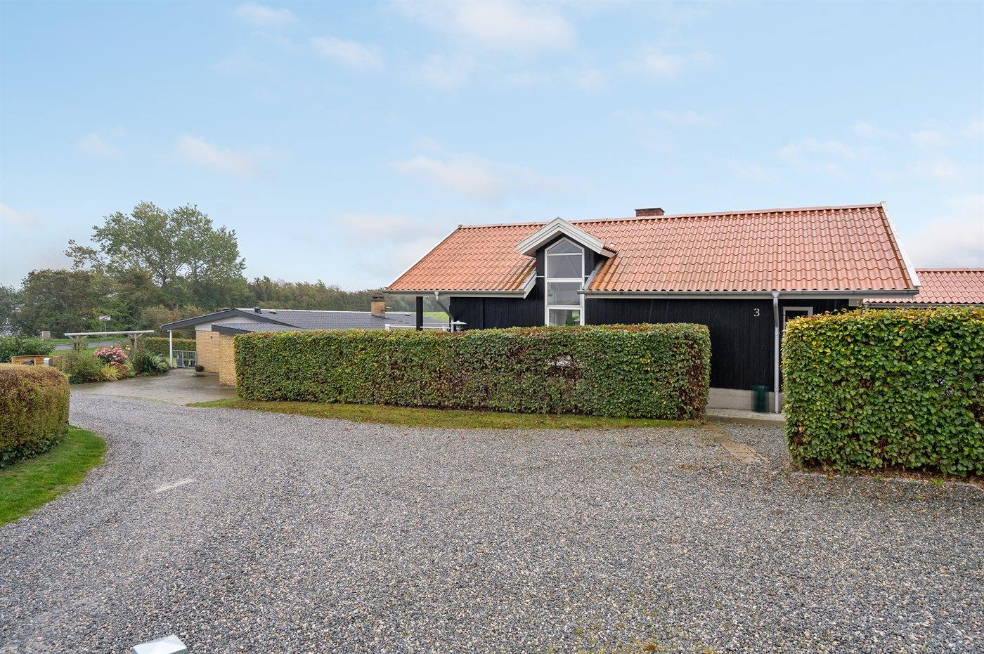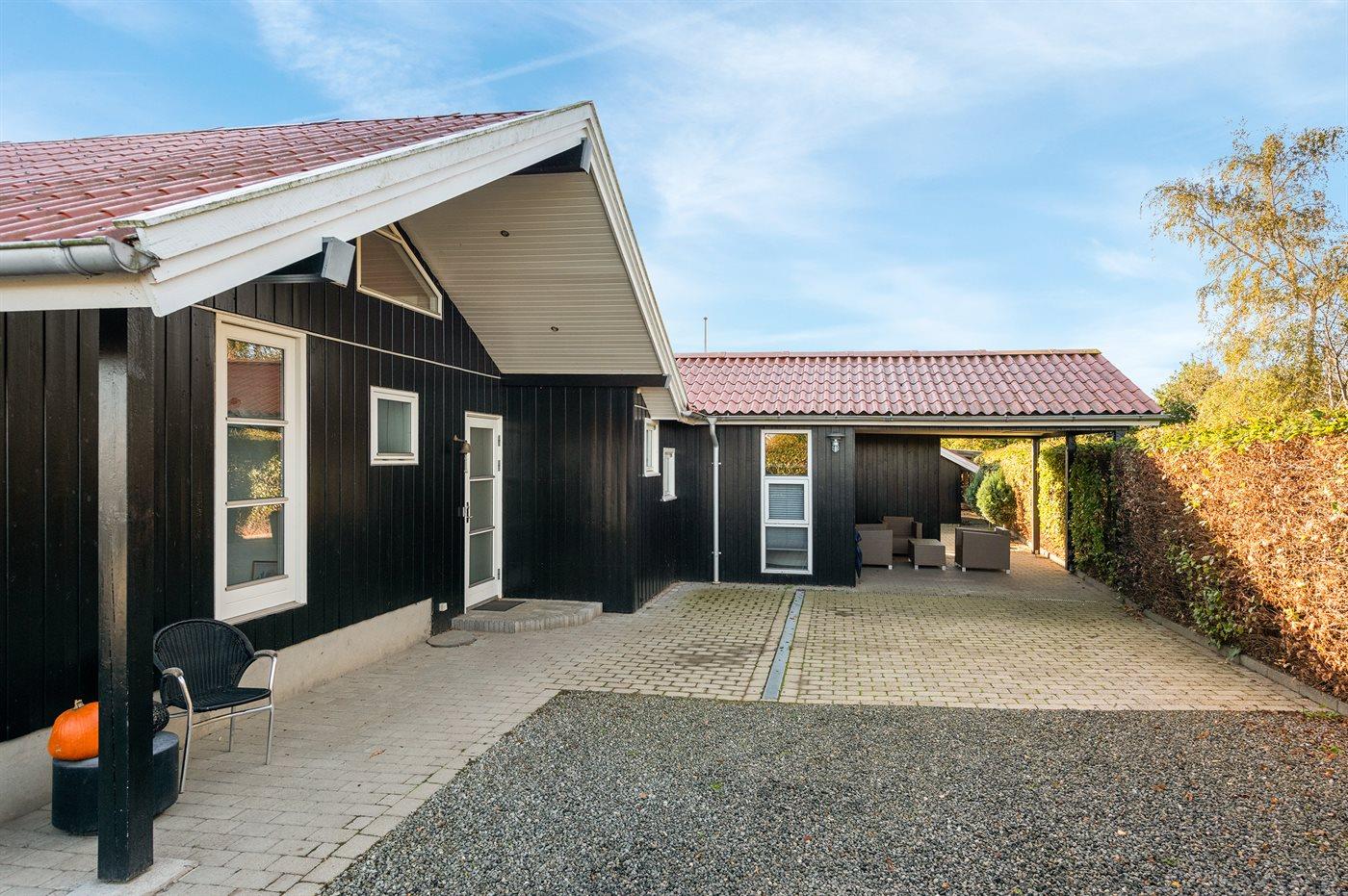 Ferieboligen er beliggende på en 970 m² stor havegrund. Der er 100 m til havet. Nærmeste forretning er beliggende i en afstand af 3000 m. Der er en golfbane i en afstand af 10000 m. Til ferieboligen hører åbent terrasseareal og 12 m² overdækket terrasse. Der er redskabsrum. Parkering ved ferieboligen.