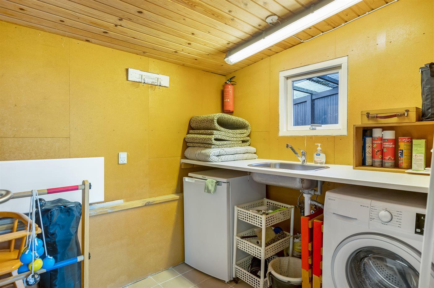 Køkkenet er udstyret med 1 køleskab. Der er 4 keramiske kogeplader, varmluftovn, mikrobølgeovn samt opvaskemaskine.