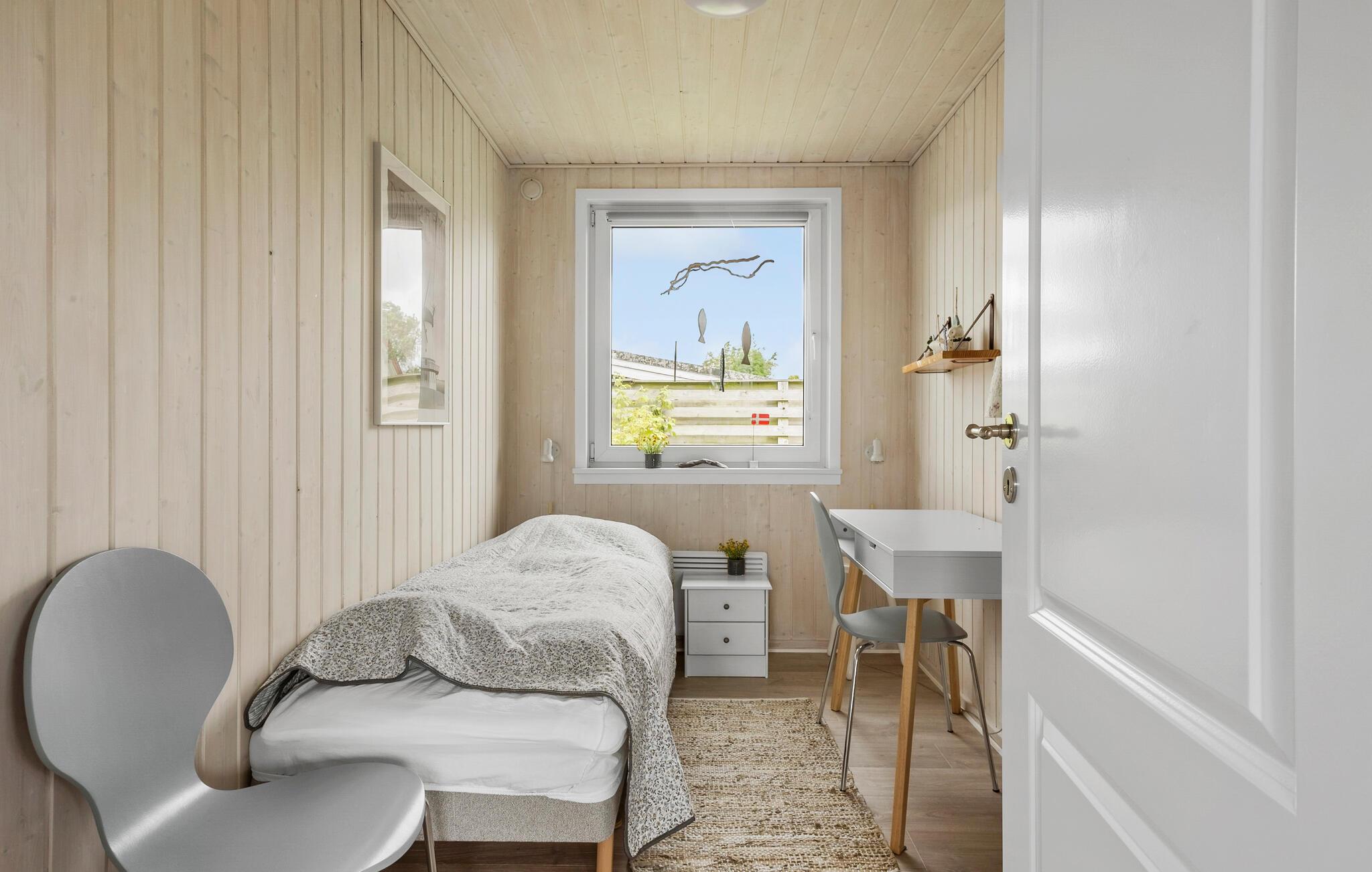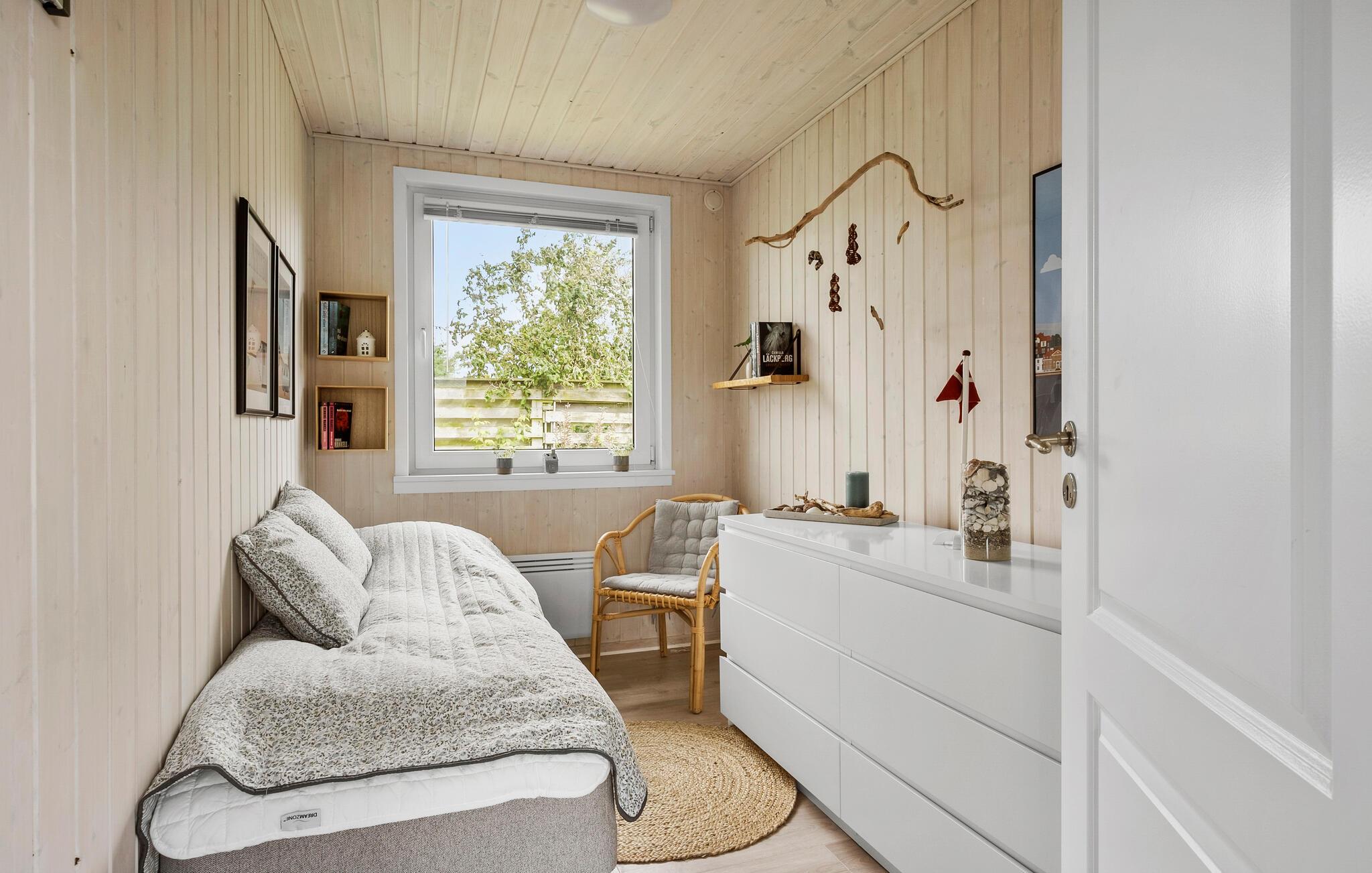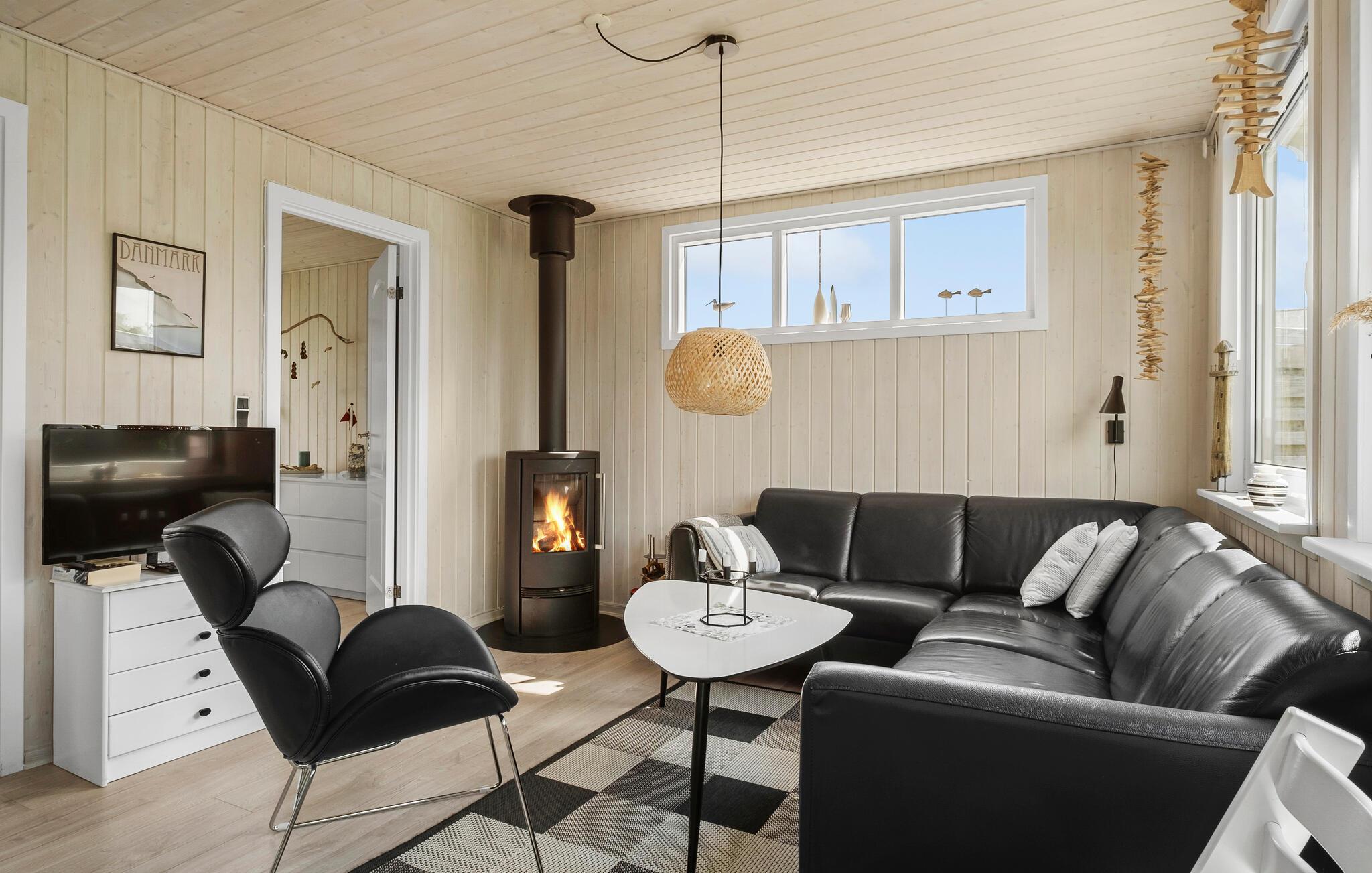 Der er ikke langt ned til den skønne sandstrand fra dette sommerhus. Her kan I have en hyggelig feriebase, hvor I kan slappe af og nyde nogle dejlige dage sammen. I hyggekrogen kan I lade batterierne op foran brændeovnen. Om aftenen kan I udvælge en god film, som I kan se fra sofaen. Køkkenet er aflukket med en halvevæg af flot murstensværk. I haven er der lagt op til afslappende stunder, og hyggelige grillaftener.