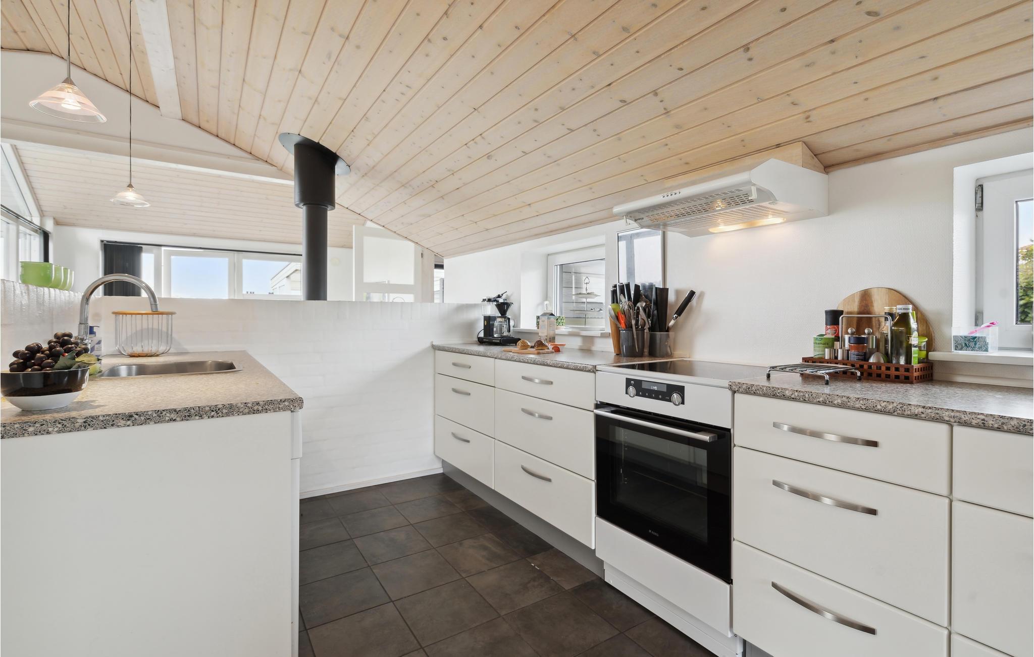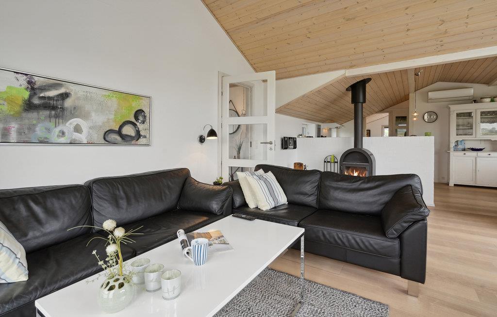 Velkommen til en helt igennem skøn beliggenhed ud til marker og kun nogle få minutters gang fra en familievenlig sandstrand. Her kan I se frem til en lys og åben bolig med stilrene indretningsløsninger og gode faciliteter. Dagens fælles aktiviteter finder sted i den store, hyggelige stue, hvor I kan nyde den fantastiske udsigt gennem det brede vinduesparti og læne jer godt tilbage i sofahjørnet med gode bøger eller et brætspil. Oven på en lang, frisk gåtur eller et dyp ved stranden er det rart at komme tilbage og få varmen foran ilden i brændeovnen.