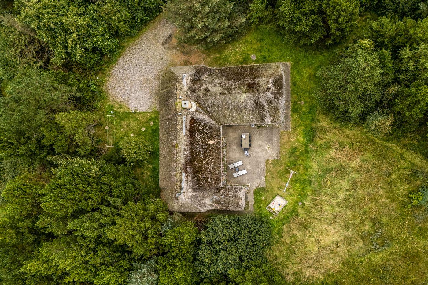 Dette velholdte sommerhus i sten med stråtag, bygget i 1993, ligger på en meget stor og ugenert naturgrund, omgivet af træer og buske. Til huset hører en stor terrasse med havemøbler.