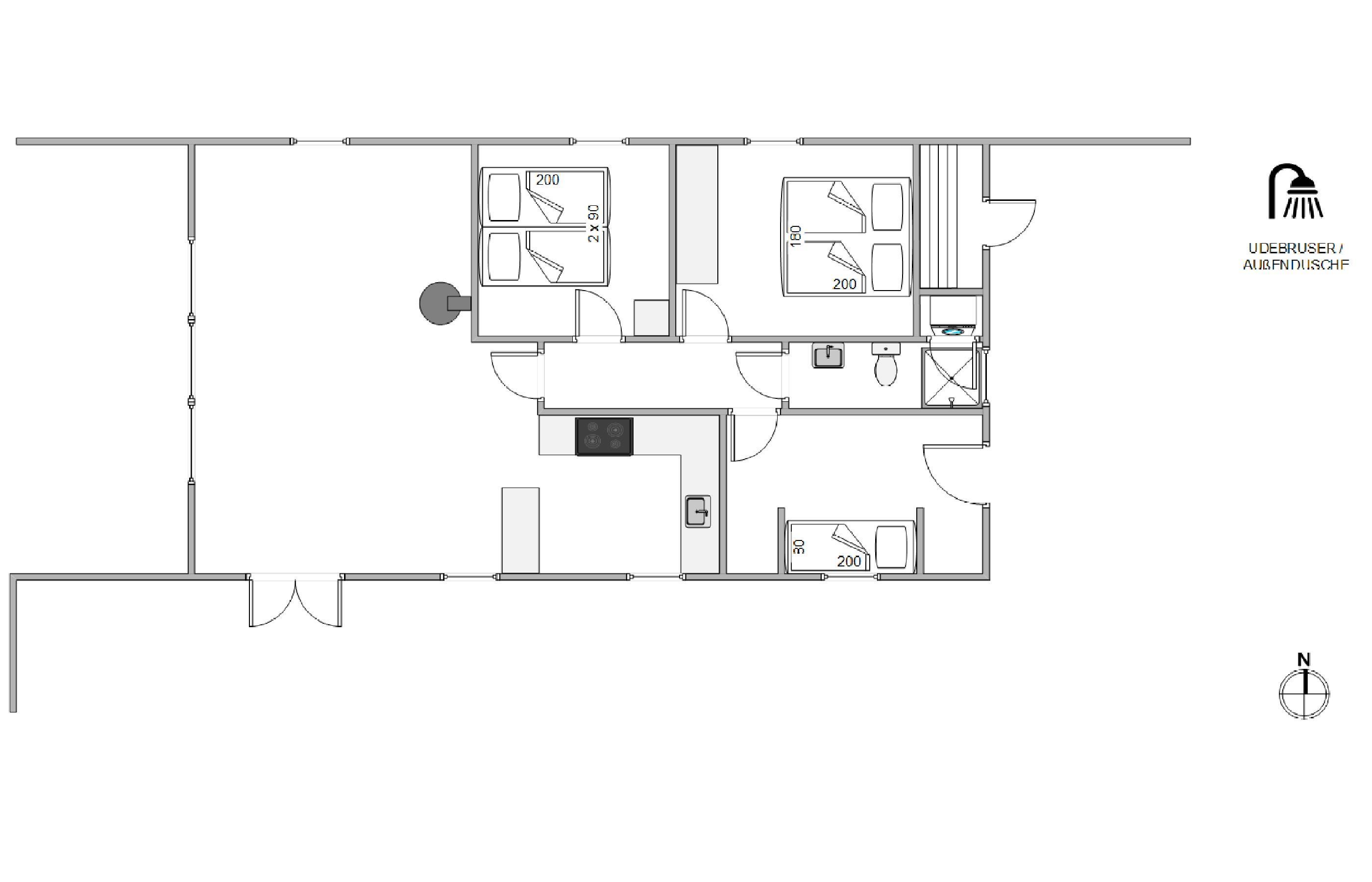 Det flotte og kuperede udeområde råder over en skøn udebruser med både varmt og koldt vand. Udebruseren kan bruges fra april måned og frem til november måned. På de læ-fyldte træterrasser med tilhørende havemøbler, kan I uforstyrret nyde udsigten ud over det omkringliggende landskab.