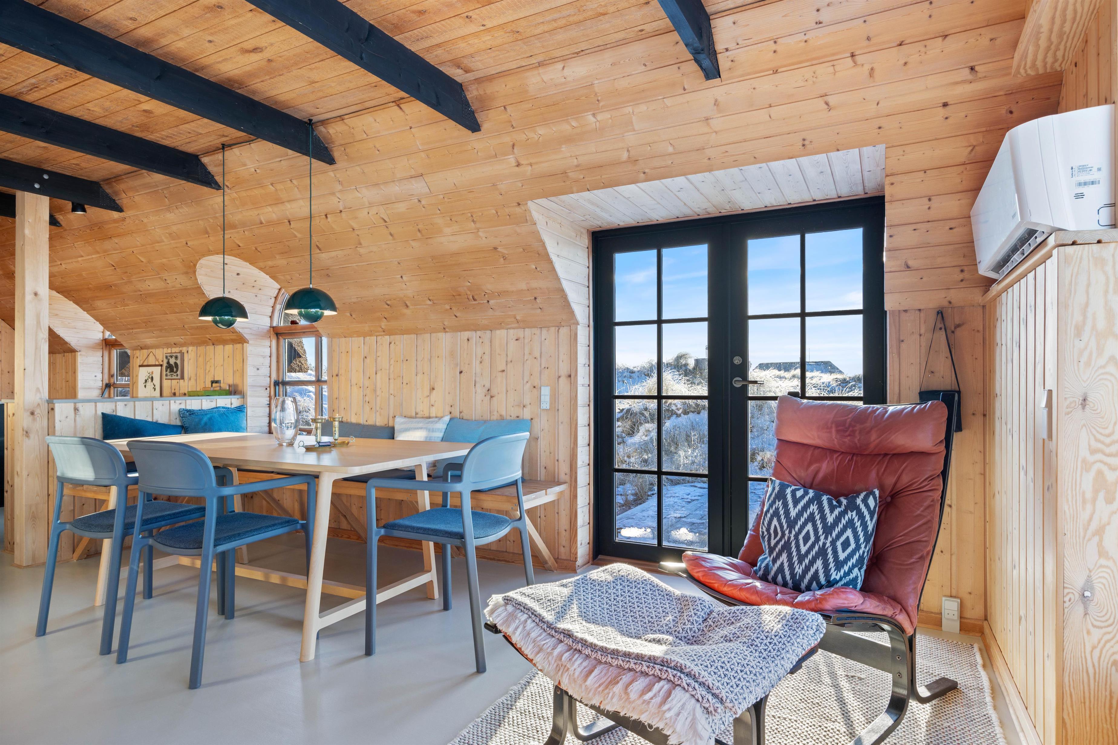 Feriehusets store og skønne vinduesparti i stuen mod vest gør, at man nærmest føler man er i ét med naturen. En enestående ramme for at holde ferie midt i det unikke klitlandskab. Den hyggelige spiseplads ligger i åben forbindelse med køkkenet og stuen som derudover er indrettet med pejs med indsats og tv med parabol. Her kan I yderligere hygge jer med spil, en god bog eller med at planlægge resten af ugens aktiviteter.