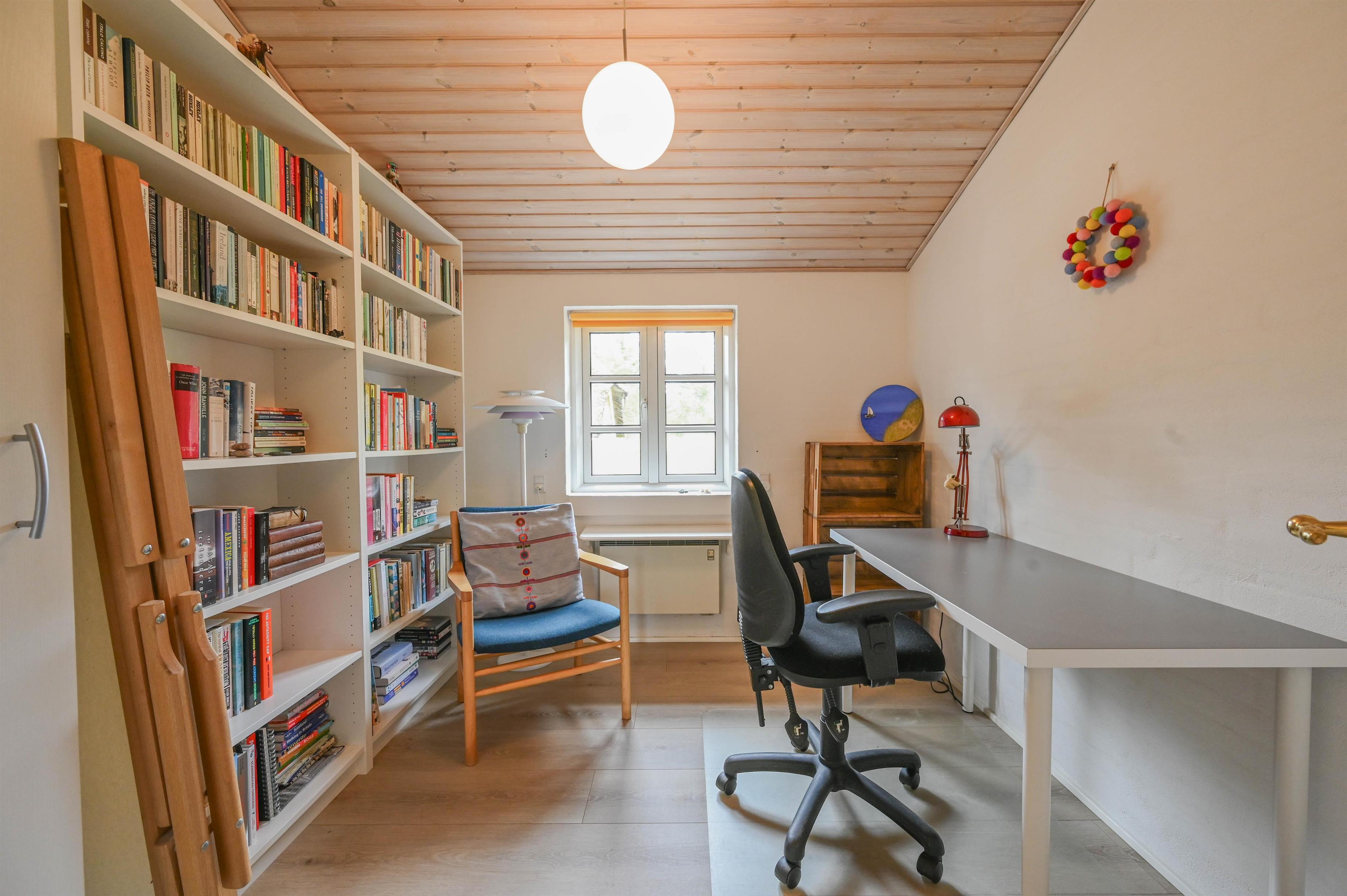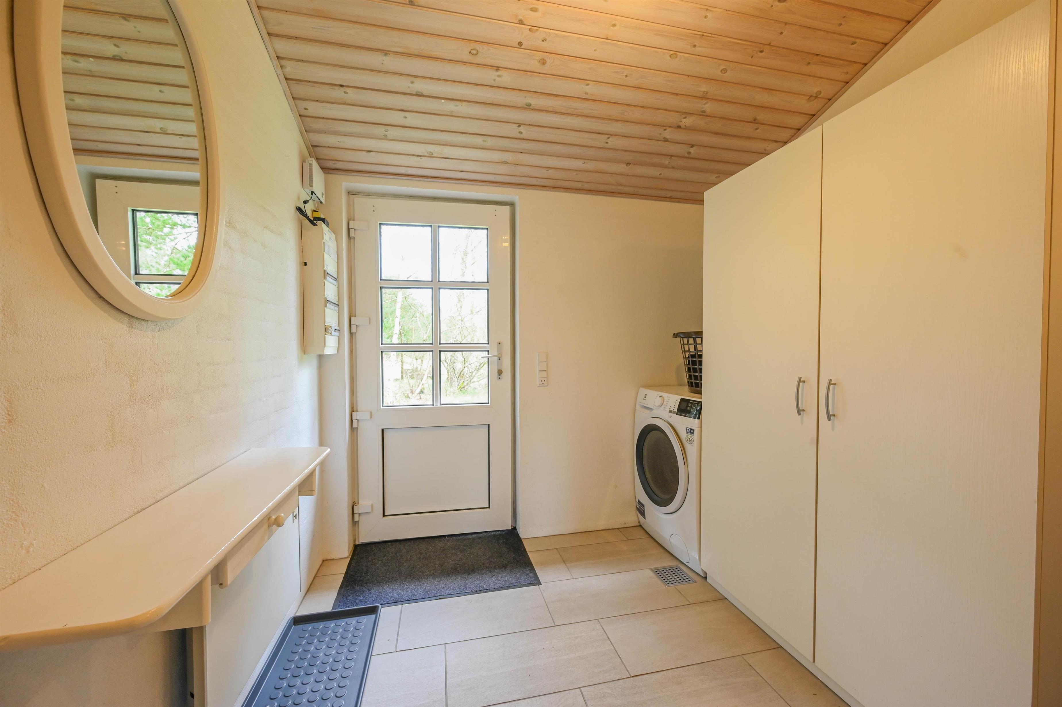 I husets østlige ende finder du entré med vaskemaskine og tørretumbler, et soveværelse med dobbeltseng, et kontor med skrivebord samt et stort badeværelse med bruseniche og sauna.