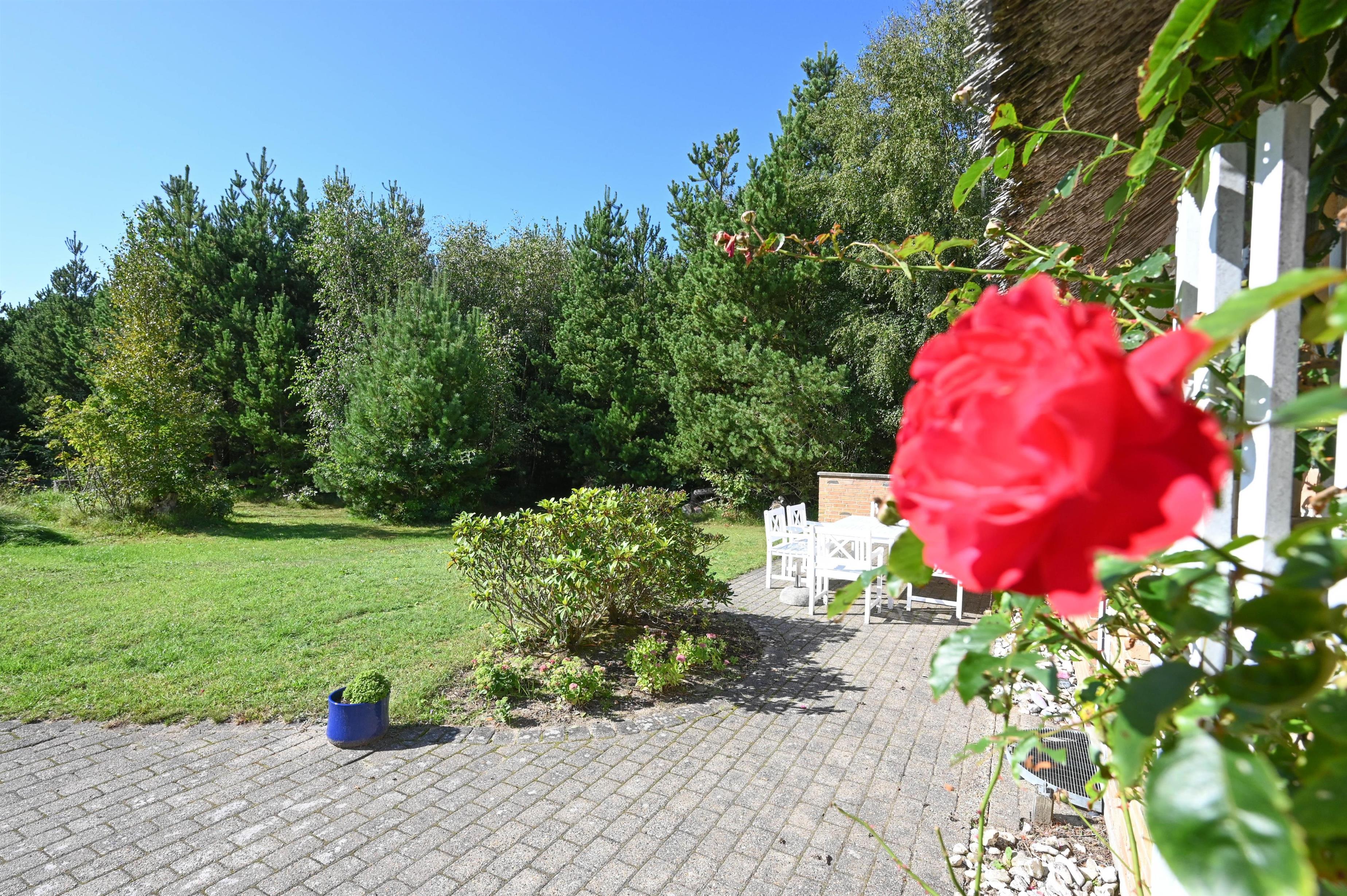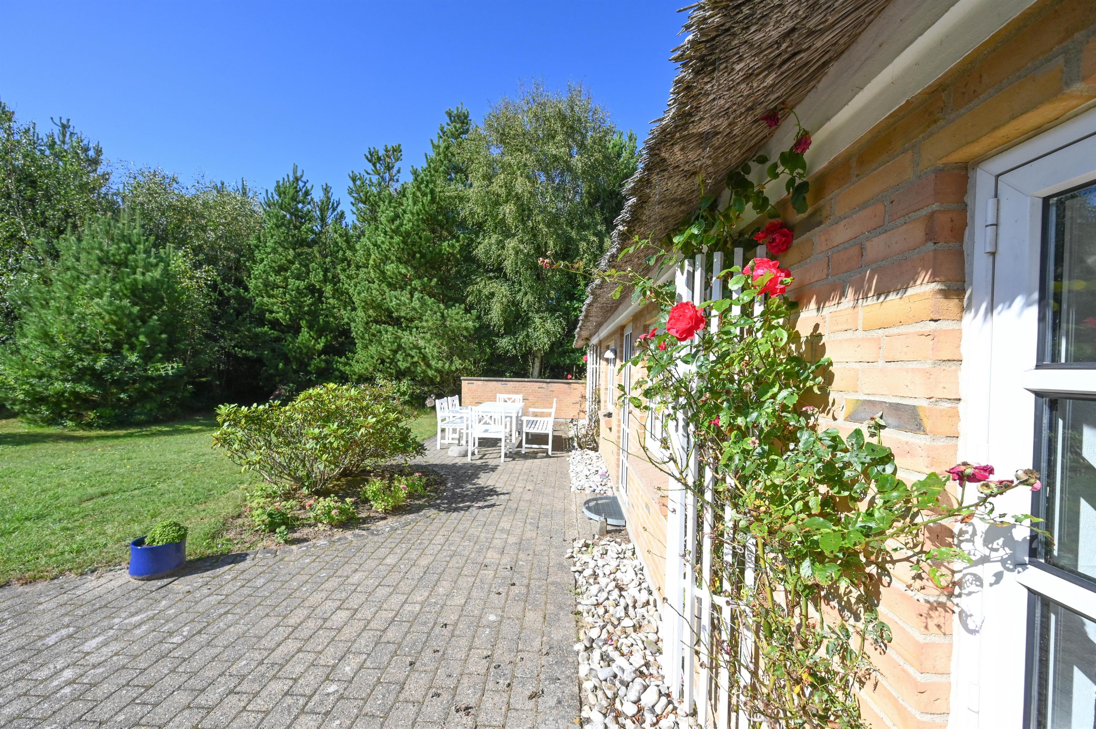 Huset ligger på en stor grund, der byder på både privatliv, læ og masser af fred – og fra den sydvendte terrasse kan du nyde solen dagen lang.