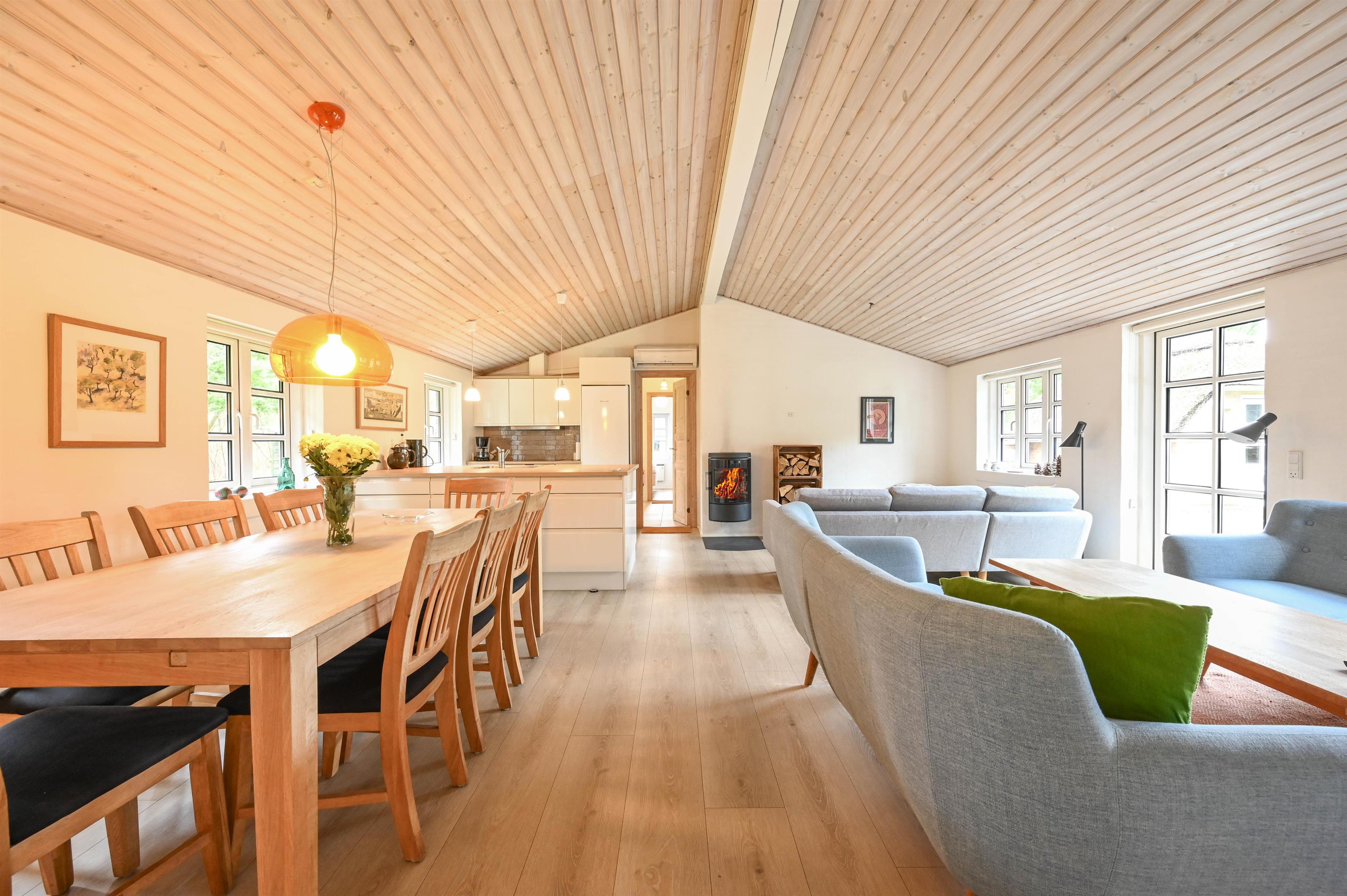Midt i huset ligger det lyse og åbne køkken/alrum i forbindelse med en stor opholdsstue med vægmonteret, energieffektiv brændeovn, centralplaceret varmepumpe og pæne, lette møbler. Herfra er der udgang til den solrige terrasse mod syd.