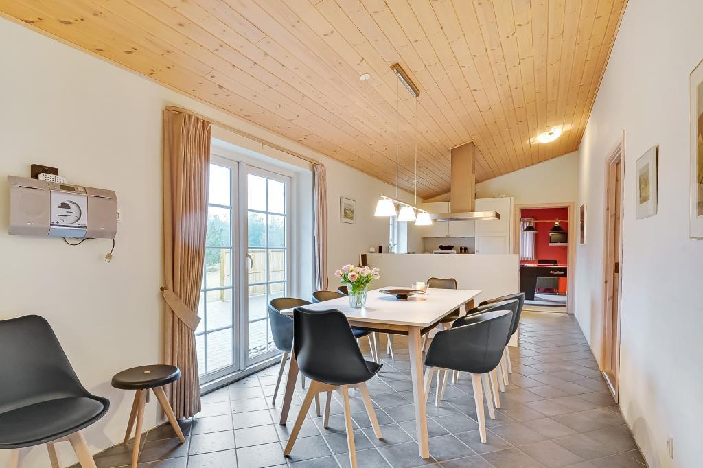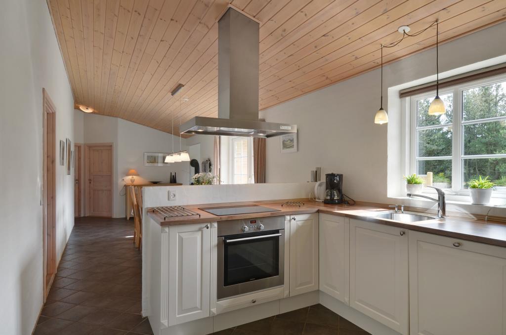 De lyse rum med gulvvarme skaber en behagelig atmosfære året rundt, og brændeovnen i stuen bliver hurtigt et naturligt samlingspunkt efter en dag i naturen eller ved havet.
