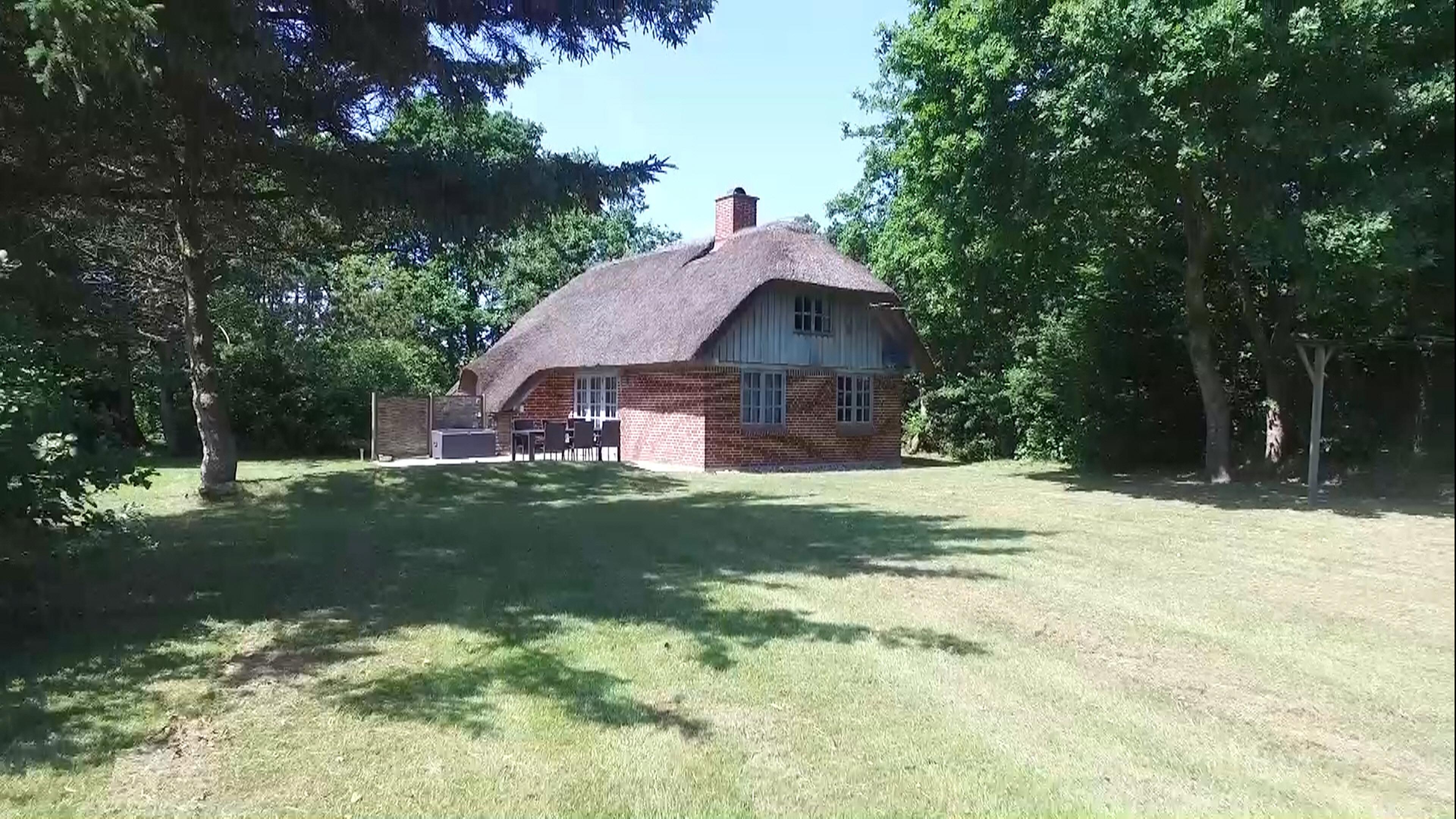 Et hyggeligt og klassisk feriehus med stråtag – omgivet af træer, natur og fred.