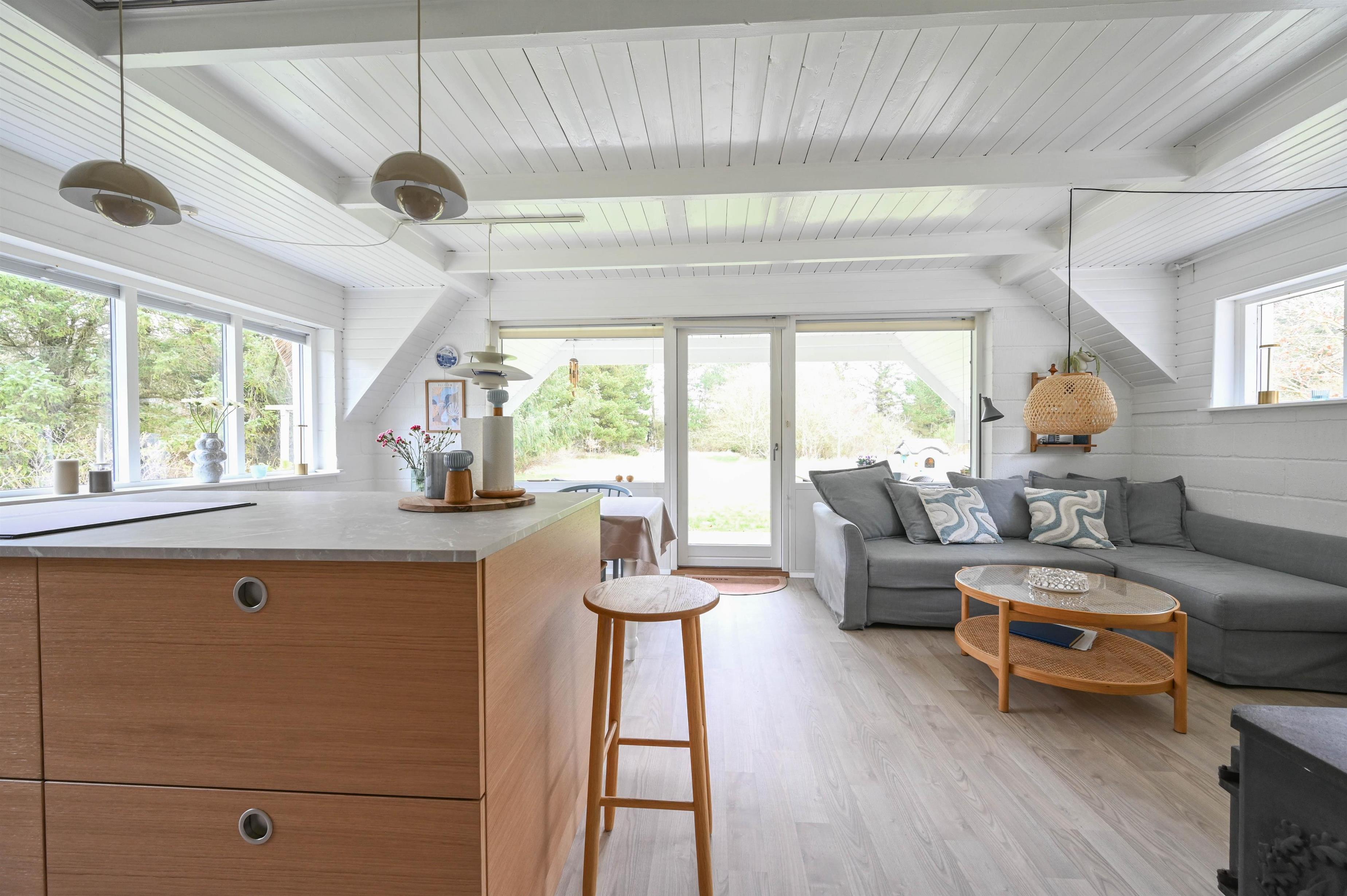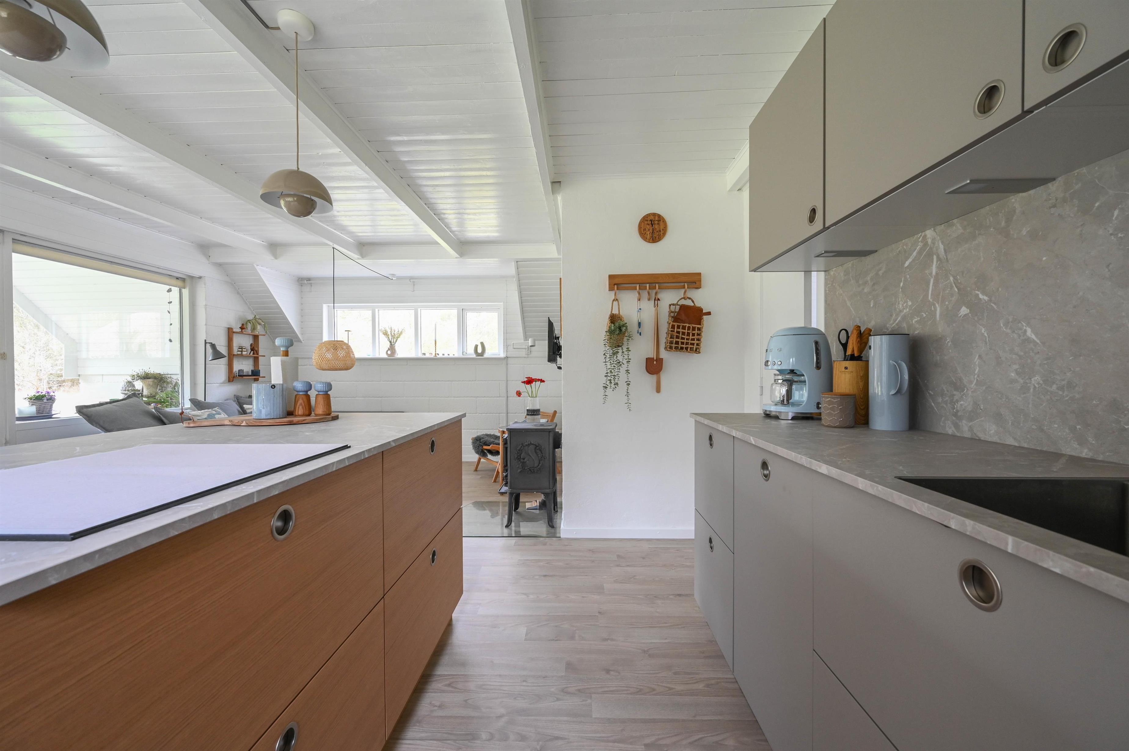 Den åbne køkken-/stueafdeling med synlige bjælker og brændeovn er husets naturlige samlingspunkt, hvor der er plads til både samvær og afslapning.