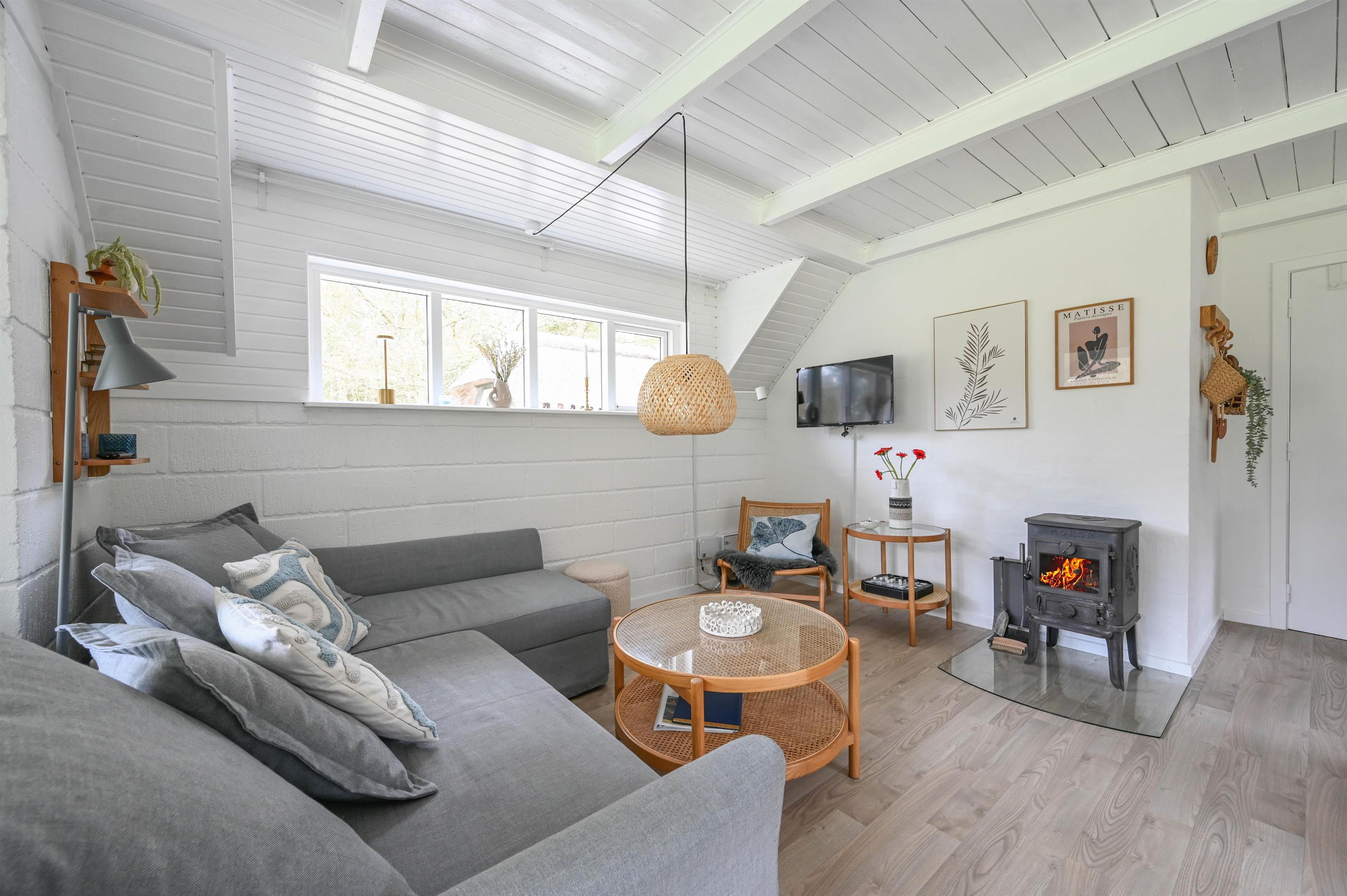 Stue med brændeovn, synlige bjælker og spiseplads