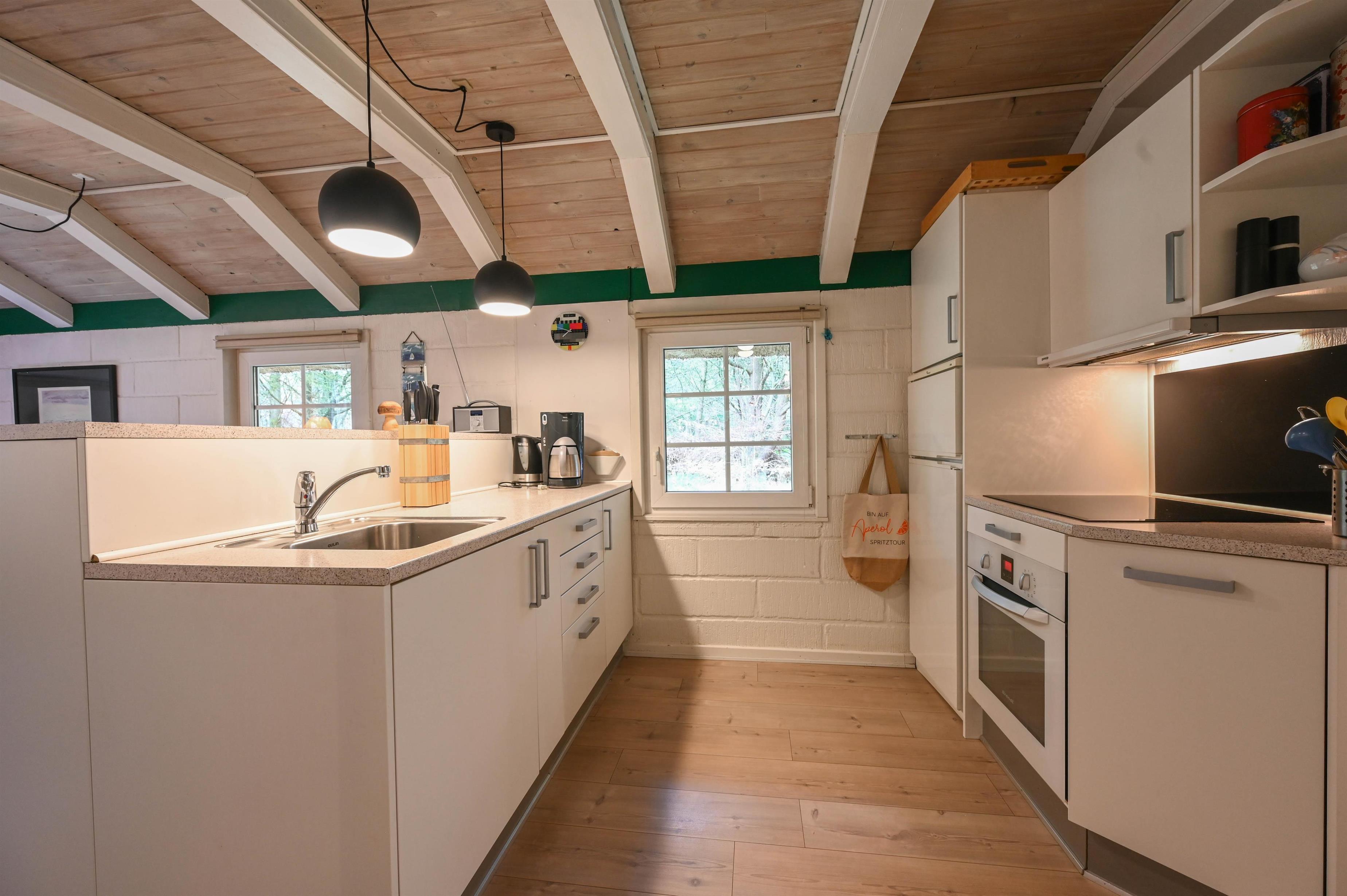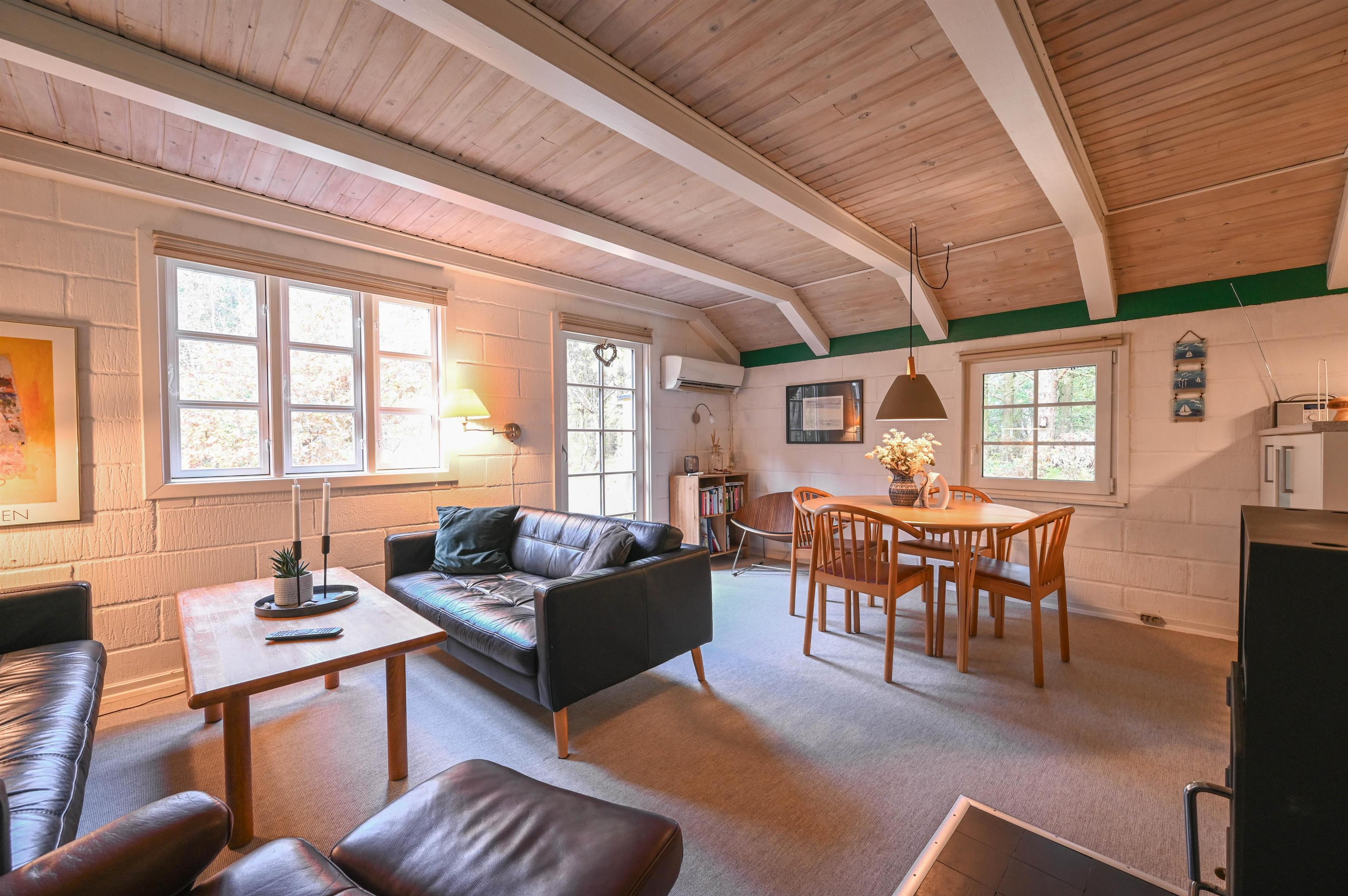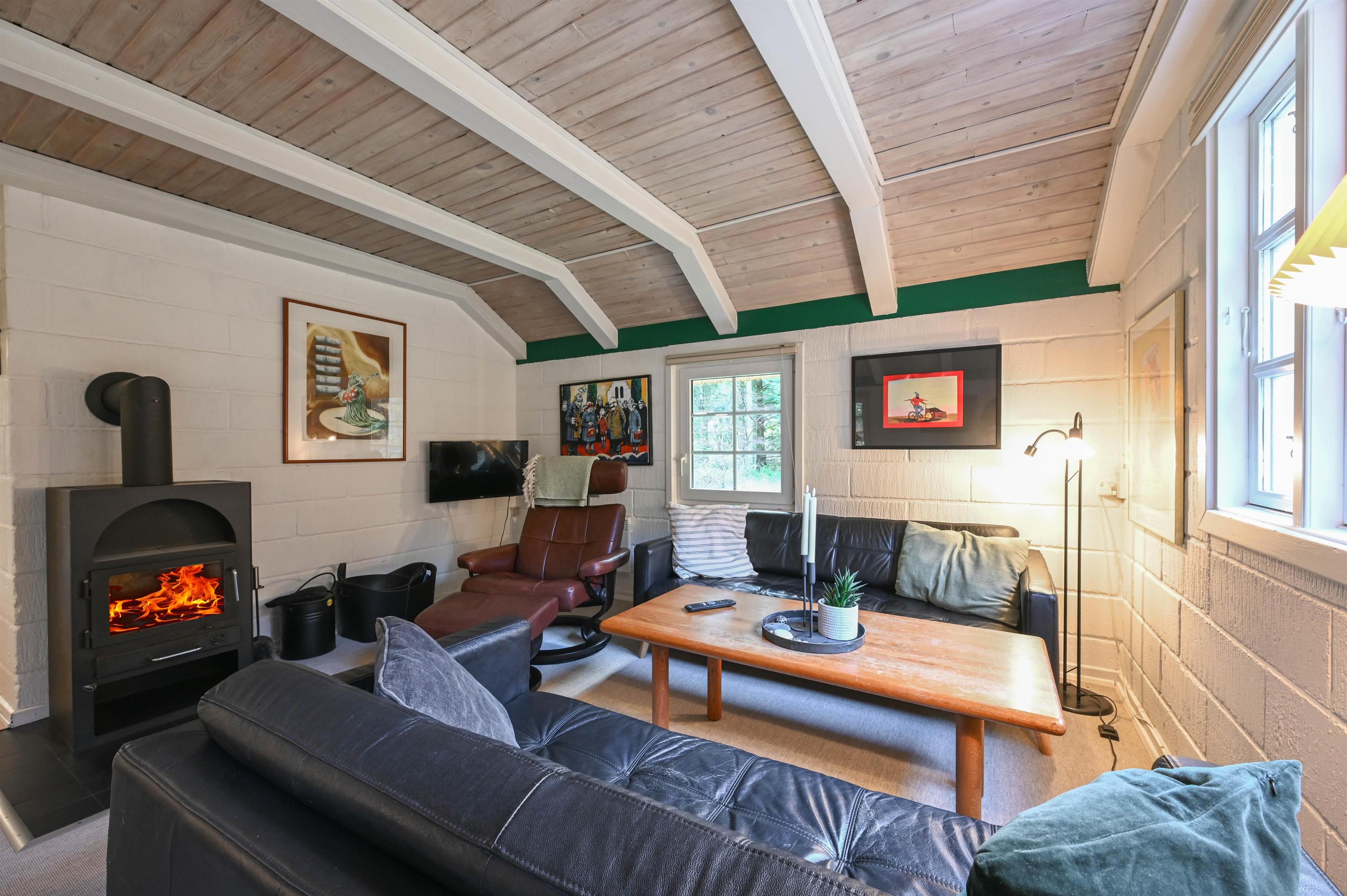I stuen skaber brændeovnen varme og hygge på de kølige dage, mens fladskærms-TV’et sørger for underholdning efter en dag i naturen.