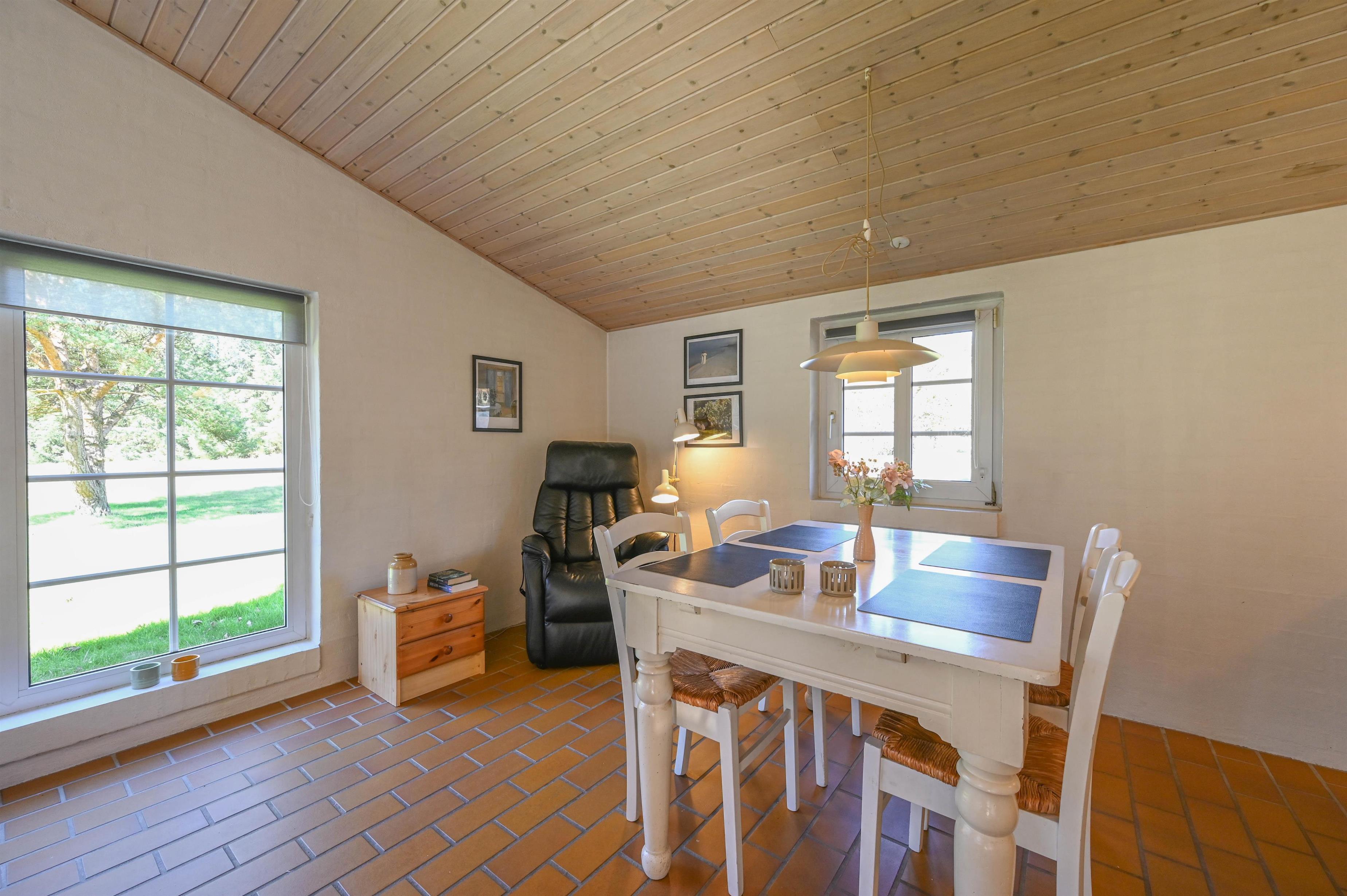 Her er der masser af plads til både afslapning og leg på den store græsplæne, og på terrassen kan du nyde solen, fuglefløjt og den friske vestenvind.