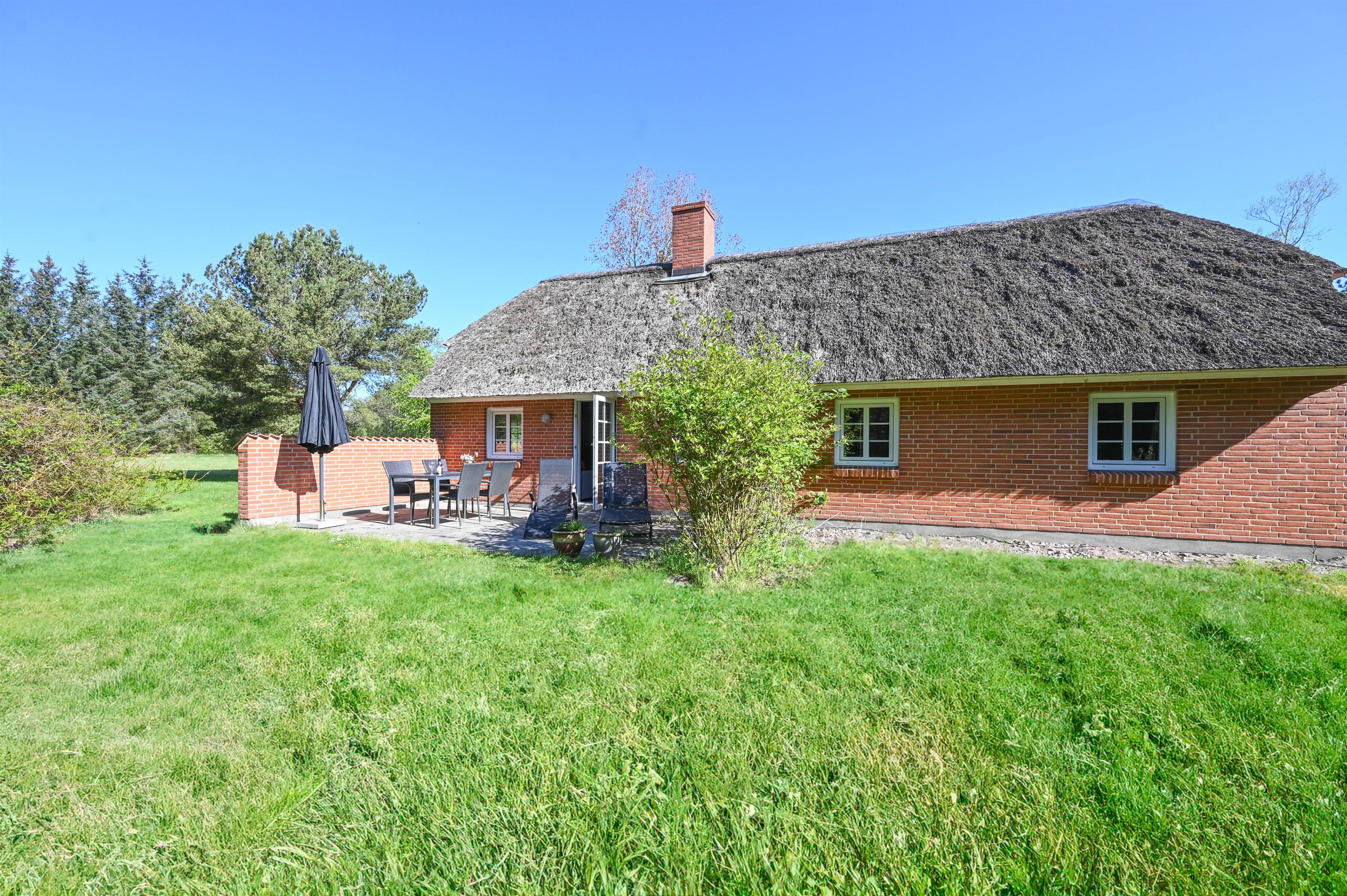 På en smuk og åben naturgrund på 5.000 m², omgivet af fred og grønne omgivelser, ligger dette hyggelige feriehus med røde mursten og klassisk stråtag – et ægte vestjysk sommerhus med atmosfære og sjæl.