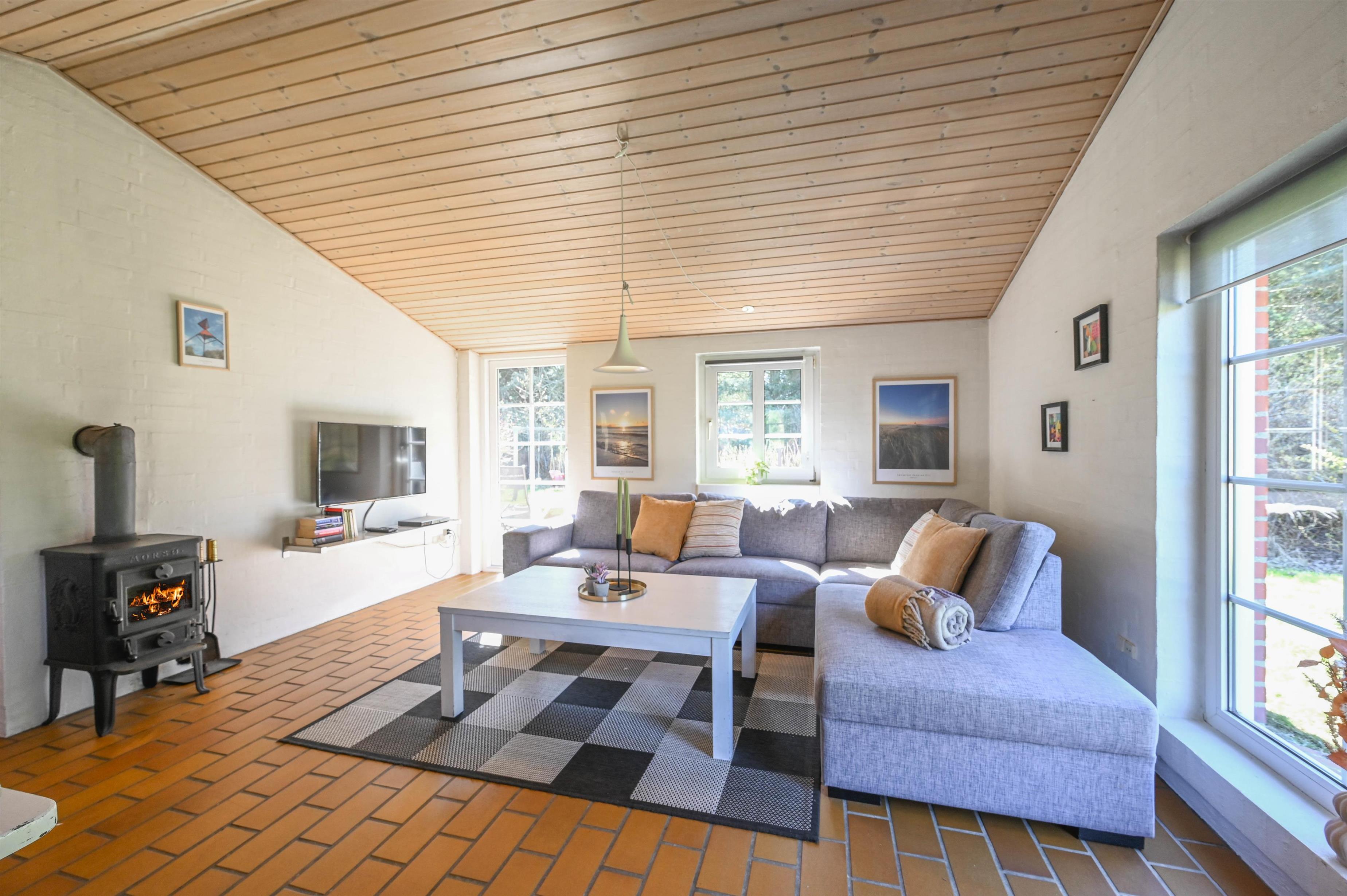 I stuen sørger brændeovnen for varme og hygge på de kølige dage – et oplagt sted at samles efter en lang dag i naturen.