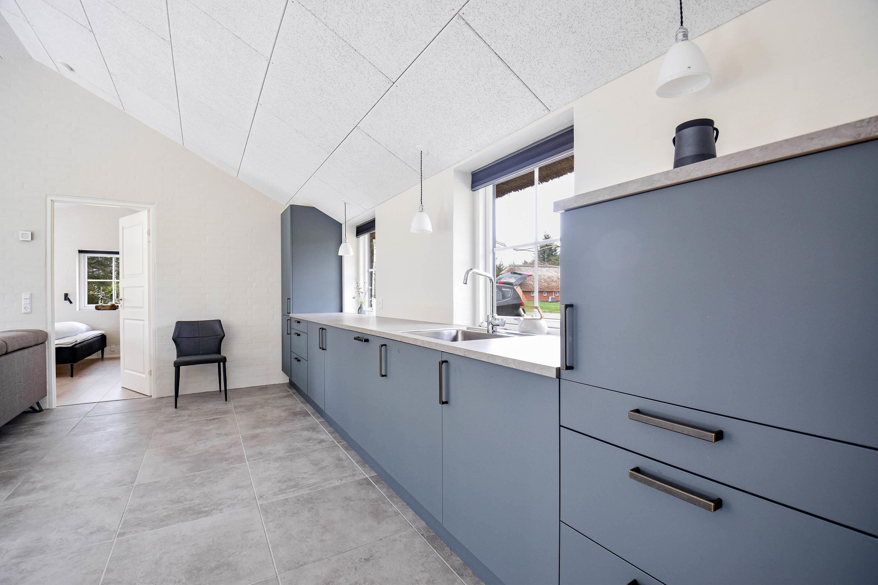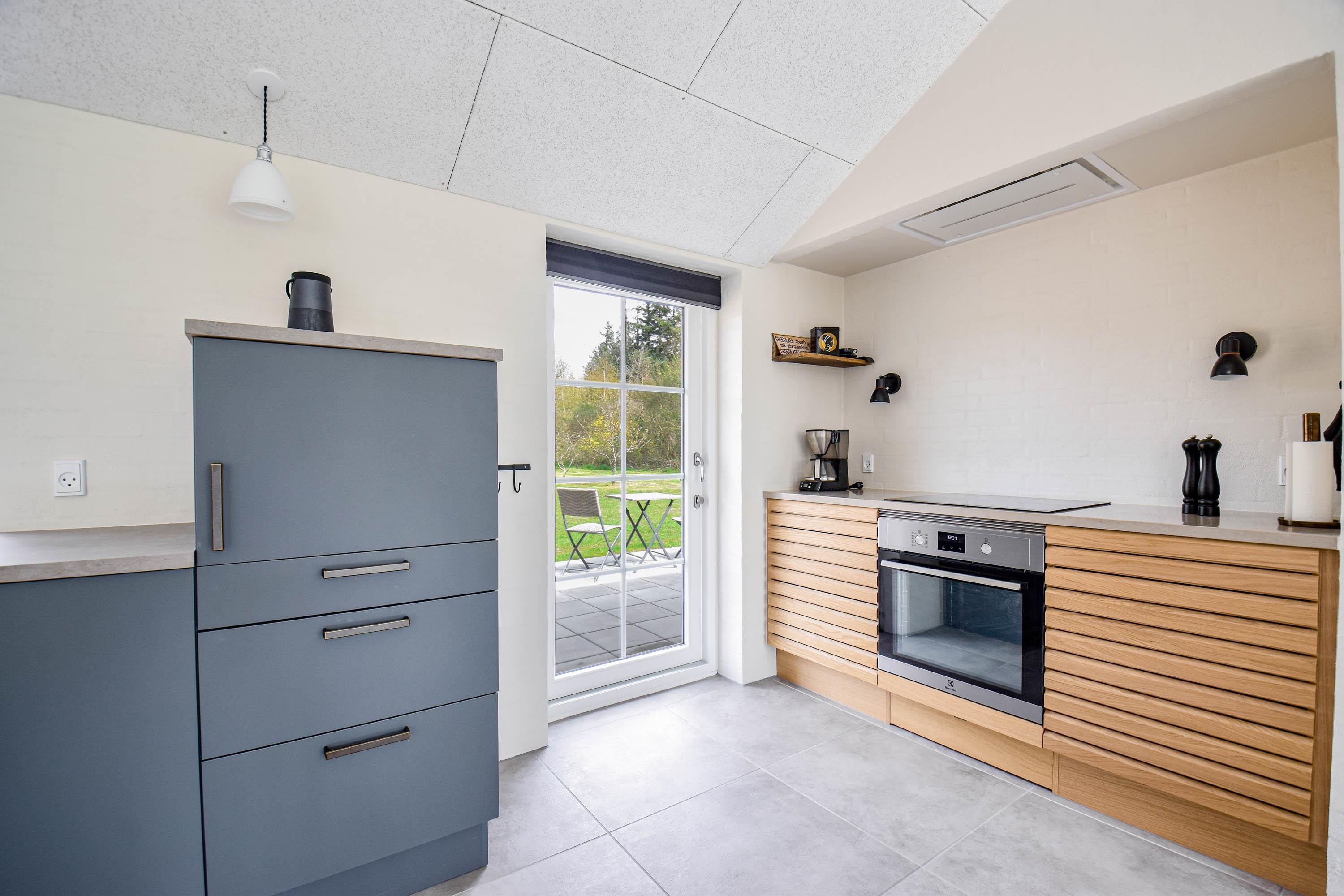 Køkkenet ligger i åben forbindelse med stuen, som er indrettet med komfortable møbler, brændeovn og udgang til den store sydvendte terrasse.