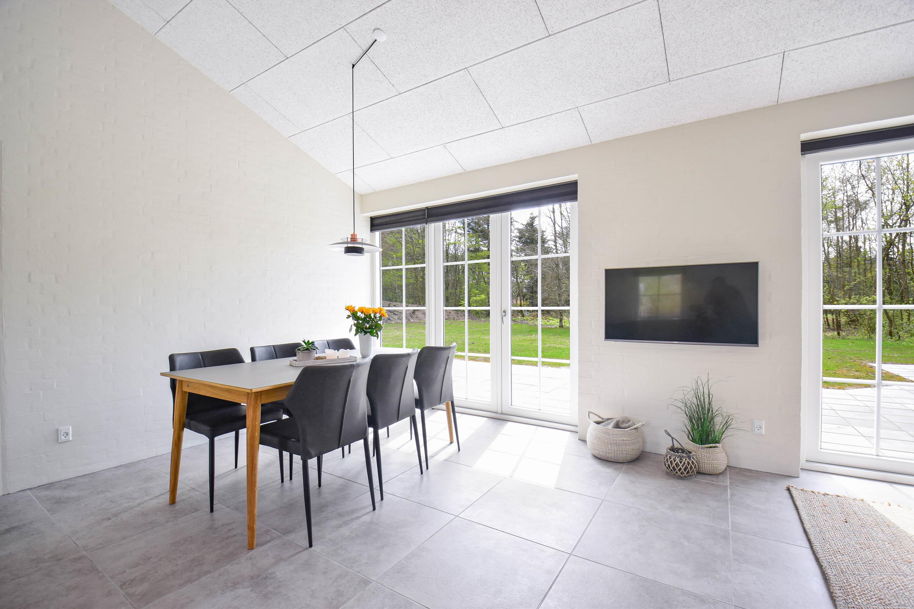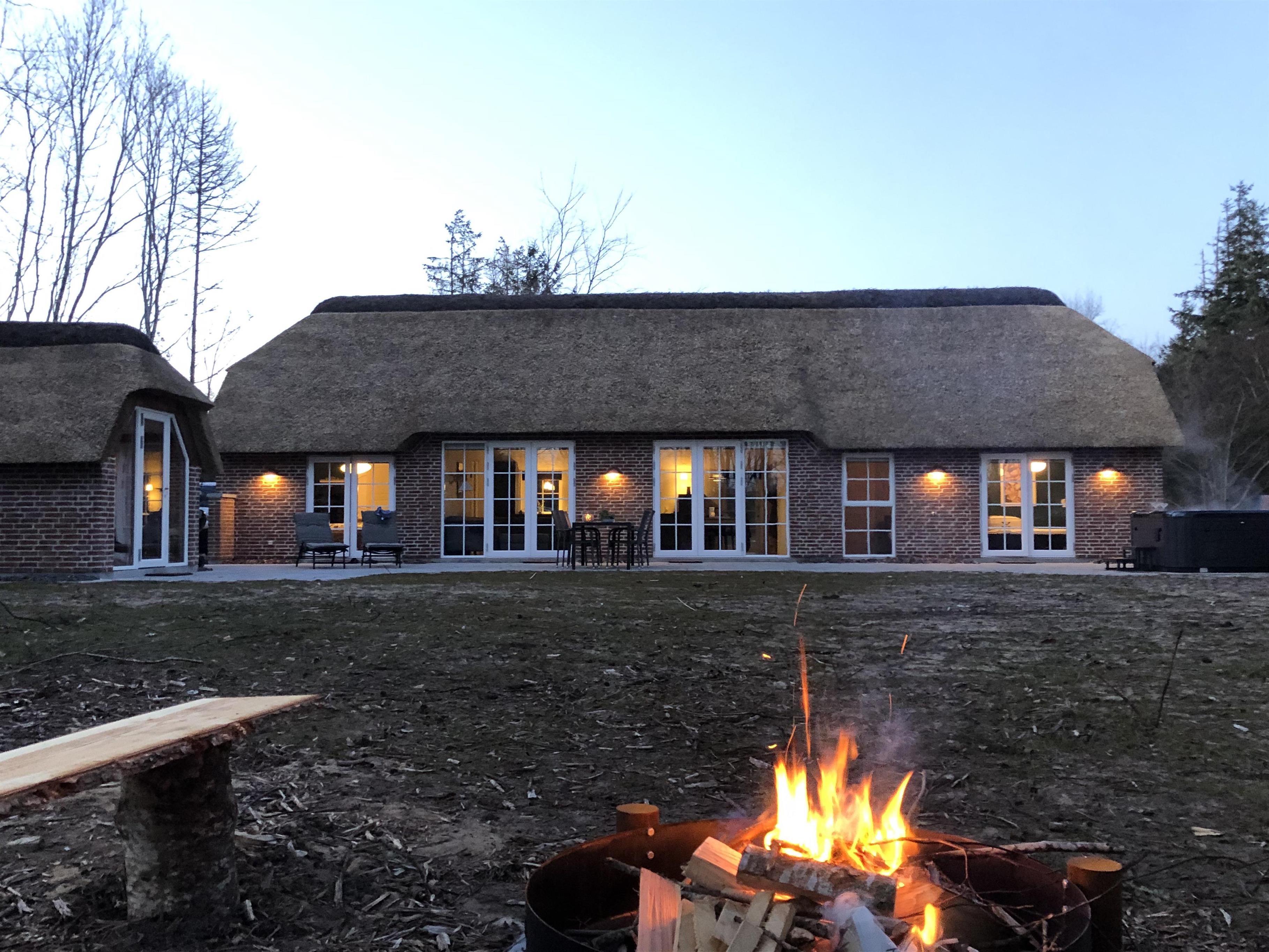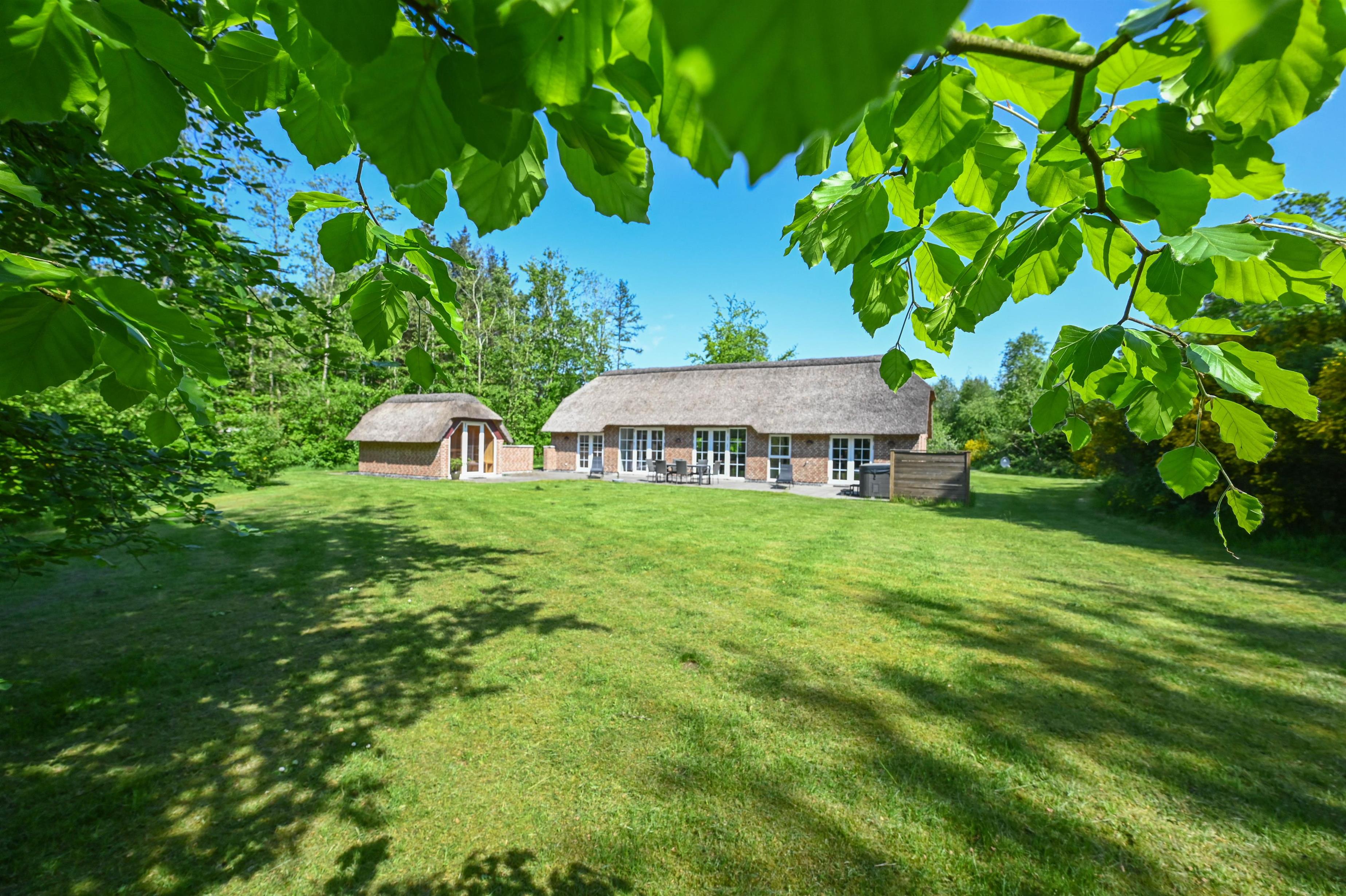 Fra terrassen har du naturen helt tæt på, og i udespaen eller den udendørs sauna kan du slappe af, mens du nyder den stille stemning og de grønne omgivelser.