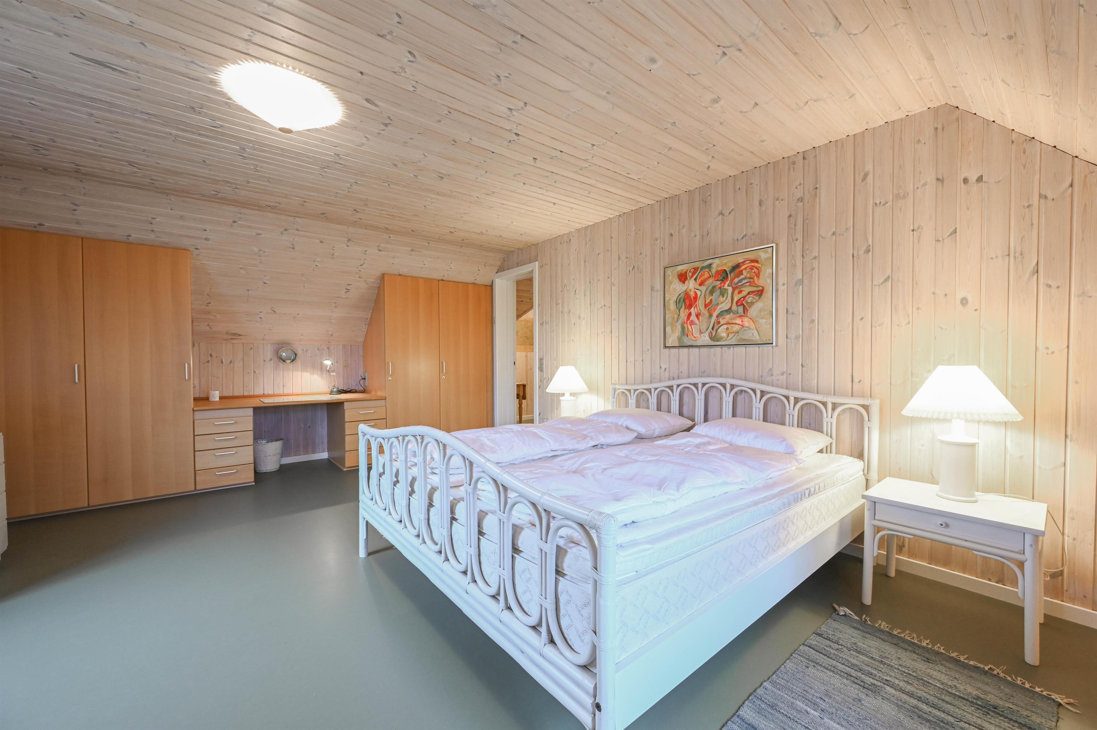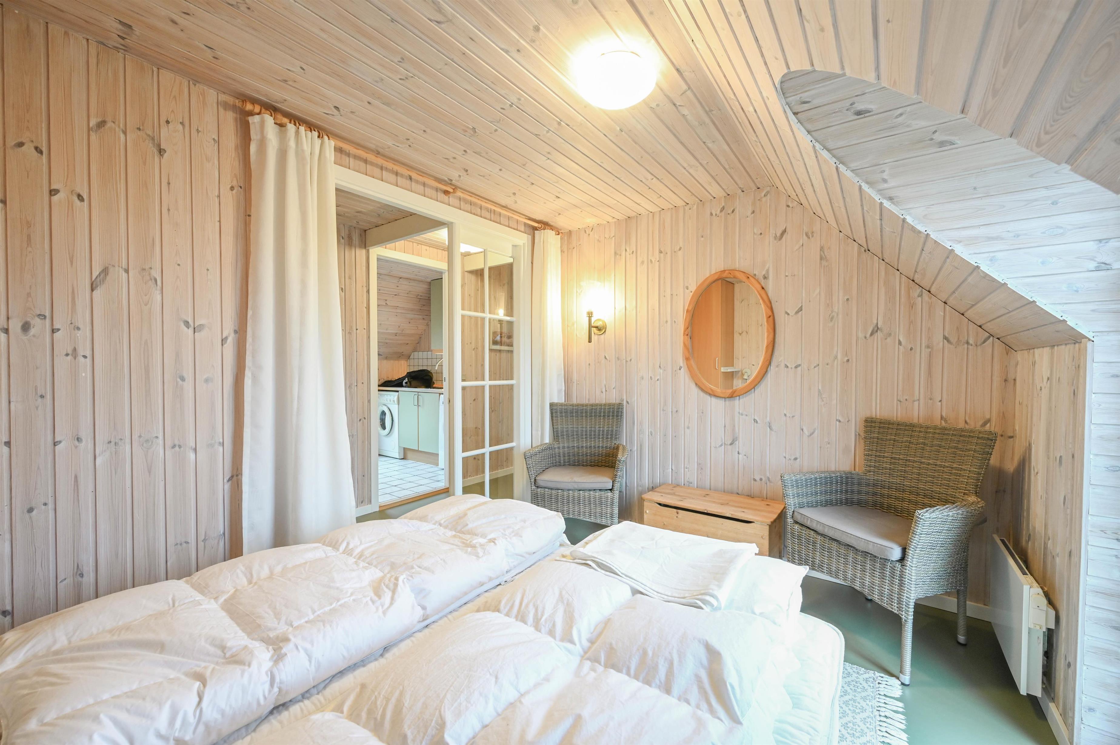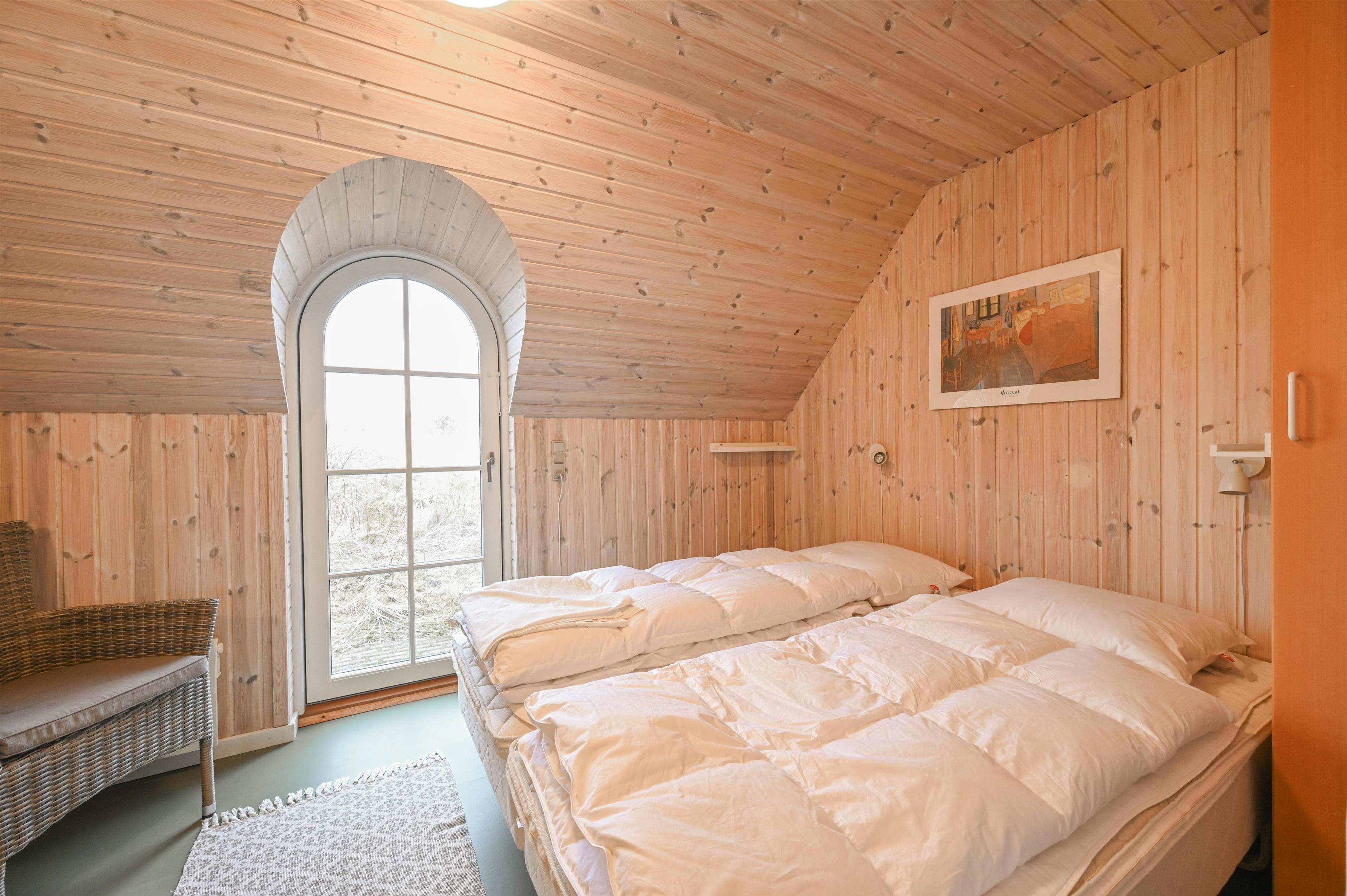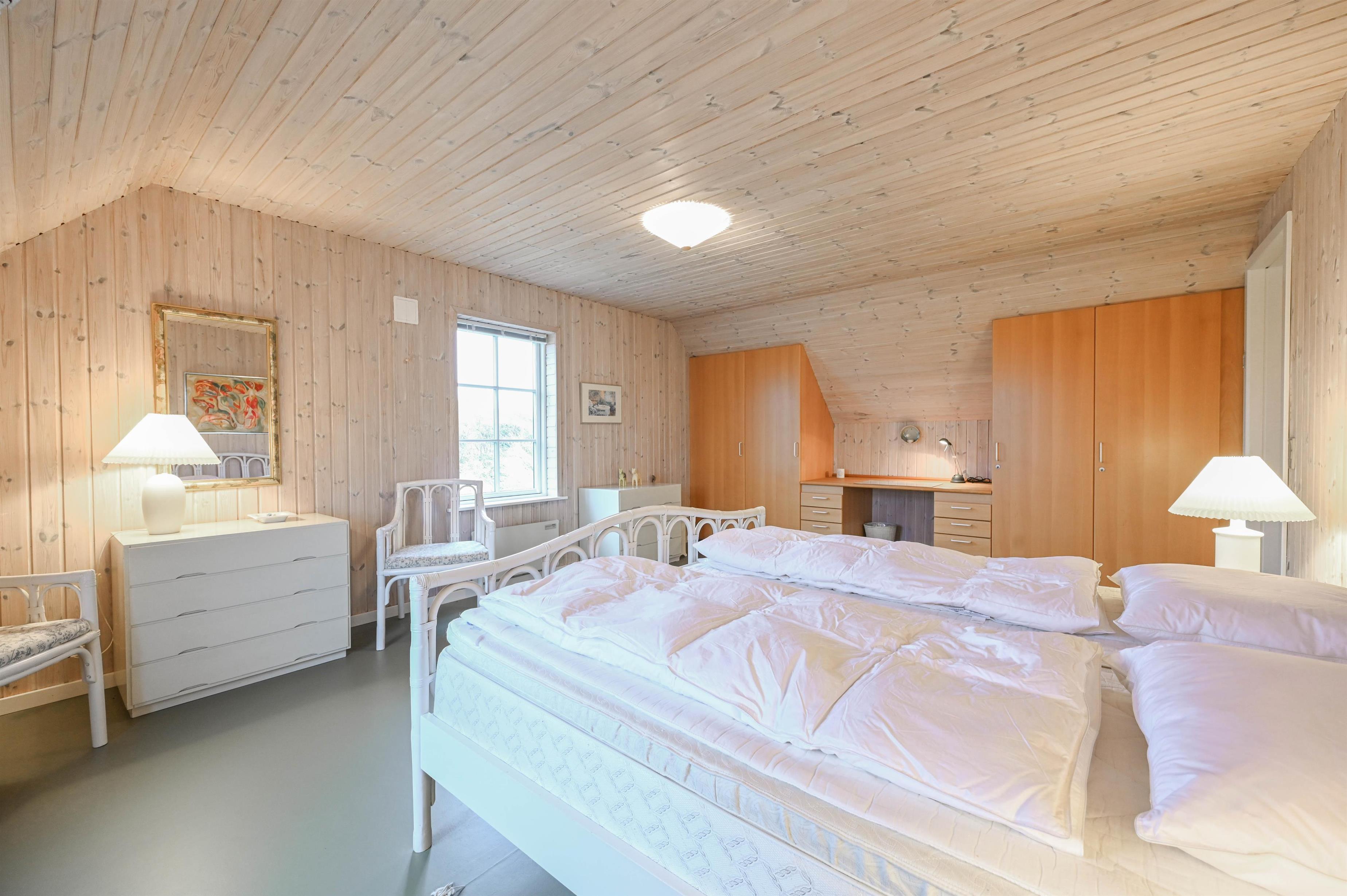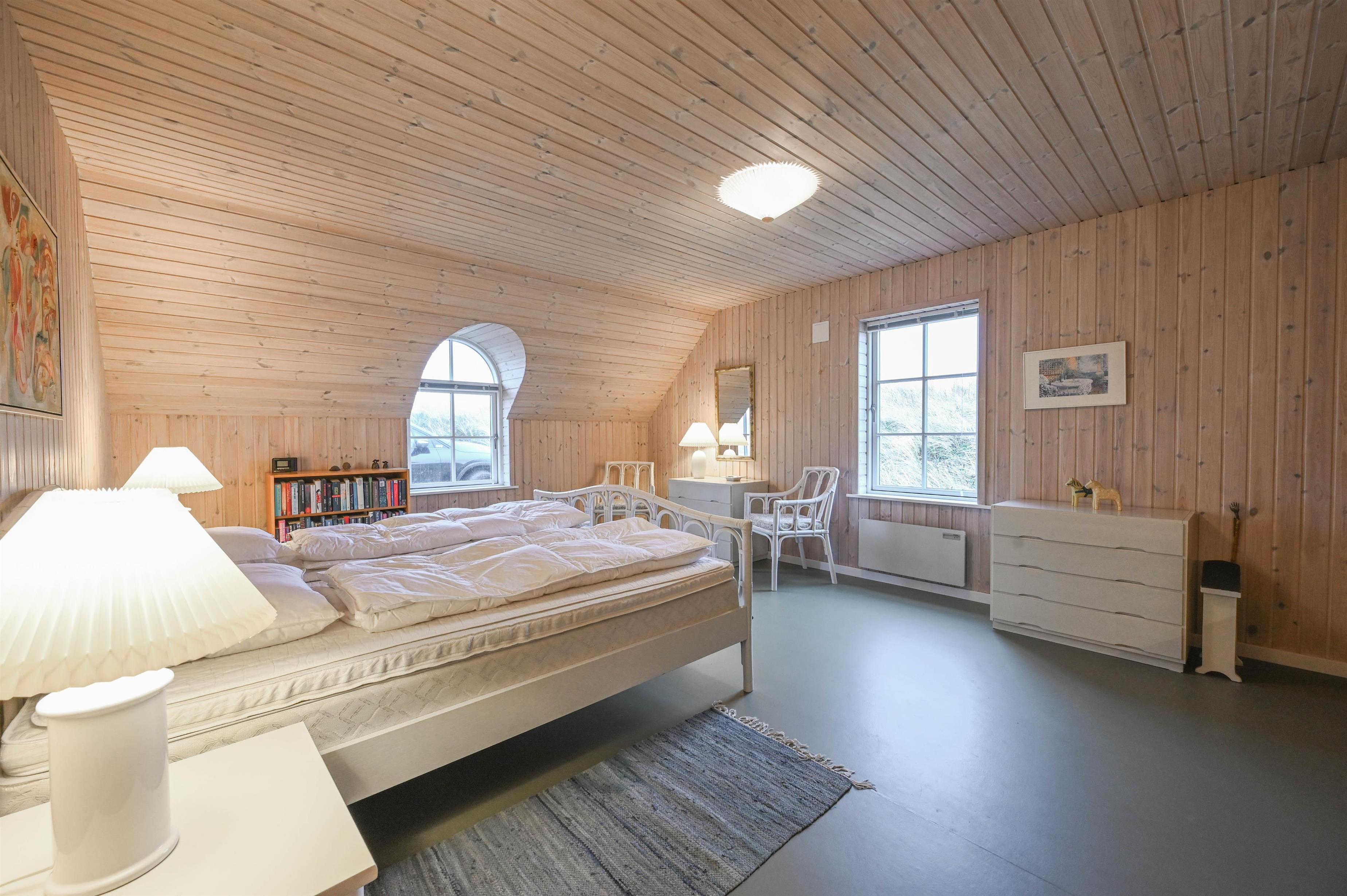 Stort soveværelse med dobbeltseng og udsigt over klitterne