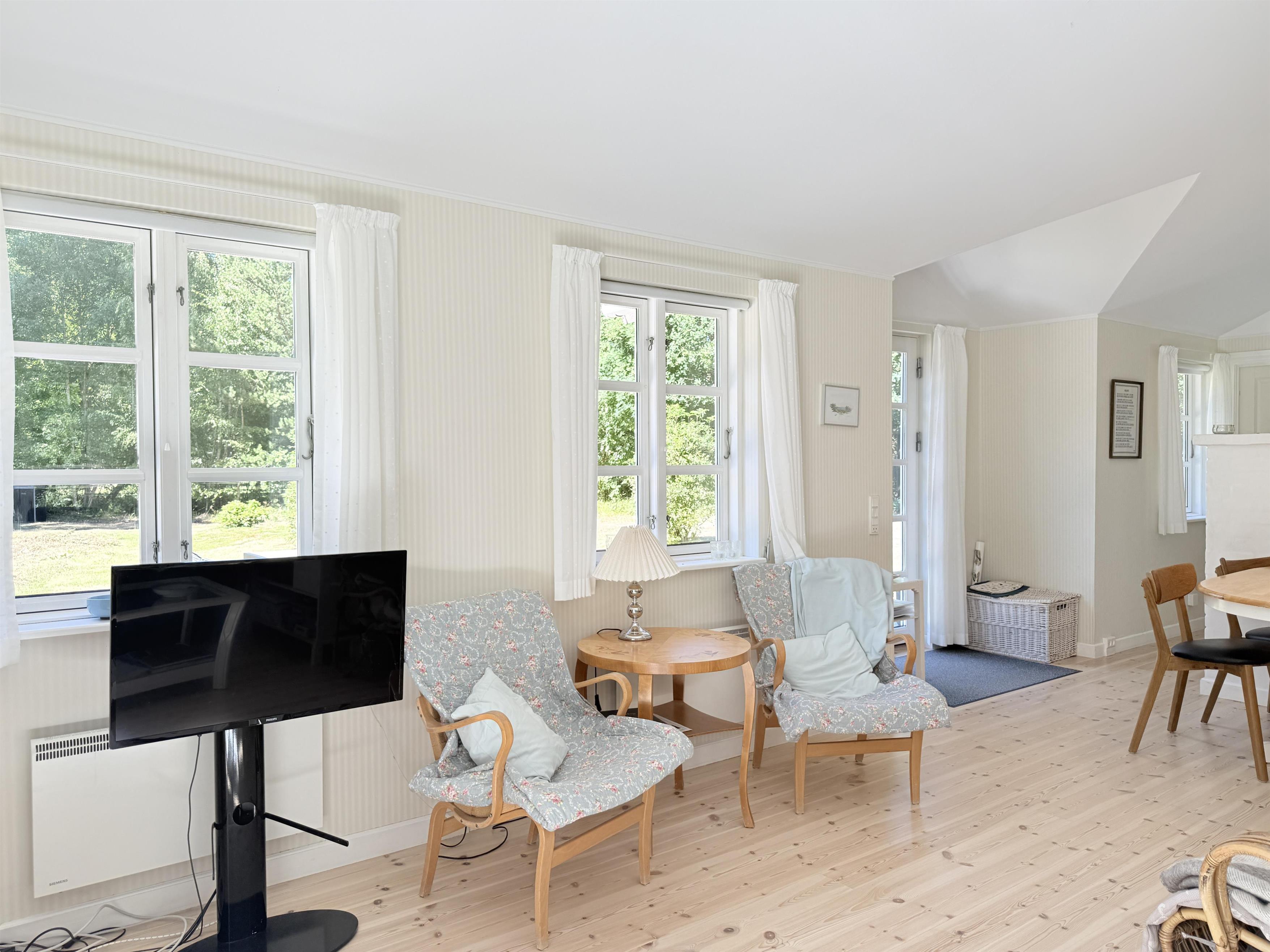 Et rigtig dejligt, lyst og lækkert sommerhus beliggende ved Kongestranden i Vesterø på en skøn naturgrund. Huset er praktisk og komfortabelt indrettet med et hyggeligt køkken/alrum/stue og to soveværelser med dobbeltsenge. Der er badeværelse med brus og vaskemaskine samt sauna. Husets TV har bl.a. DR, tysk tv samt chromecast til streaming. Huset er smagfuldt indrettet og med den helt rigtige sommerhusatmosfære.